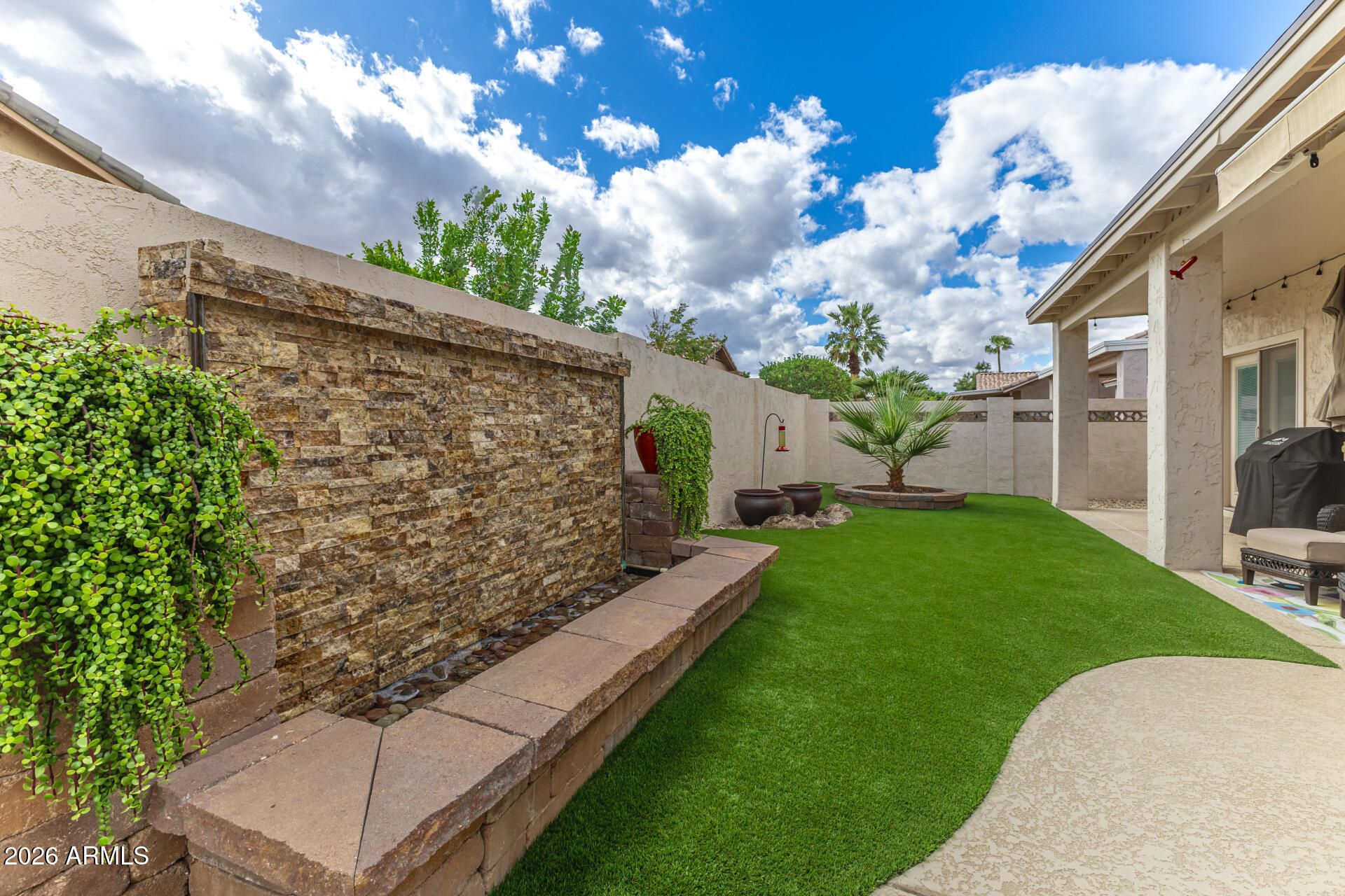 This 2-bedroom, 2 baths, den home with lots of upgrades is located in popular active 55+ gated community. Home features a custom metal and glass front door, inside the open concept Great room, to the left, den/exercise room to the right. Continue through to large dining area and gorgeous updated kitchen with breakfast bar and built in desk area with loads of cabinets. Out the double doors to the extended covered patio, gorgeous south facing backyard with stacked stone waterfall, retractable awning, artificial turf! Owner suite with 2 closets, double sinks, updated lighted mirror, walk in shower and water closet, attached TV, and double doors access the back patio. Second bath with walk in shower, large guest room. Laundry room with full size stackable washer/dryer, cabinets.
