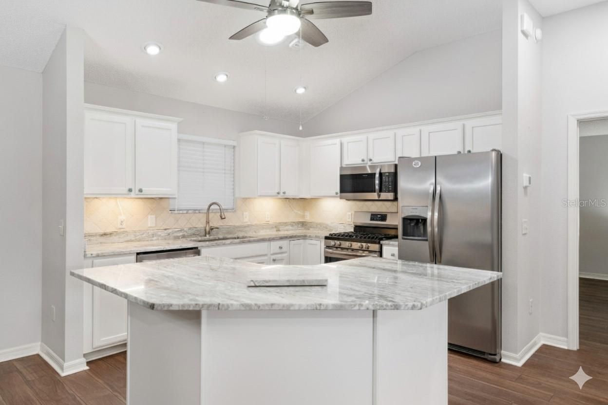 - Ceiling Fan(s), Kitchen/Family Room Combo, Main Level Primary, Stone Counters