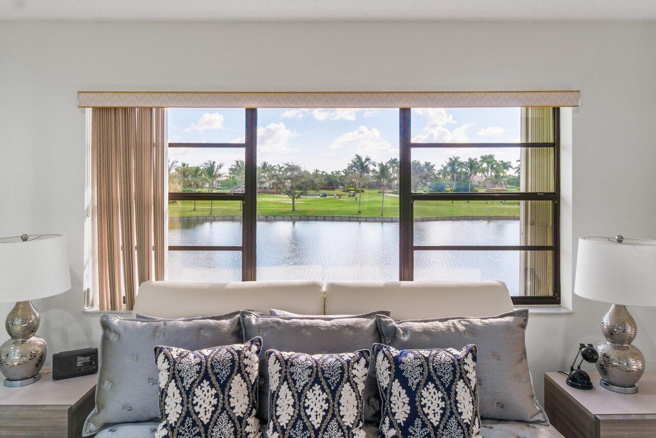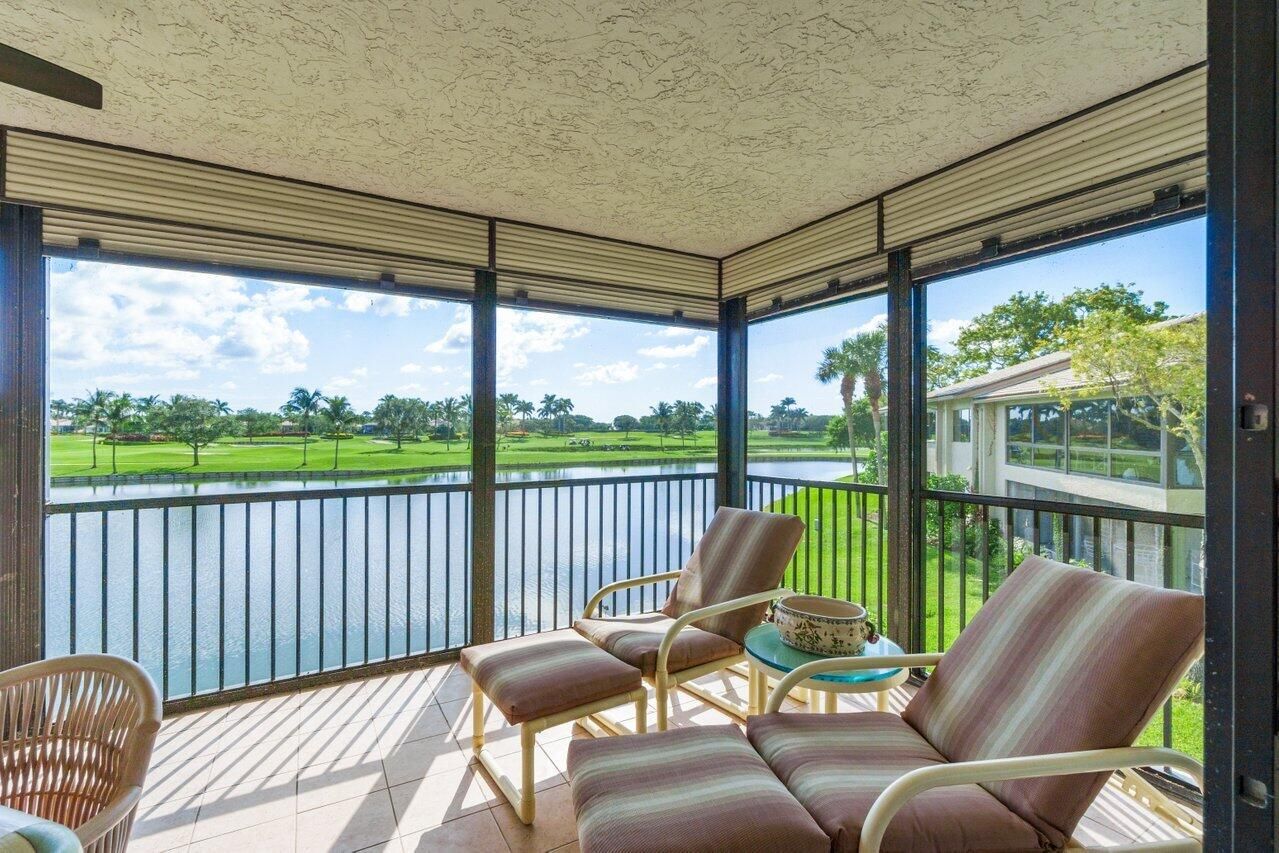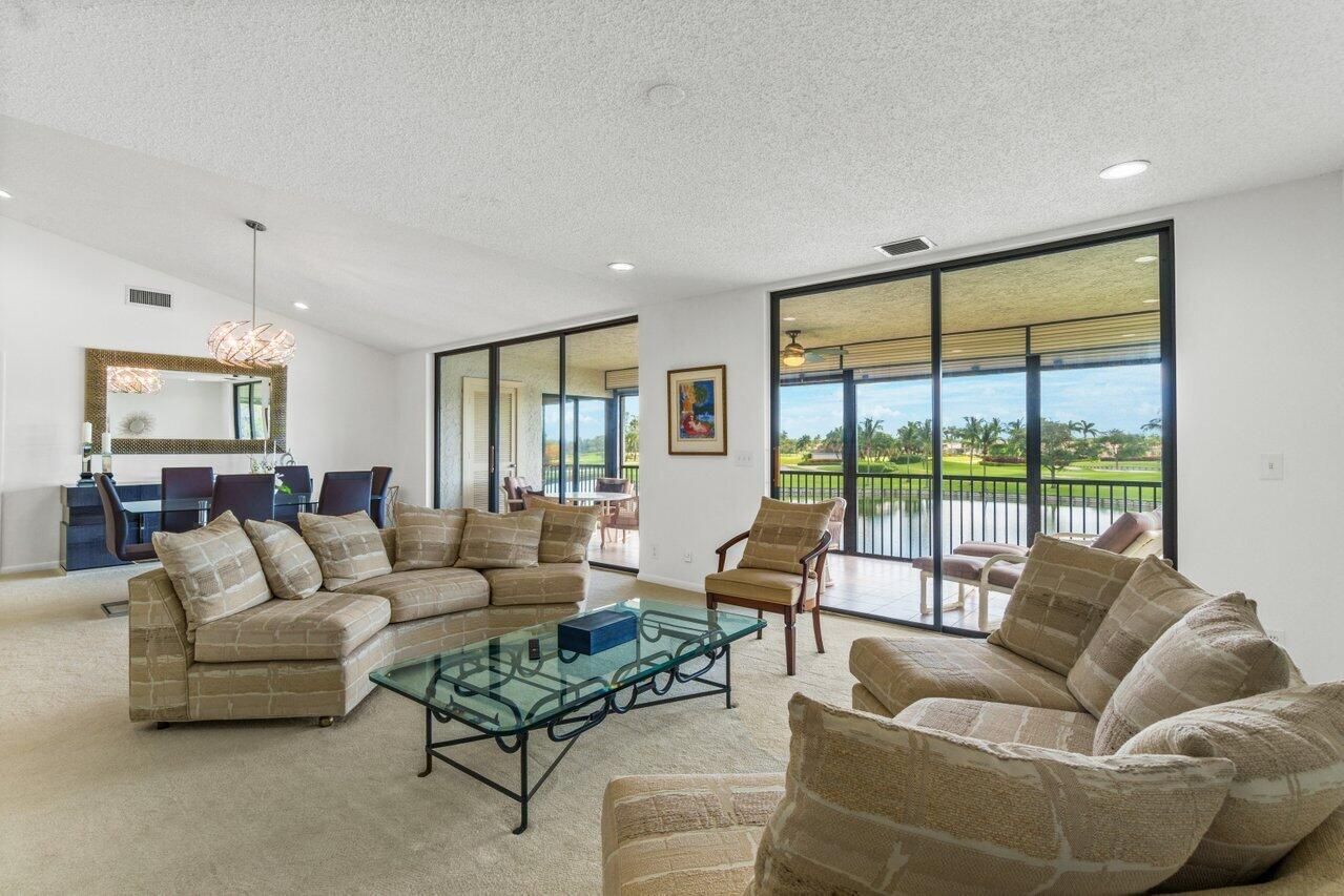 VIEWS, VIEWS, VIEWS! Wake up to sweeping lake and golf course vistas from this sun-filled condo with desirable East/West exposures. This FULLY FURNISHED AND TURNKEY convertible 3BR/2BA residence is ideally located on the 2nd floor with elevator access and showcases dramatic vaulted ceilings, a generous, spacious floor plan, and abundant natural light. The renovated kitchen features sleek modern cabinetry and a built-in wine fridge, while the updated guest bath adds a contemporary touch. Entertain with ease in the great room with a built-in bar, or step out to the impressive 27′ screened lanai--the perfect setting for al fresco gatherings overlooking shimmering water and lush fairways. Enhanced with custom lighting. An exceptional country club residence in a setting that truly elevates