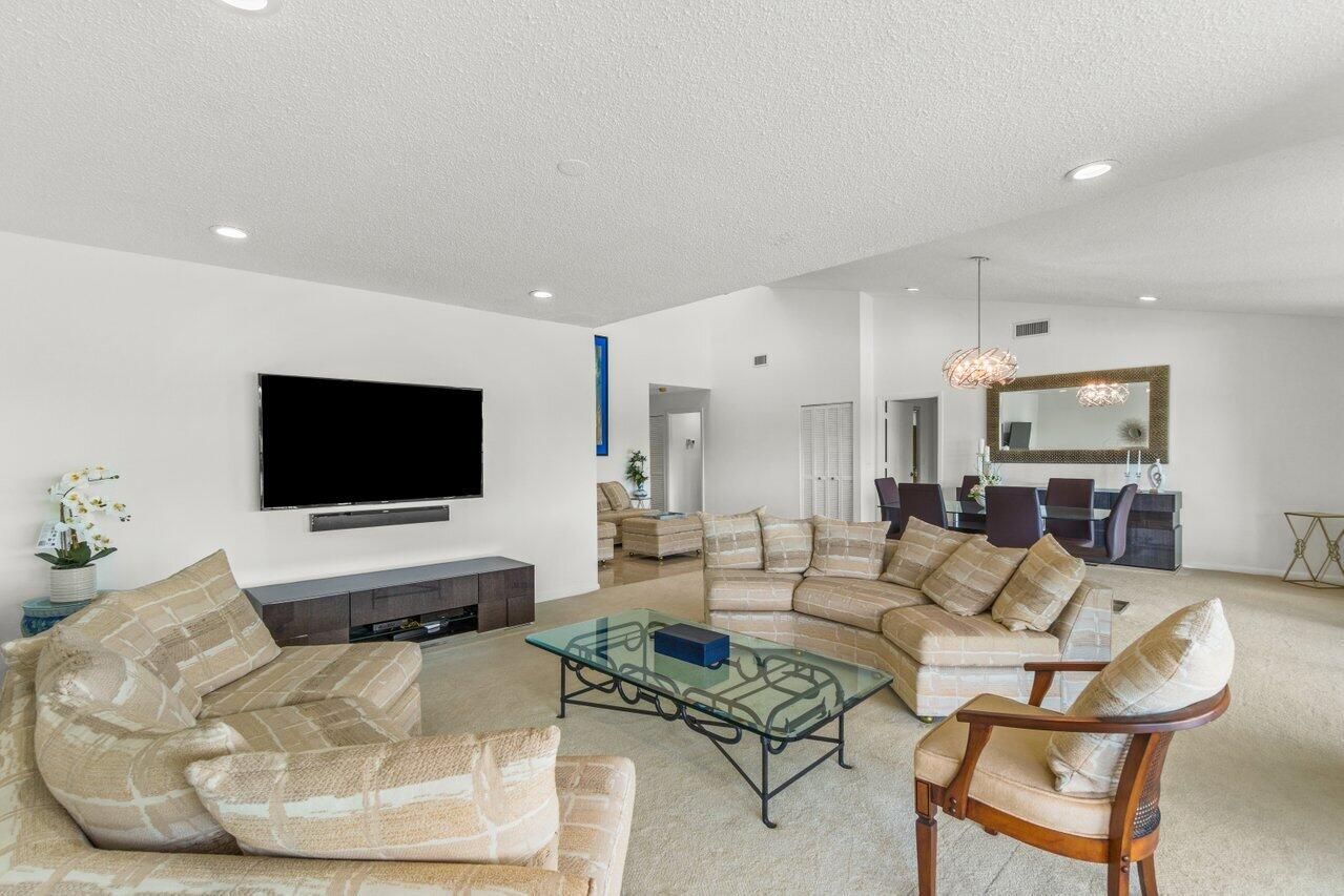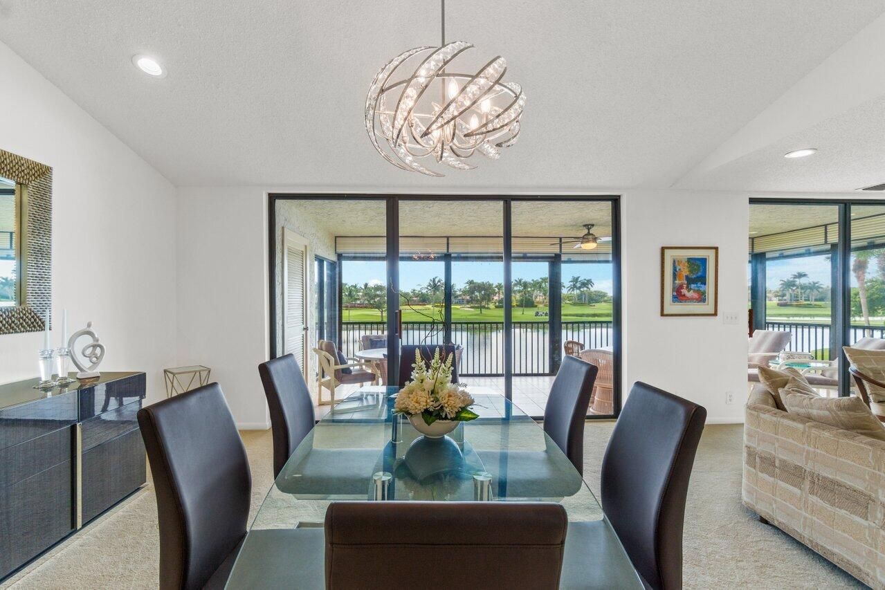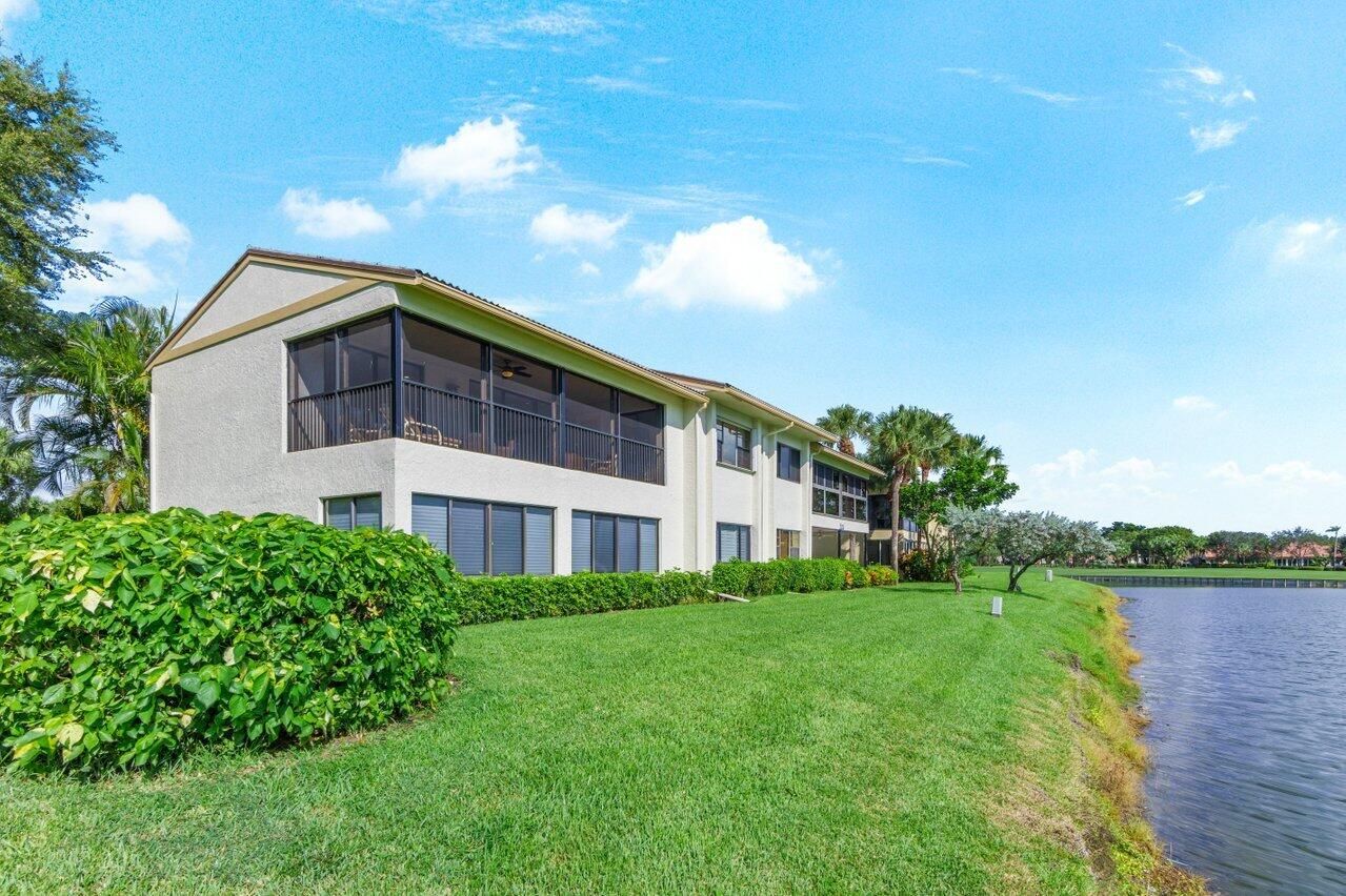 VIEWS, VIEWS, VIEWS! Wake up to sweeping lake and golf course vistas from this sun-filled condo with desirable East/West exposures. This FULLY FURNISHED AND TURNKEY convertible 3BR/2BA residence is ideally located on the 2nd floor with elevator access and showcases dramatic vaulted ceilings, a generous, spacious floor plan, and abundant natural light. The renovated kitchen features sleek modern cabinetry and a built-in wine fridge, while the updated guest bath adds a contemporary touch. Entertain with ease in the great room with a built-in bar, or step out to the impressive 27′ screened lanai--the perfect setting for al fresco gatherings overlooking shimmering water and lush fairways. Enhanced with custom lighting. An exceptional country club residence in a setting that truly elevates