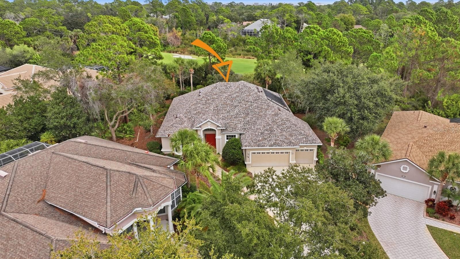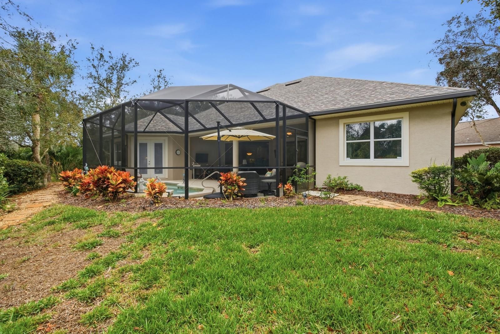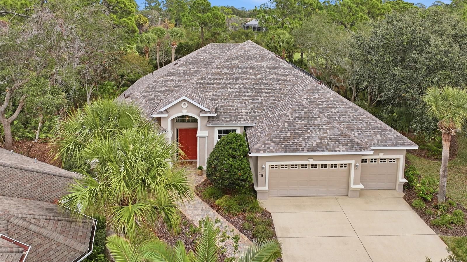 Beautifully maintained single-level home offering 4 bedrooms and 3 bathrooms, ideally situated at the end of a cul-de-sac. The open floor plan features 2,796 square feet of heated living space (3,859 total square feet) with 10-foot ceilings throughout. The home includes a 3-car garage with mounted ceiling storage and a built-in workbench. Enjoy seamless indoor-outdoor living with a covered, screened lanai and solar-heated pool overlooking the 5th hole of the Grand Haven Jack Nicklaus Signature Golf Course. Recent upgrades provide peace of mind and energy efficiency, including a new roof (04/2024, transferable warranty), solar panels (04/2024), A/C replacement (06/2023), hot water heater (01/2026), Rainbird irrigation timer/control panel (12/2025), and lanai screen (07/2019). This well-appointed residence combines comfort, functionality, and scenic golf course living all on one level.