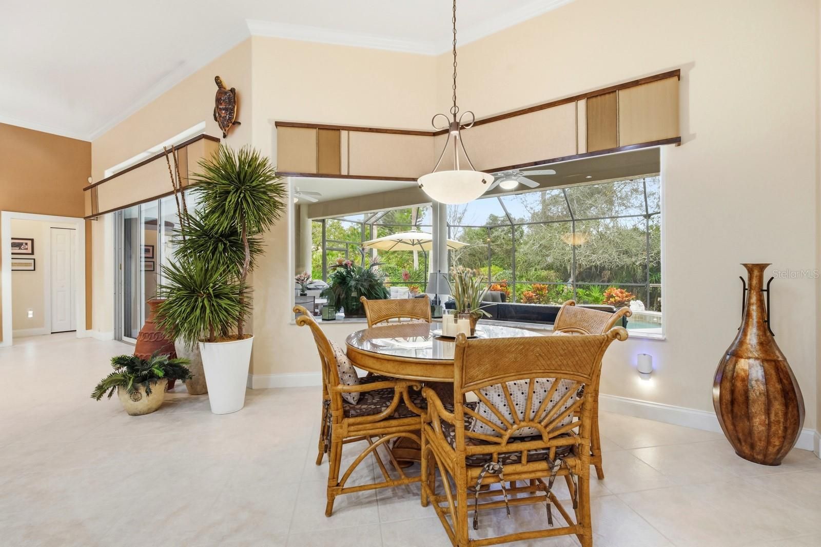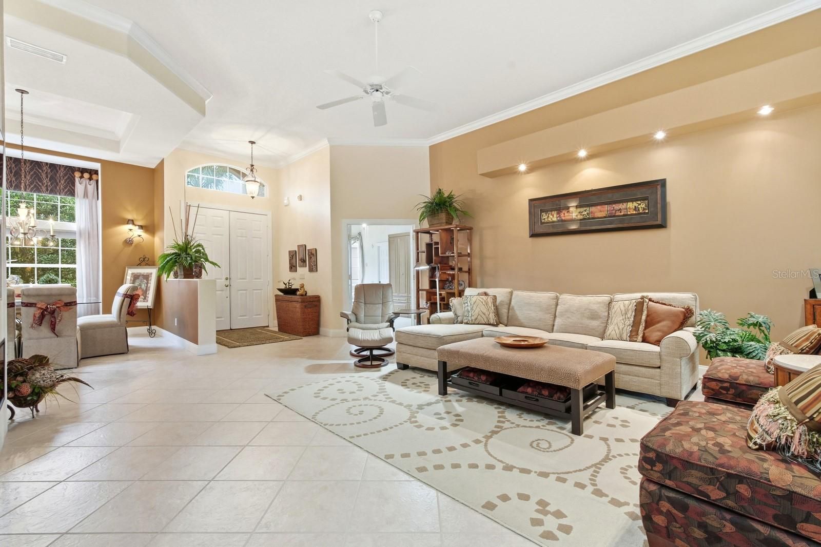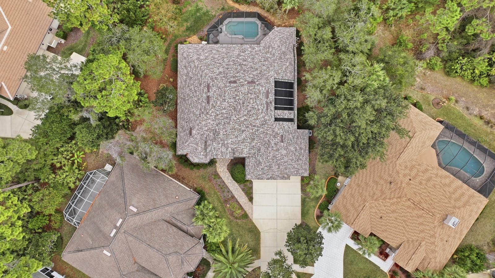 Beautifully maintained single-level home offering 4 bedrooms and 3 bathrooms, ideally situated at the end of a cul-de-sac. The open floor plan features 2,796 square feet of heated living space (3,859 total square feet) with 10-foot ceilings throughout. The home includes a 3-car garage with mounted ceiling storage and a built-in workbench. Enjoy seamless indoor-outdoor living with a covered, screened lanai and solar-heated pool overlooking the 5th hole of the Grand Haven Jack Nicklaus Signature Golf Course. Recent upgrades provide peace of mind and energy efficiency, including a new roof (04/2024, transferable warranty), solar panels (04/2024), A/C replacement (06/2023), hot water heater (01/2026), Rainbird irrigation timer/control panel (12/2025), and lanai screen (07/2019). This well-appointed residence combines comfort, functionality, and scenic golf course living all on one level.