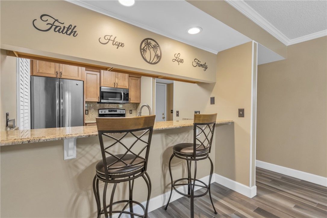 Bask in this FIRST FLOOR, unfurnished-END UNIT! Captivating kitchen boasting granite counters, backsplash, stainless steel appliances, soft-close cabinets & pantry! Buy as year round residence or have guaranteed place for season to escape cold winter months! Stunning Italian-like tile wood floors flow seamlessly throughout! BRAND NEW A/C! Upgraded w/ plantation shutters, hurricane shutters, crown molding, baseboards, vanities, fans & fixtures! Convenience of washer/dryer in-unit, covered parking & impact windows! STUNNING sunsets, lake & golf course views! Enjoy heated pools, clubhouse & more!