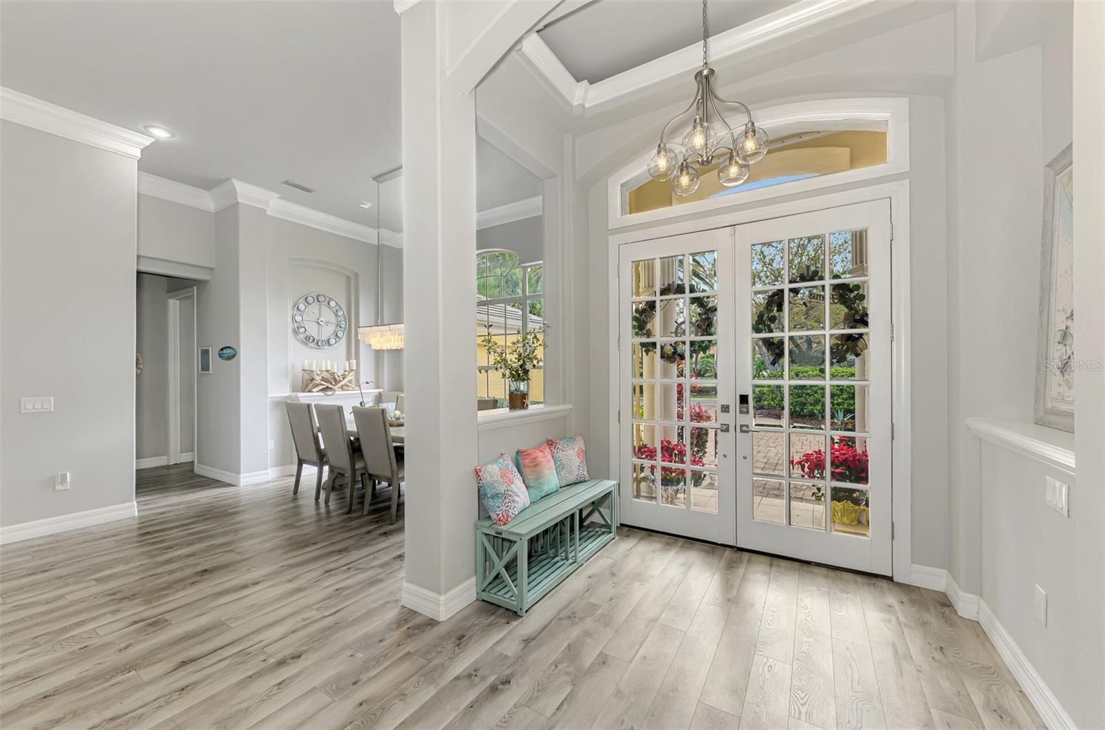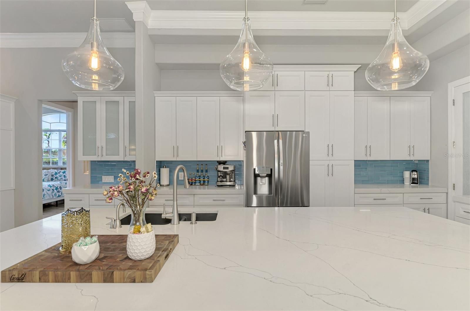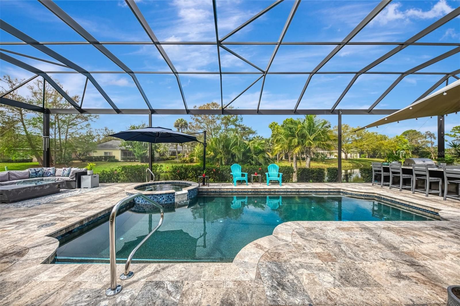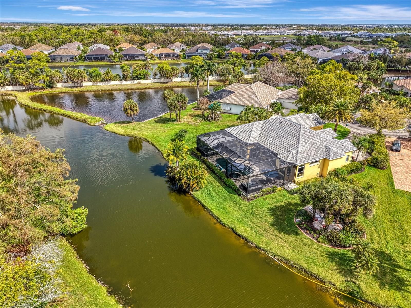 Welcome to this beautifully updated 3-bedroom, 2-bath home located in the highly desirable gated community of Boca Royale. Offering 2,819 square feet of living space and situated on a spacious half-acre lot with 211 feet of serene water frontage, this home combines luxury, comfort, and breathtaking views. Recent upgrades provide peace of mind and modern style, including a new tile roof (2024), new AC (2025), Storm Smart Screens throughout (2025), a new travertine lanai and panoramic view pool cage (2023), resurfaced pool and spa (2022), and an outdoor kitchen added in 2023. Inside, the home features new luxury plank vinyl flooring throughout, soaring ceilings, crown molding, ceiling fans, transom windows, and five sets of sliding glass doors that open to the expansive lanai and stunning water views. The updated chef’s kitchen is truly a standout with quartz countertops, glass hand painted backsplash, induction cooktop, built-in oven and microwave, built-in ice maker, baker’s lift for your stand mixer, and a large walk-in pantry. The breakfast nook features an aquarium window showcasing spectacular water views. The spacious family room and living room both offer sliding doors to the lanai and pool area, creating seamless indoor-outdoor living. The living room also includes built-in shelving and a dry bar with liquor dispenser and wine refrigerator, perfect for entertaining. A formal dining room with large sunlit windows, dedicated desk area for working from home, and a laundry room with abundant cabinetry and storage add convenience and functionality. The expansive primary suite highlighted by a wall of windows and a cozy built-in bench seat, creates the perfect nook for reading and relaxation, sliding doors to the pool and lanai, and two walk-in closets. The ensuite bath offers dual vanities, a relaxing soaking tub, and a separate shower. Two generous guest bedrooms provide comfort for family and visitors, with one offering direct access to the pool and lanai. Step outside to an entertainer’s dream featuring plenty of seating areas, a saltwater heated pool and spa recently resurfaced, and a beautiful outdoor kitchen with granite countertops. The expansive travertine lanai and panoramic pool cage create the perfect setting to relax or host gatherings while enjoying tranquil panoramic water views. The property also features a butterfly garden, fruit trees, and mature landscaping that enhance the peaceful Florida setting. Located in Boca Royale, a gated community with a 24-hour guard, this home offers an exceptional Florida lifestyle in a beautifully maintained neighborhood.