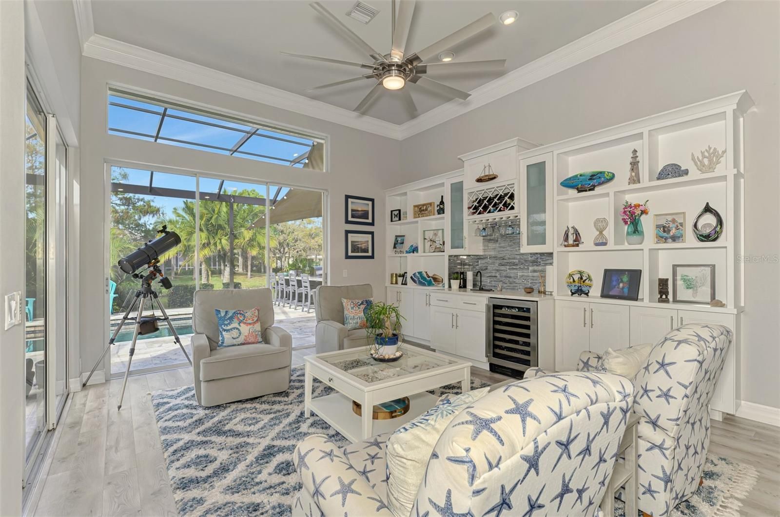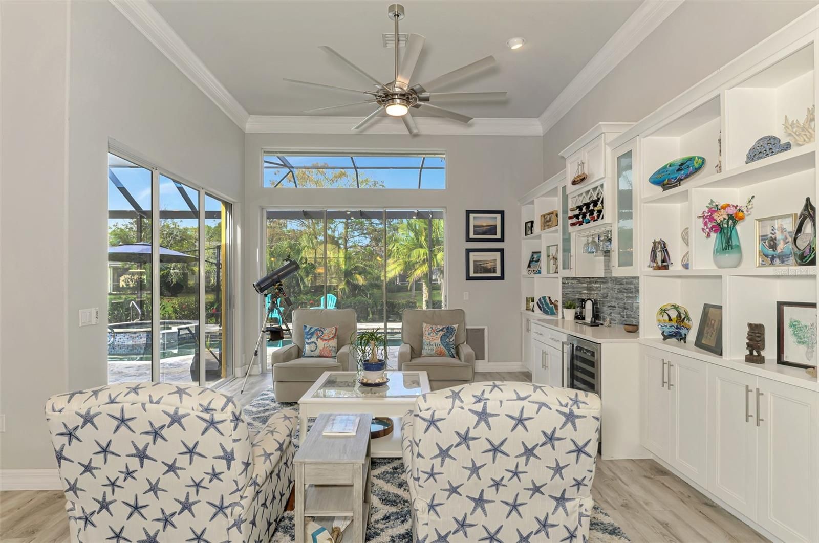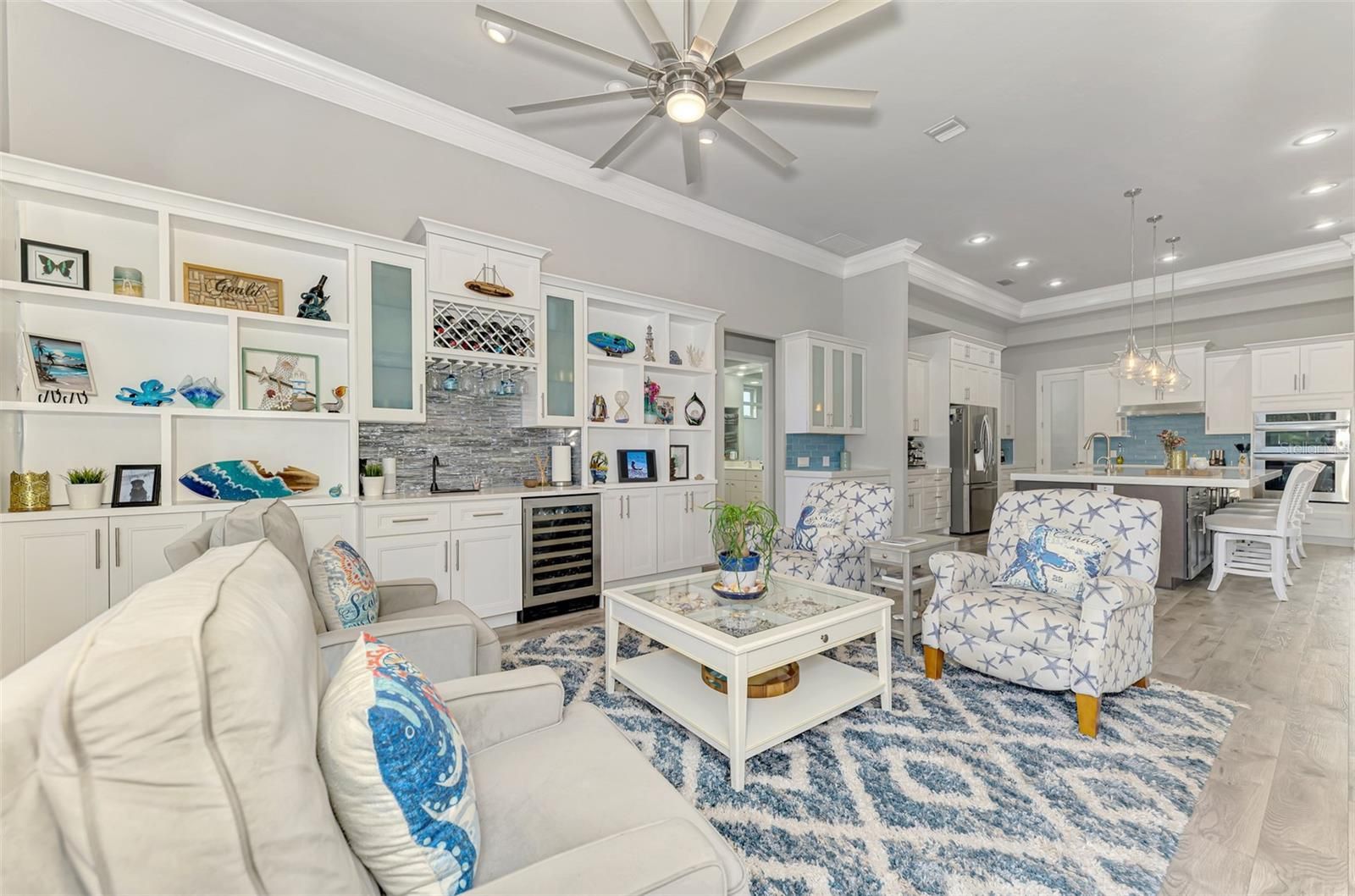 - Built-in Features, Ceiling Fan(s), Crown Molding, Dry Bar, High Ceilings, Kitchen/Family Room Combo, Open Floorplan, Solid-Wood Cabinets, Stone Counters, Tray Ceiling(s), Walk-In Closet(s), Window Treatments