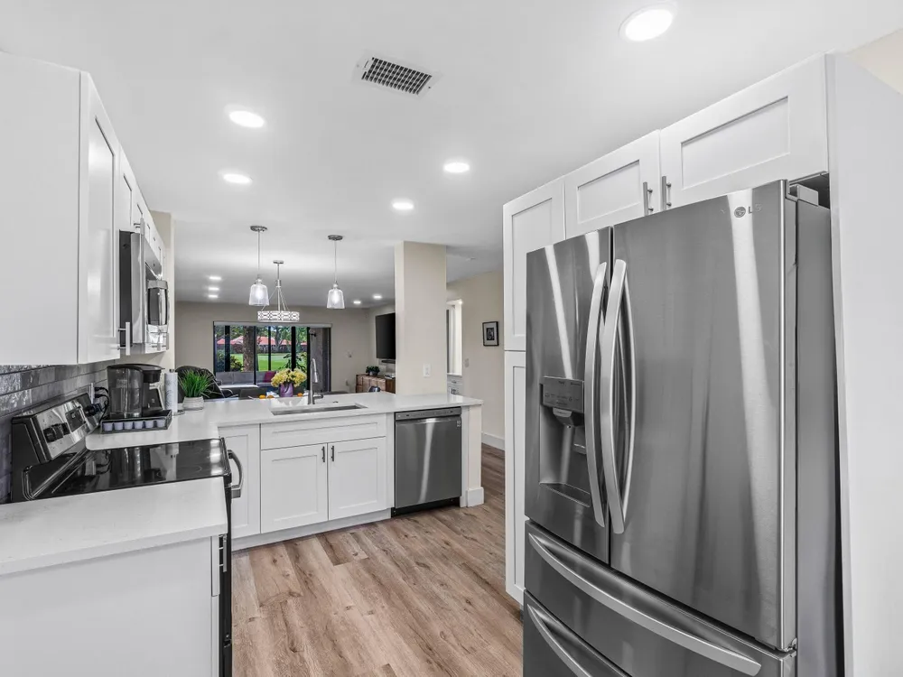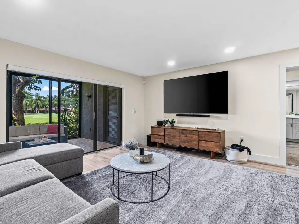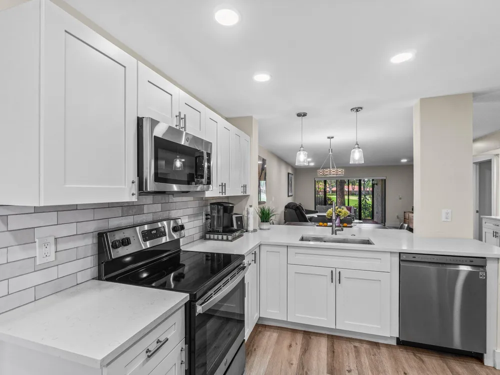 Lovely, fully renovated 1st floor 2BR/2BA condo with sweeping views of the golf course. Located in the prestigious Hunters Run Country Club. Designed in a fresh, modern palette with an open-concept layout. The open kitchen shines with white cabinetry, sleek quartz countertops, and a spacious breakfast bar. Other touches include crisp, modern bathrooms, custom LED lighting, luxury vinyl flooring, several closets including a custom walk-in, remote-controlled blinds, and a lanai with floor-to-ceiling sliders overlooking the fairway. Contemporary furnishings are available, offering a move-in-ready option. Space is available on the side of the building to add a golf cart pad with electric hook-up. Mandatory annual membership. Country club living awaits!
