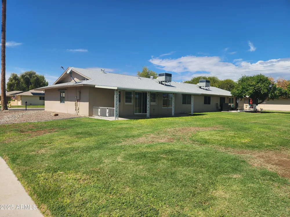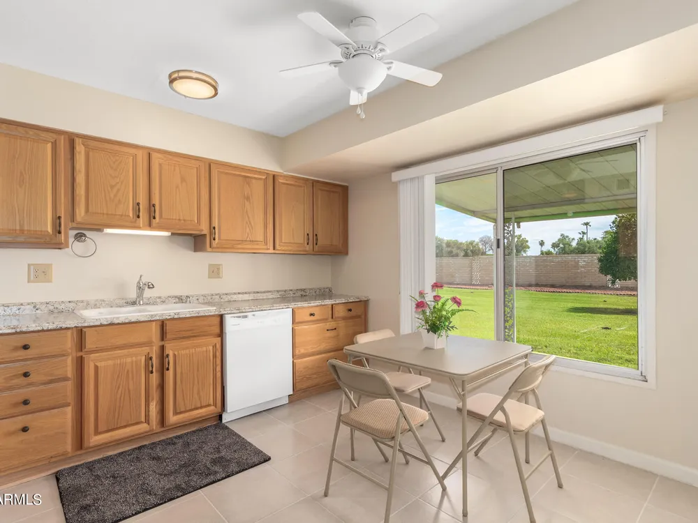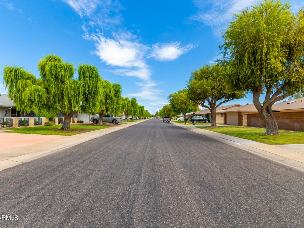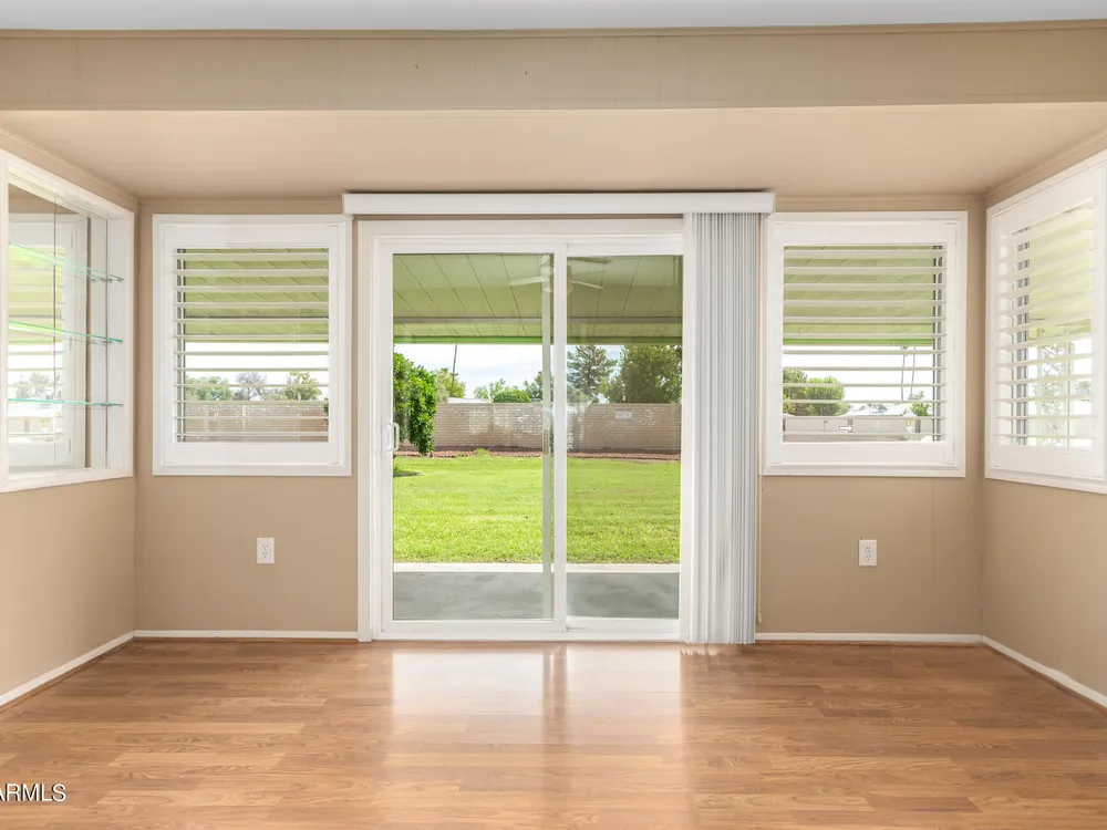 Great Opportunity! New Price Enhancement 8.23.25 - Priced to Sell.. Desirable, original Sun City location is North of Bell Rd. Great open floor plan also offers a bonus room. Recent improvements including carpet in bedrooms (6.25) tile & laminate wood flooring, kitchen countertops, & Corian counters in both bathrooms. Other amenities include Plantation shutters plus window replacements. Kitchen is practical w/ many cabinets, two sections of countertop, a pantry, and eat in dining nook overlooking greenbelt. Both master bedroom and secondary bathrooms have recent upgrades of corian countertops. Both bedrooms offer walk in closets and large windows. Bonus room off kitchen and great room could be formal dining, office, or hobby room. Inside laundry room has plenty of room for storage cabinets. Skylights plus five ceiling fans. Enclosed Bonus / Sun room offers sliding glass arcadia door to an extended covered patio. Privacy in front, on side and rear of home. Mostly blocked fencing in back yard. Marinetta Recreation Center is just one half mile away. Golf community and attractive surrounding area with mature landscaping. Easy show and a well worth opportunity.