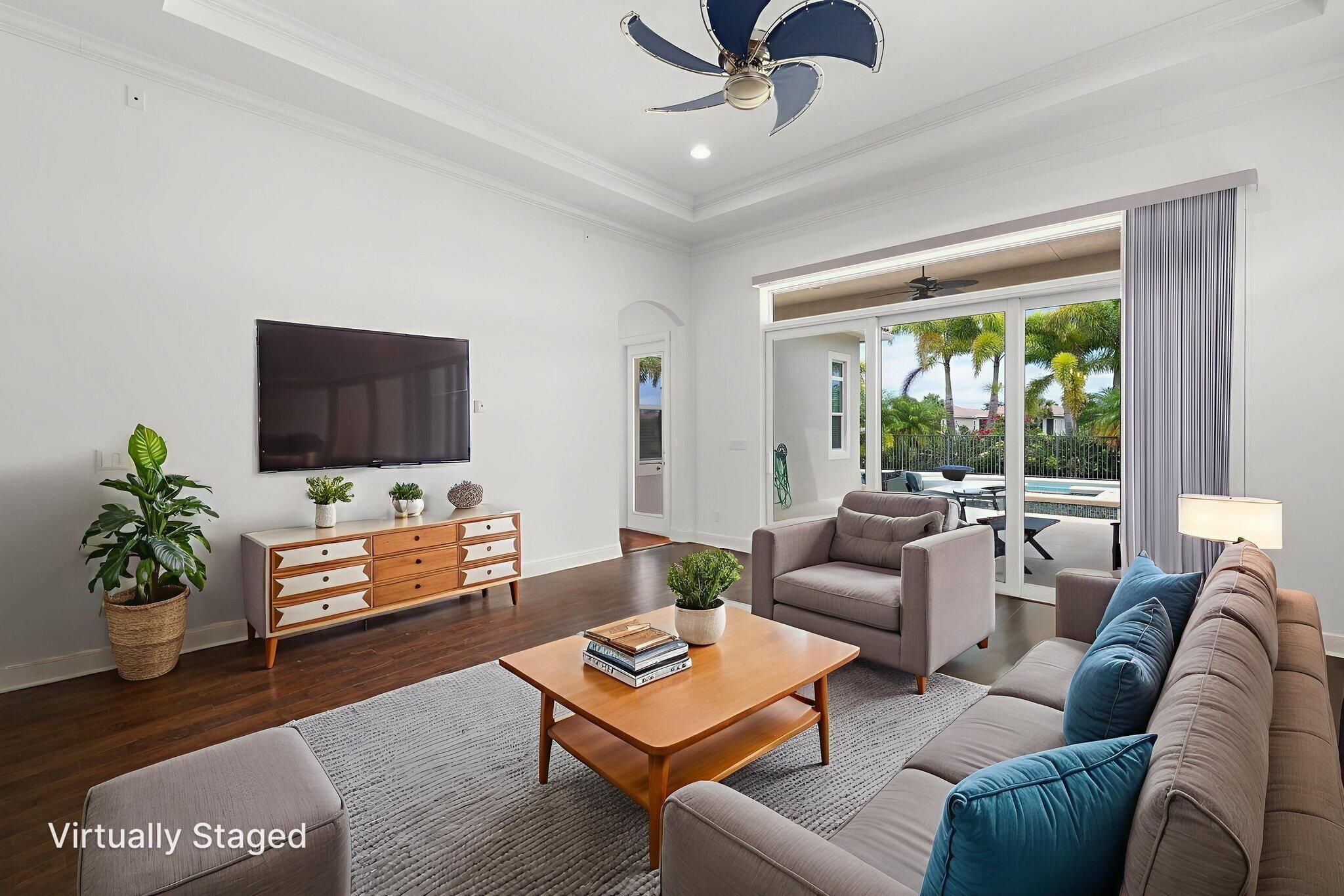 Sit back, relax, put your feet up and enjoy the sunset every evening overlooking your gorgeous pool and the sparkling lake view in PGA Verano, one of the most sought after and amenity rich communities, on the Treasure Coast. From the soaring ceilings with crown molding to the elegant fire bowls by the pool, not one detail has been overlooked. This move in ready and well appointed home features a pool with a hot tub and a sun shelf, a welcoming front porch, impact windows, gorgeous island kitchen and more. This open concept home was lovingly thought out & designed to entertain your friends and family for years to come. 2 easily possible 3 bedrooms. Fresh paint in living areas. Bonus: solar panels will be paid off at closing, so your will have minimal electric bills! Below Market Price!