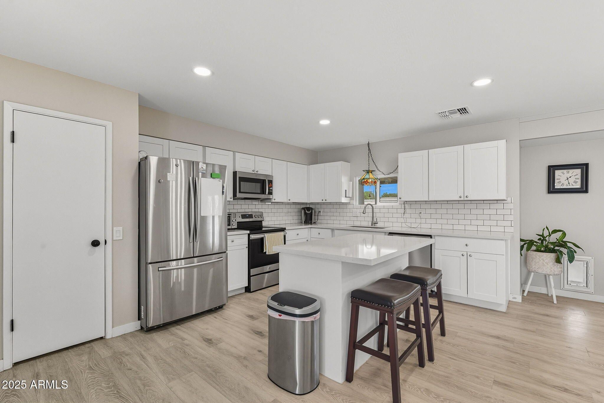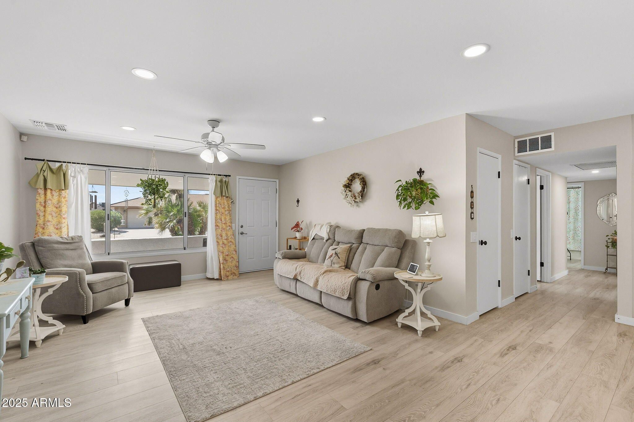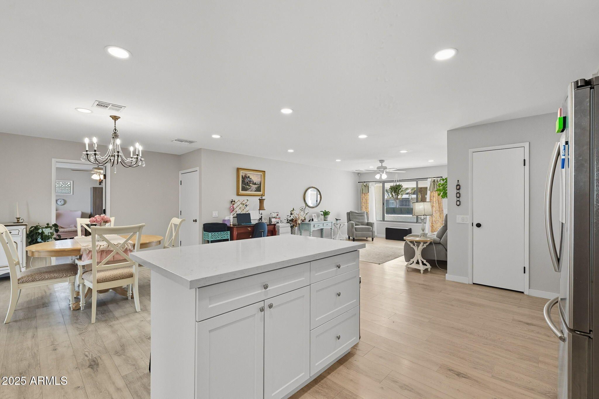 This beautifully updated Sun City West home combines style, comfort, and convenience. Offering 3 bedrooms, 2 bathroom, the home features an open floor plan with abundant natural light, dual pane windows, and neutral finishes throughout. The kitchen showcases crisp white cabinetry, quartz countertops, stainless steel appliances, and a center island for gathering. Both bathrooms have been refreshed, and the primary suite includes a walk-in closet. An oversized laundry room with sink and storage, plus a 2-car garage with cabinets and golf cart parking, add everyday functionality. Step outside through French doors to a screened-in patio overlooking a spacious, low-maintenance backyard. With a newer roof and A/C already in place, this move-in ready home is located in the heart of Sun City West, close to golf, recreation centers, pools, and endless community amenities.