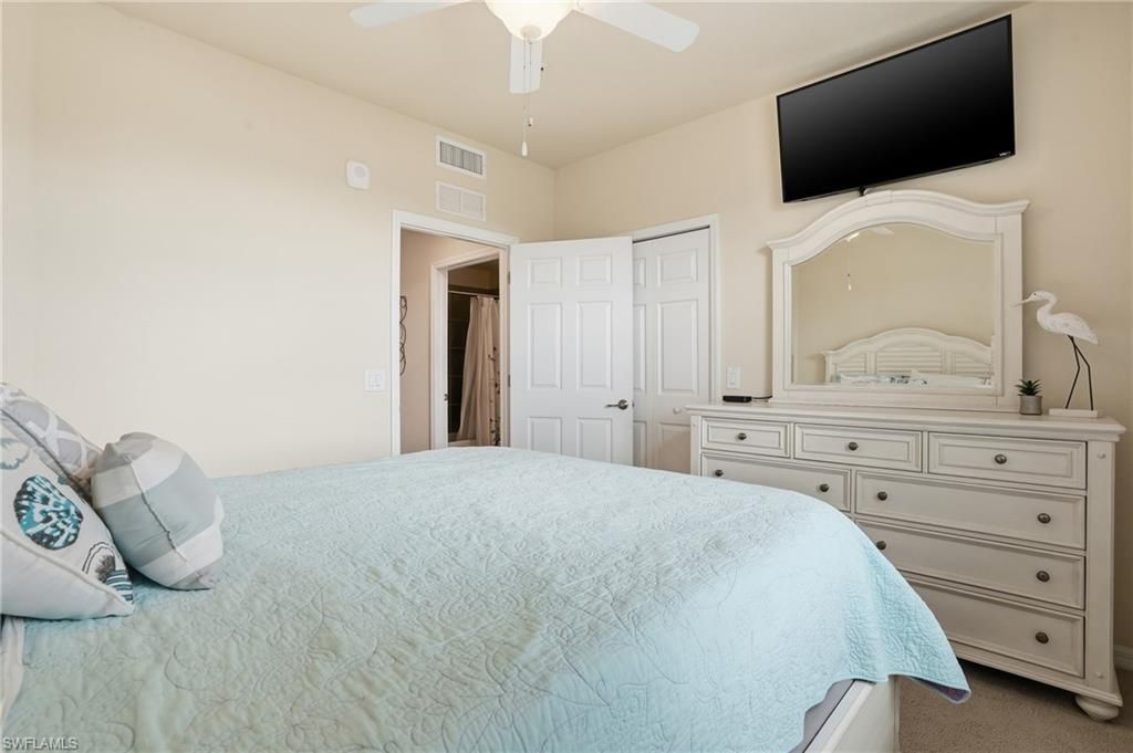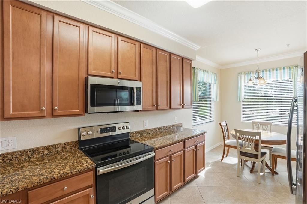 This rarely available second-floor end unit in Bonita National Golf & Country Club delivers a refined coastal lifestyle paired with breathtaking views of the golf course, the community’s widest and most expansive lake, and the neighborhood pool. Turnkey furnished and meticulously maintained, the residence offers 2 bedrooms plus a den, 2 bathrooms, and nearly 1,300 square feet of light-filled living space. Diagonally laid tile and elegant crown molding enhance the main living areas, while the bedrooms feature plush carpeting. The generously sized kitchen is beautifully finished with granite countertops, stainless steel appliances, a breakfast bar, and a sunny breakfast nook, creating an inviting space for everyday living. Impact windows provide peace of mind, and in-residence laundry adds ease to daily routines. Step onto the screened balcony and take in the serene water and golf course vistas—an ideal spot to unwind and enjoy Southwest Florida’s tranquil ambiance. Bonita National is a gated, bundled golf community anchored by a Gordon Lewis–designed 18-hole championship golf course and an exceptional suite of resort-style amenities. Residents enjoy access to a full-service spa and salon, attended fitness center, clubhouse with dining, tennis courts, bocce, lap and resort pools, putting green, sauna, library, and more. Low-maintenance living includes cable, internet, water, sewer, and additional services, allowing more time to enjoy the lifestyle. Located just five miles east of I-75 on Bonita Beach Road, this sought-after community places the best of Bonita Springs, Naples, and Fort Myers within easy reach.
