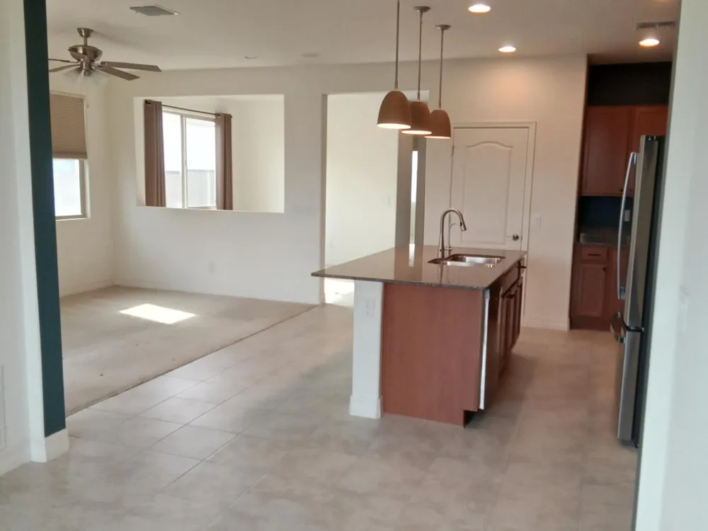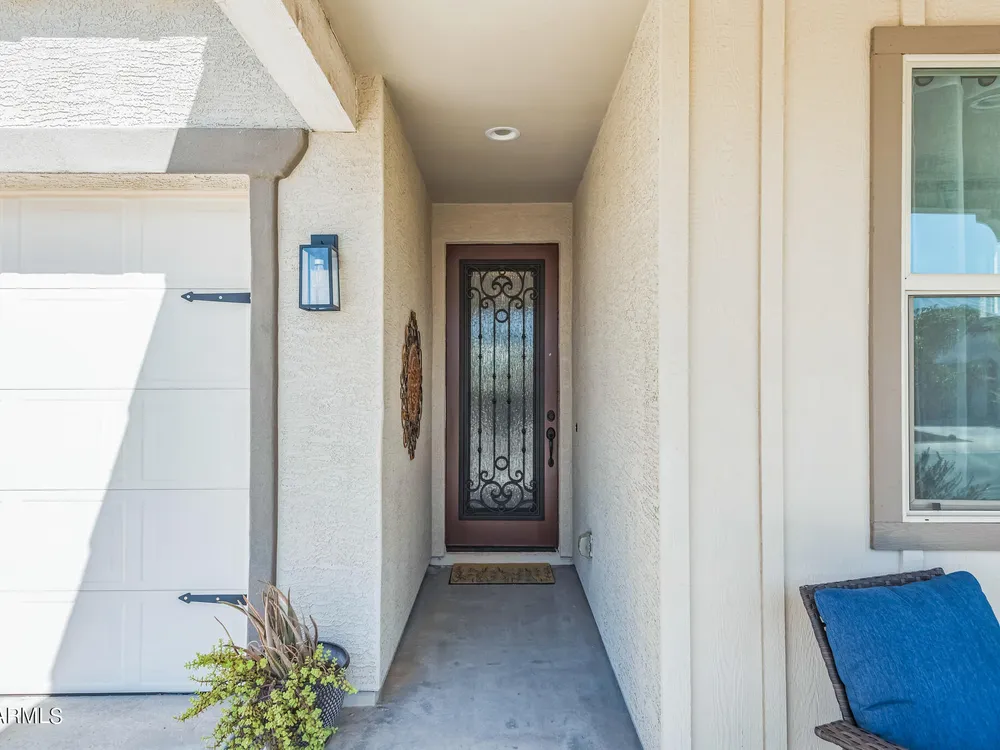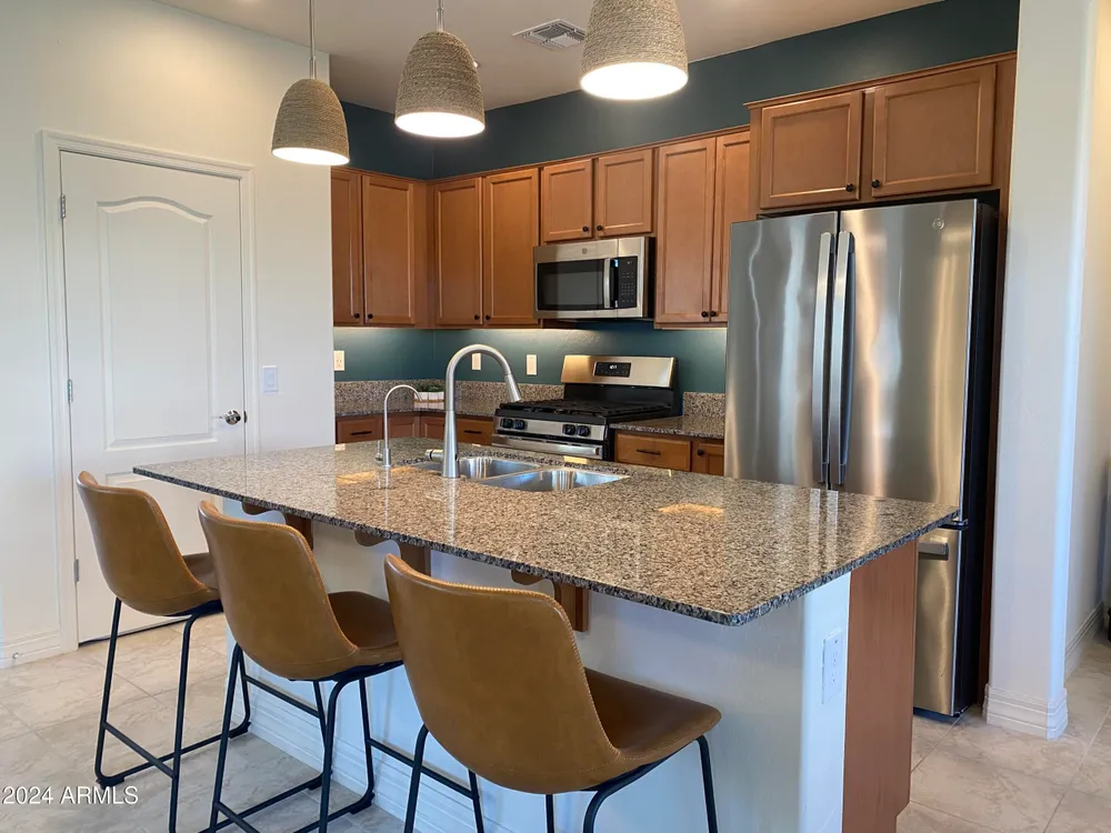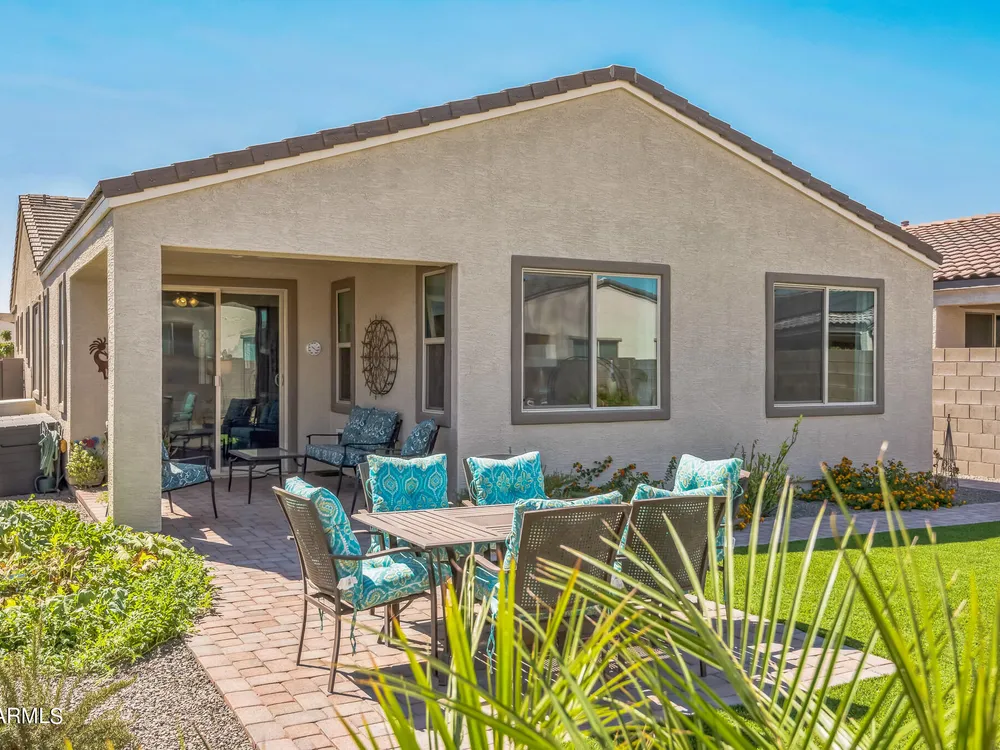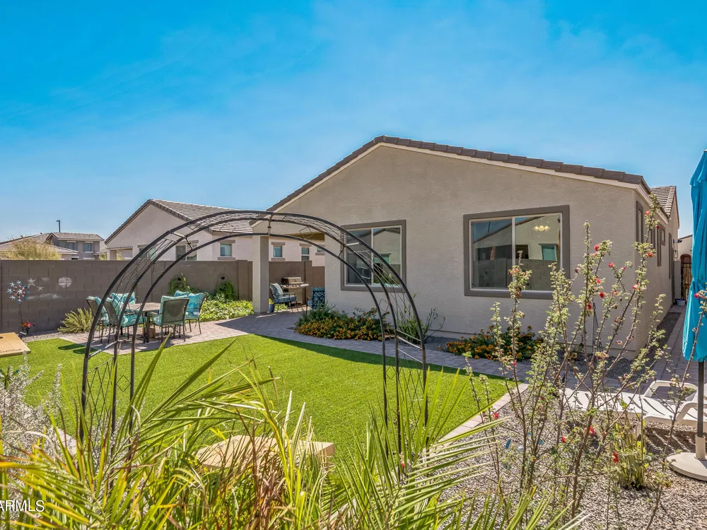 Move in Ready! 2 bedrooms and 2 full bathrooms with a split floor plan. The front door provides an opening glass panel with screen. The kitchen boasts a large island with beautiful granite countertops, soft close cabinets, pendant lighting, stainless steel appliances, and a walk-in pantry. It also includes under-cabinet LED lighting, and a filtered water system. The home is equipped with a water softener, gas heating, a tankless water heater, and a gas stove/oven. Ceiling fans are installed in the family room and bedrooms, while the great room, master bedroom, and outdoor patio have surround sound. The spacious laundry room connects to the master closet and is plumbed for a sink. The backyard features an extended paver patio and a sizable turf area, with a north/south orientation that provides shade in the afternoon. CantaMia 55+ offers resort-style amenities, including heated indoor and outdoor pools with spas, tennis and pickleball courts, a café, a bar, a gym, hiking and biking trails, a demo kitchen, an art studio, and even a dog park.