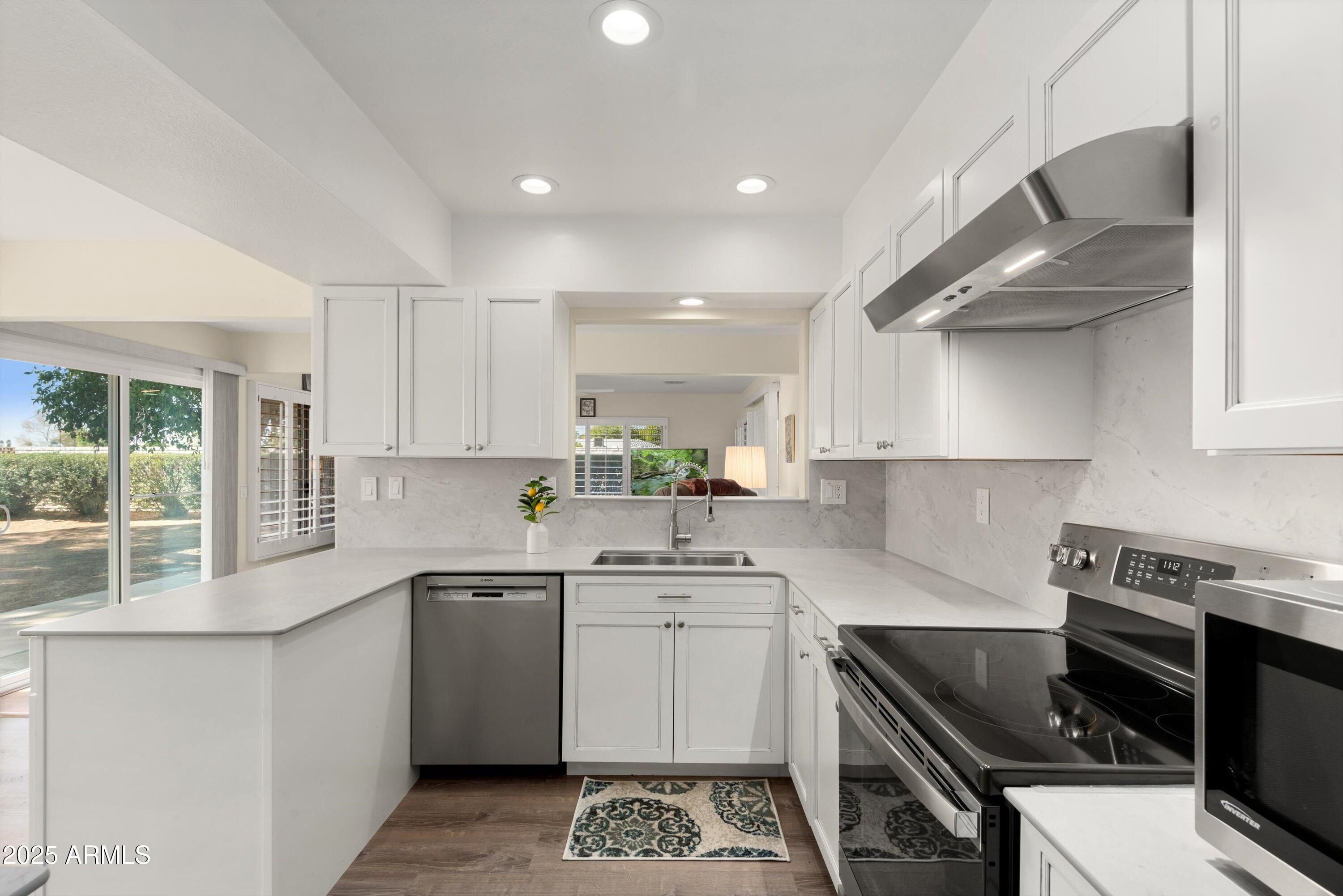 This beautifully renovated Gemini Twin home truly has it all—nearly every detail has been updated inside and out. Bright and open, the layout includes a spacious living room, a formal dining area with skylight, and an Arizona room with plantation shutters, perfect for relaxing or entertaining. The remodeled kitchen shines with new cabinets, peninsula with added storage, modern countertops, stainless steel sink, Bosch dishwasher, and GE range. Flooring has been replaced throughout, ceilings refinished, and fresh paint gives the home a crisp, modern feel. The primary suite offers a walk-in closet, while the guest bedroom also includes a walk-in closet. With upgrades to the roof (2021), electrical panel (2022), insulation, lighting, fans, blinds, security features, and water heater Additional updates include rain gutters, security sliding doors, garage epoxy flooring and cabinets, expanded closets, laundry room cabinetry, and fresh exterior paint (2023). Move-in ready with thoughtful upgrades from top to bottomdon't miss this gem!