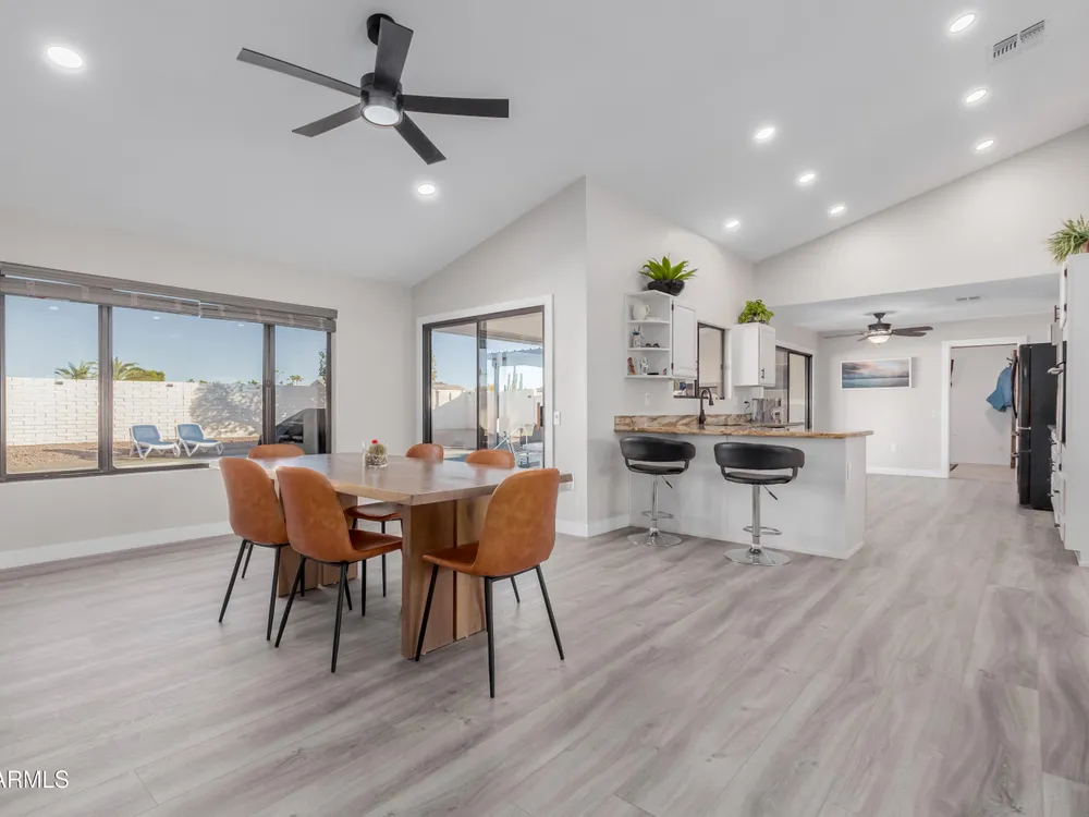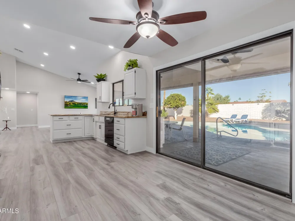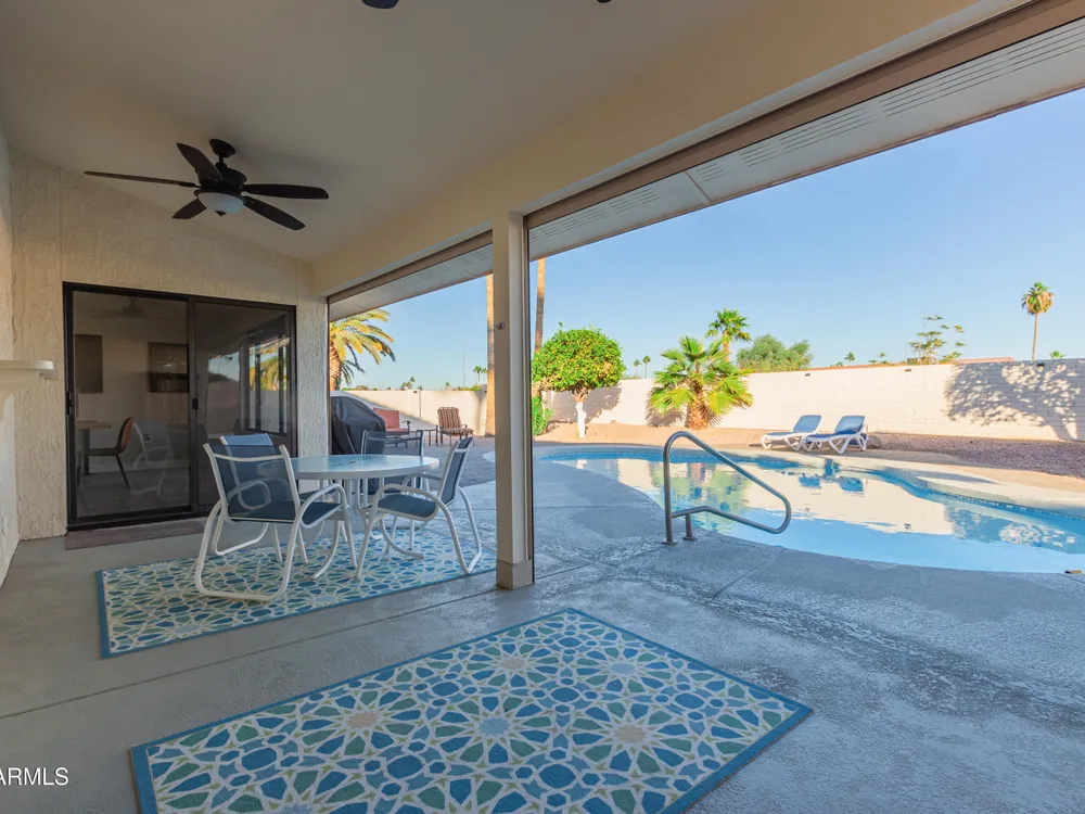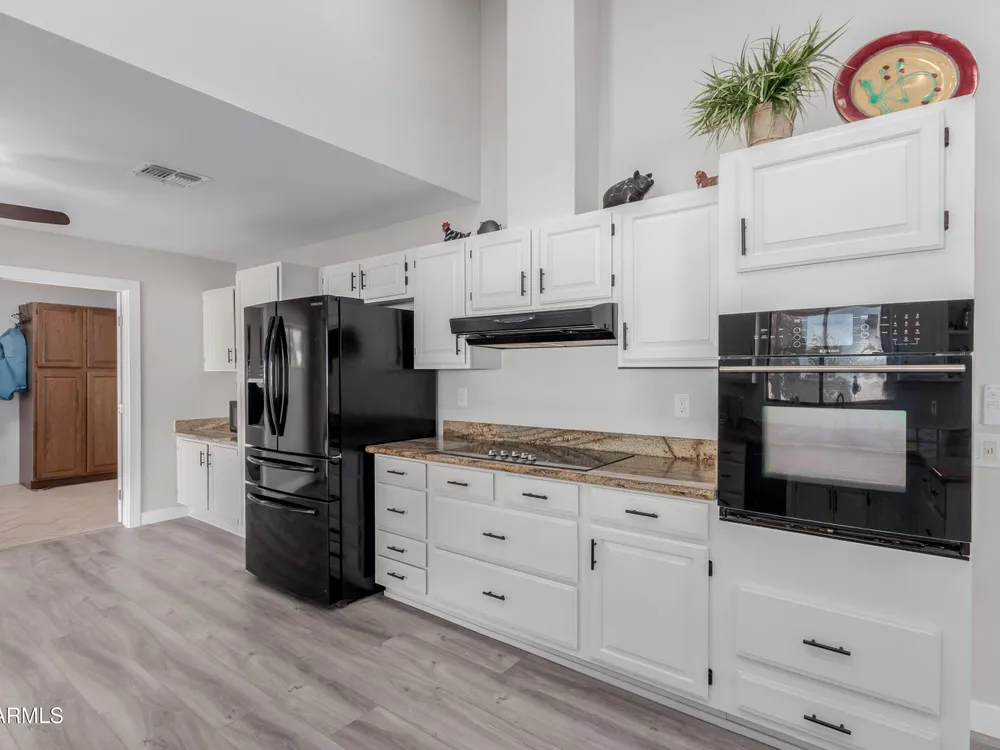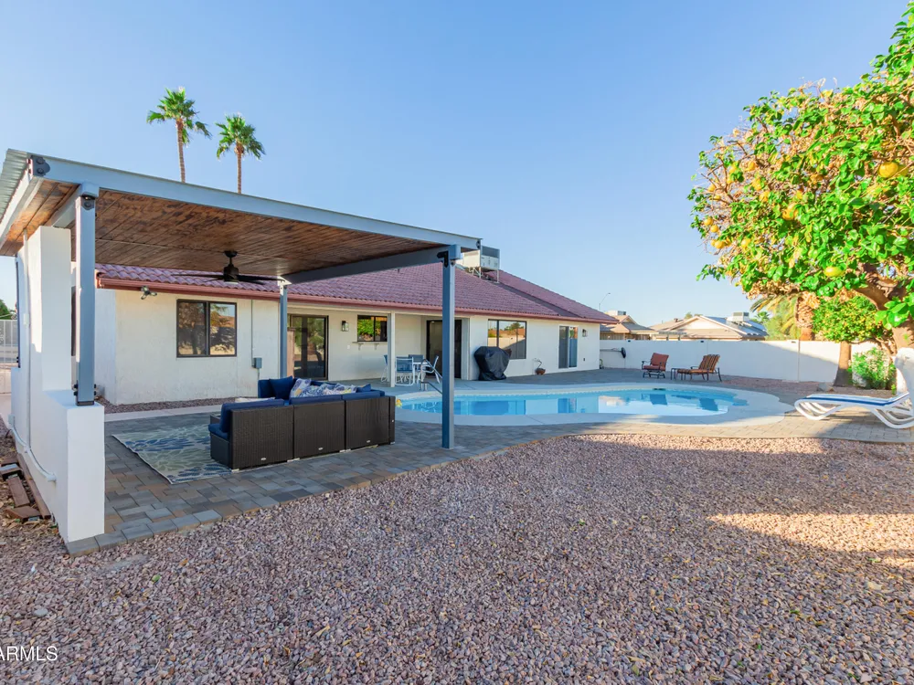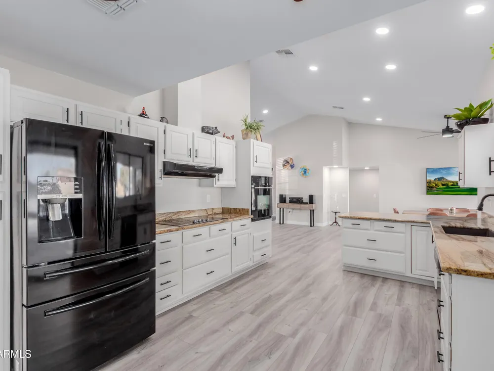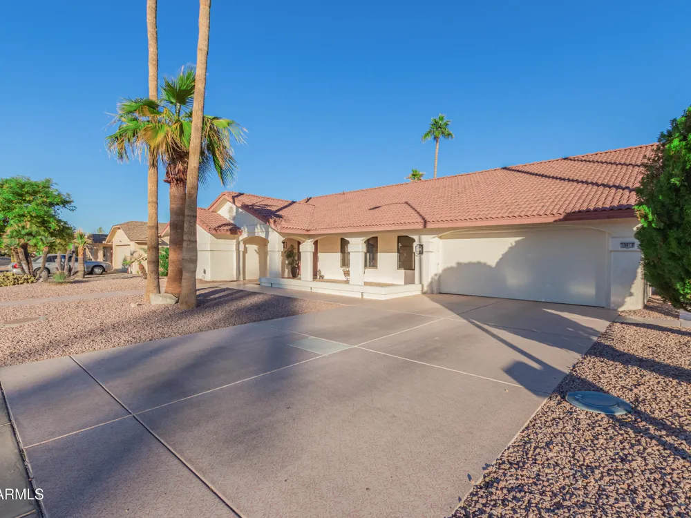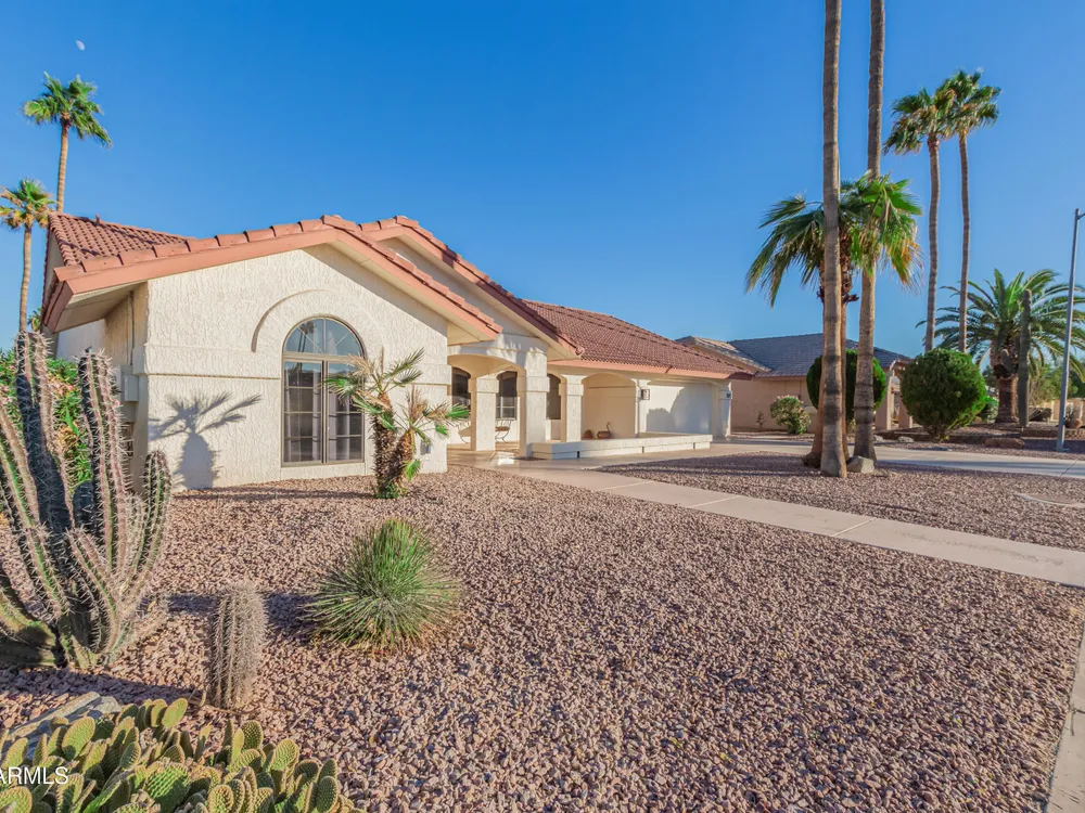 Welcome to this gorgeous 2-bedroom home in Sun City West! Enjoy your morning coffee on the cozy front porch. Come inside to see an open layout with vaulted ceilings that add to the airy feel, wood-style floors, and thick baseboards. The eat-in kitchen features granite counters, backyard access, built-in appliances, white cabinets, and a breakfast bar for casual meals. Retreat to the main suite, offering sliding doors to the backyard and a lavish bathroom. A dual sink vanity, glass enclosure, rain shower, and walk-in closet complete the main bathroom. The cabinetry in the laundry room and garage adds extra storage space! Discover a large backyard boasting fragrant citrus trees, a covered patio, a Ramada, and a sparkling blue pool. You don't want to miss it!