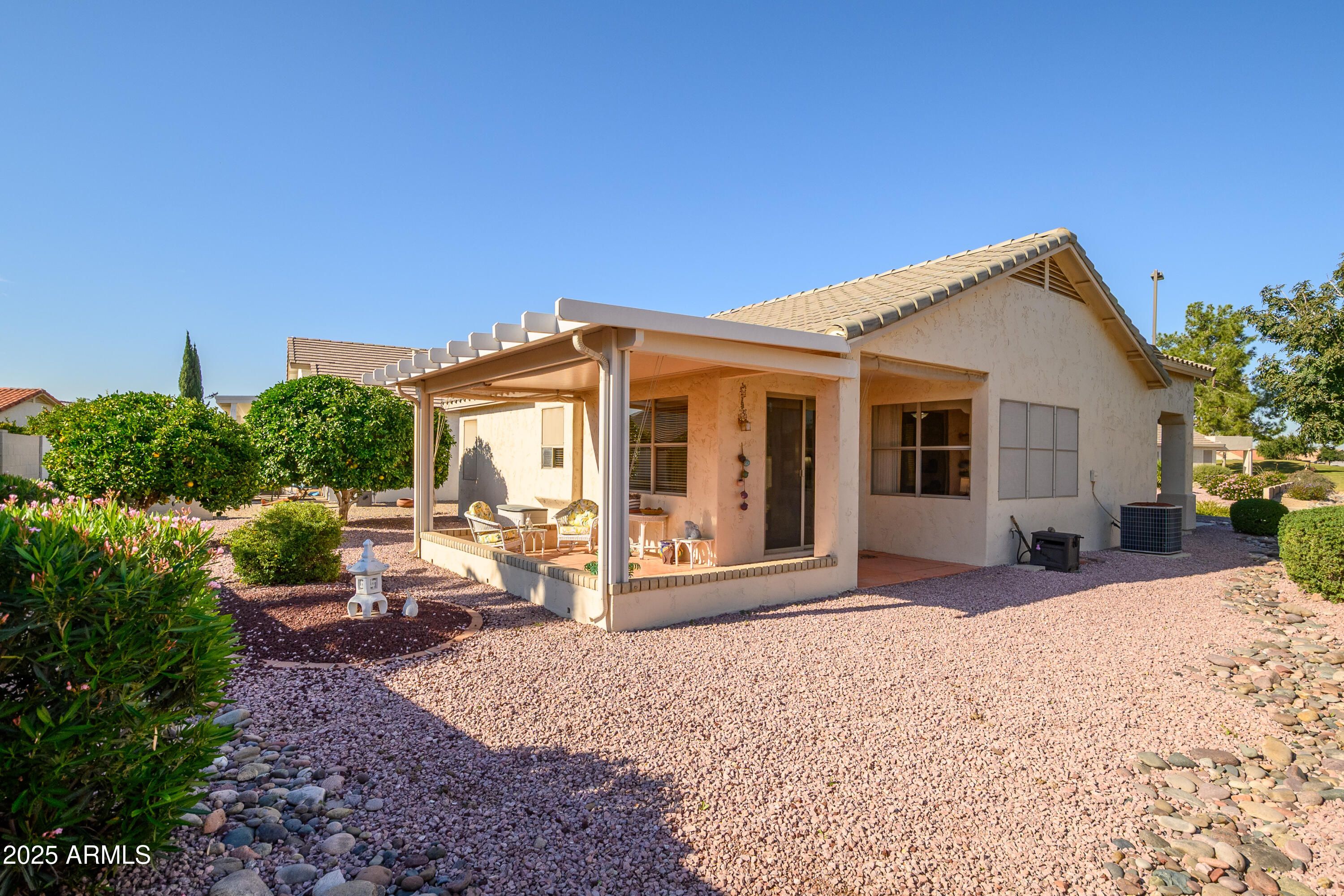 NEW ROOF, great corner lot, across the street open lot w/ view of the golf course! This home is calling for you! Darling 2 bed 2 bath floor plan w/ expanded laundry w/room for a small office or hobby area. This home is bright w/ lots of natural light & an open flow between living room & kitchen. The bedrooms are split & the guest bedroom could have alternative uses from office to craft room. The primary ensuite bedroom is spacious & has a nice size walk in closet. The backyard is fun for entertaining w/ a cute patio & privacy. It is an easy maintenance landscaping. The home is well postioned in Arizona Traditions & easy access to all the amenities. Arizona Traditions has much to offer, fitness, sports, entertainment & events, concerts, crafts, & many clubs, card/games groups.