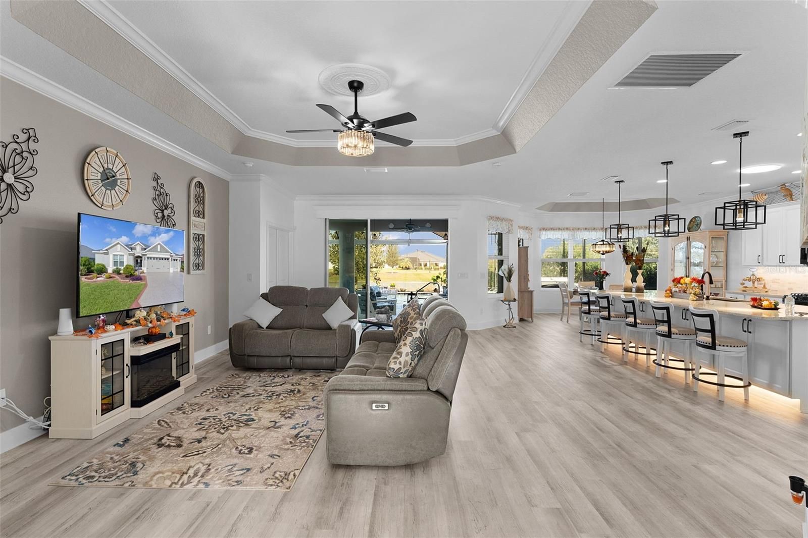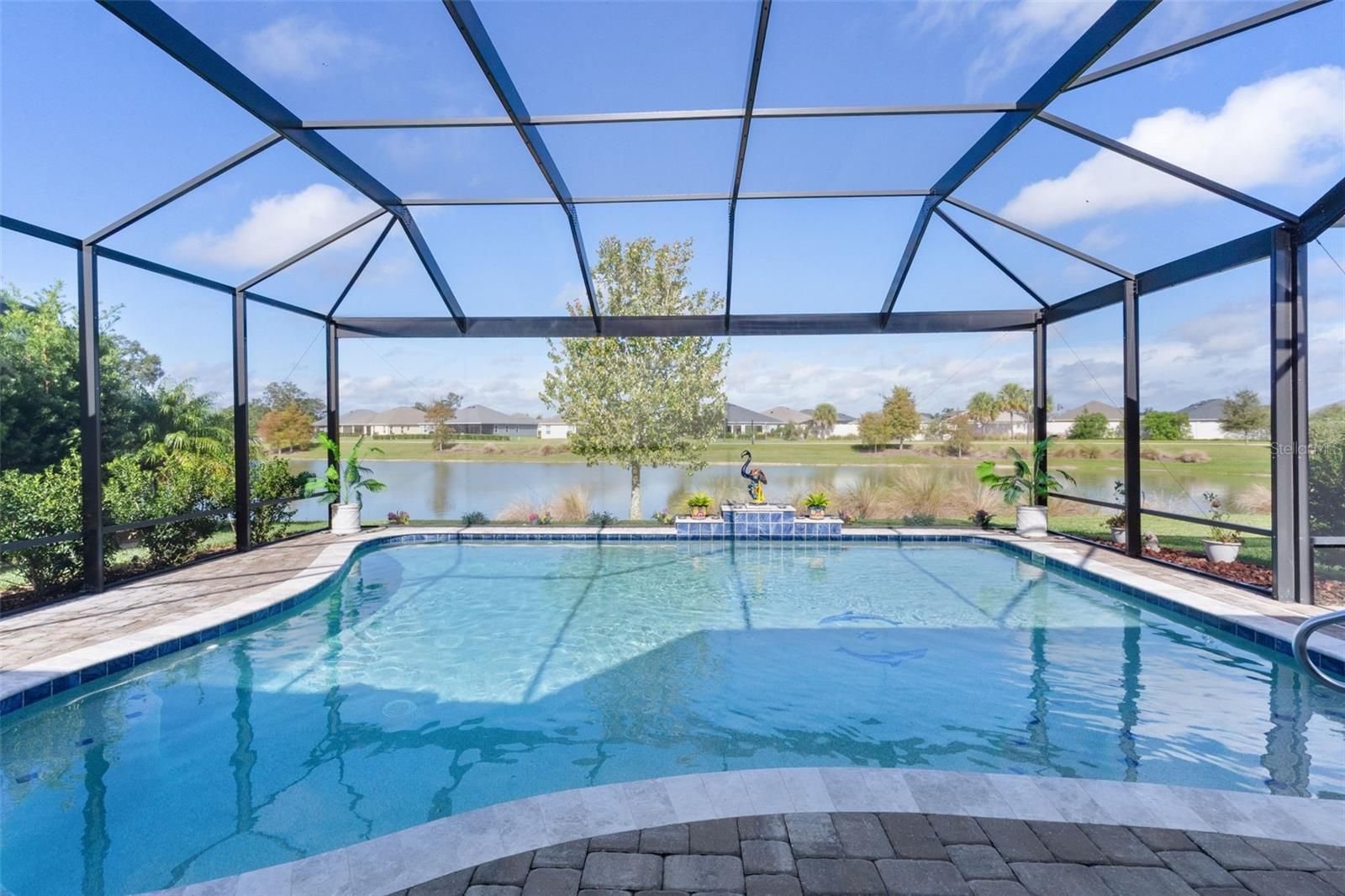 Want to live near Eastport in a LUXURY home but without the enormous BOND that goes along with some of the new construction? Experience refined living in this exceptional BRIDGEPORT MODEL, offering 3 bedrooms, 2.5 baths, and an atmosphere of effortless sophistication. From the moment you arrive, the home exudes elegance with its LIFETIME-GUARANTEED SHARK’S COATED DRIVEWAY, pristine lava rock LANDSCAPING, and expanded TWO-CAR PLUS GOLFCART GARAGE. Step through the front door into a residence that seamlessly blends luxury with comfort. The open-concept living areas are enhanced by CROWN MOLDING, DECORATIVE CORNICES, and three exquisite TRAY CEILINGS in the dining room, living room, and master suite. Matching GRANITE COUNTERTOPS and UPGRADED LIGHTING AND CEILING FANS throughout the home elevate every space with style and cohesion. The chef’s kitchen is a showpiece—featuring CRISP WHITE CABINETRY, BLACK STAINLESS STEEL APPLIANCES, BUILT-IN DESK WORKSTATION, and a SOLAR TUBE that bathes the room in natural light. The adjoining laundry suite offers built-in cabinetry and a UTILITY SINK, creating both beauty and functionality. The luxurious primary retreat easily accommodates a king-sized suite and boasts a spa-inspired bathroom with a walk-in Roman shower, dual sinks, separate vanity, and dedicated linen closet. PLUS, there are two separate walk-in closets! Two guest bedrooms are joined by a Jack-and-Jill bath with tiled tub and shower, while a powder room off the main living area provides added convenience for guests. Step through the sliding glass doors—complete with remote-control blinds—to your private outdoor sanctuary. The HEATED SALTWATER GUNITE POOL and SPA within the BIRDCAGE ENCLOSURE invite relaxation year-round. Pendant lighting, two cooling outdoor ceiling fans, and patio pavers for the flooring create the perfect ambiance for sunset entertaining. Beyond the pool, enjoy an UNINTERRUPTED 30-FOOT PANAORAMIC VIEW of the shimmering POND, framed by specialized screening for a seamless connection with nature. Every detail of this home reflects thoughtful design and timeless quality. It is more than a residence—it is a statement of elegance and comfort. Schedule your private showing today to experience one of the most captivating homes in the area. The remaining bond balance on this home is $28,348.73 – a far cry from some of the new construction, which is seeing bonds as high as $72,000!!!