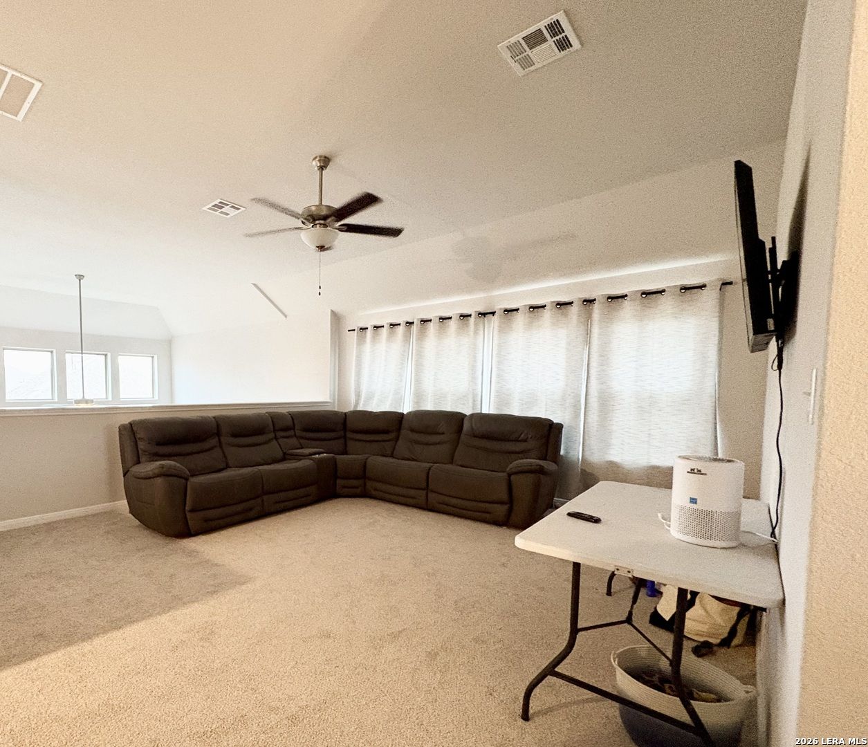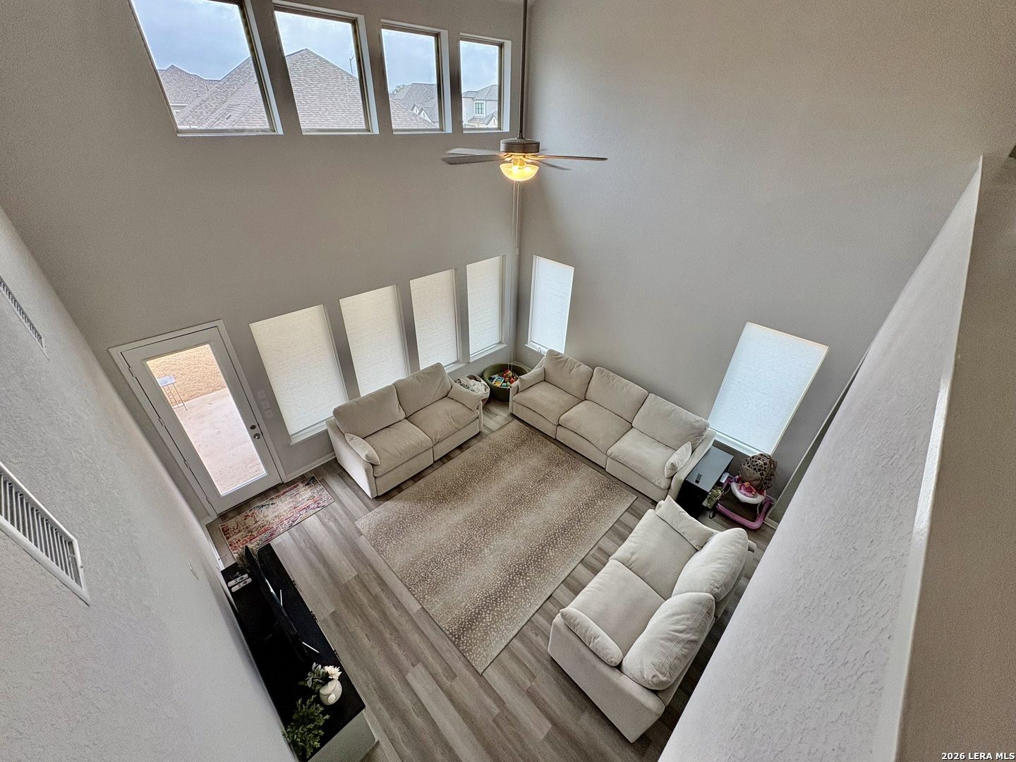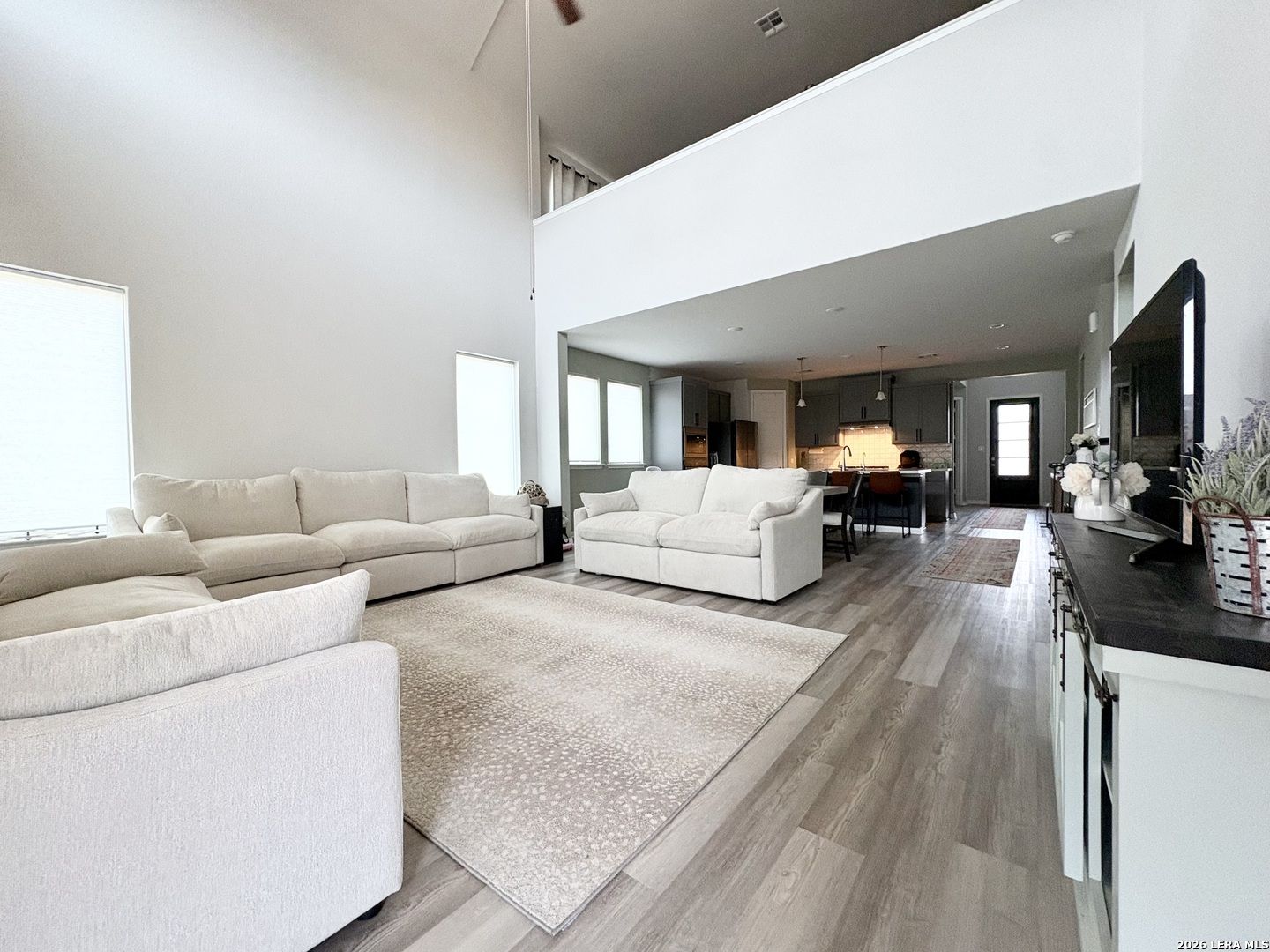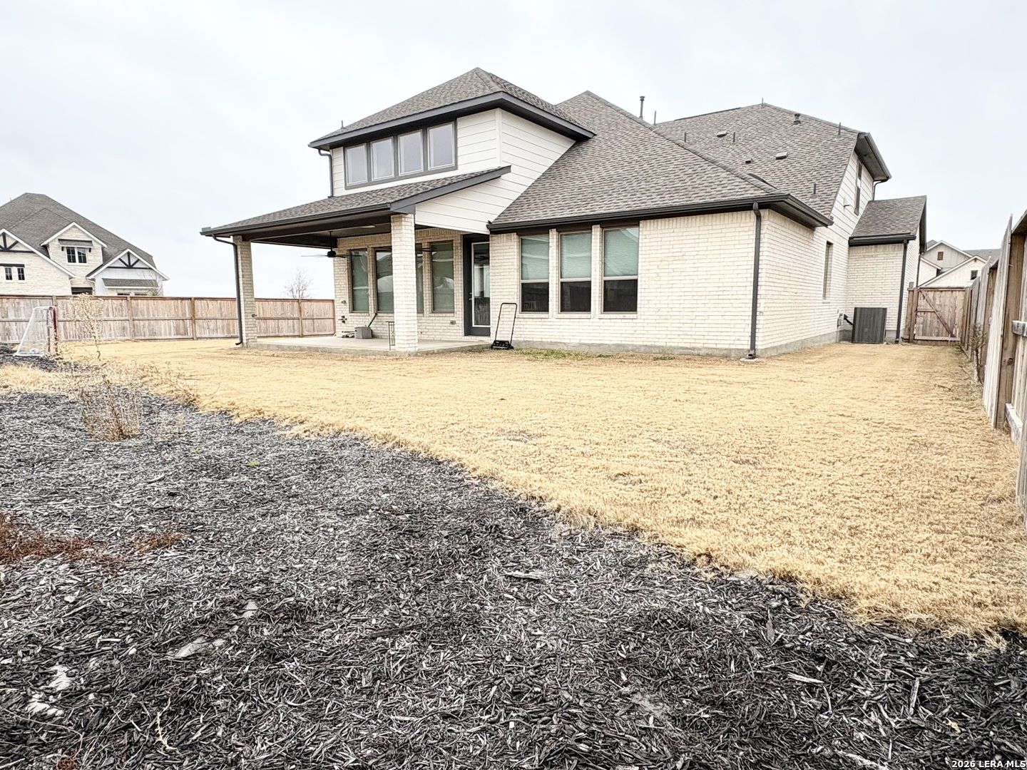 This home offers over 2,900 square feet of thoughtfully designed living space, perfectly situated on a large corner lot with ample room for a future pool. The only home currently available with a yard this size. This home features four bedrooms, including a downstairs primary suite, with three additional bedrooms upstairs, one of which includes a private en suite. When you step inside you are greeted with soaring ceilings that create a bright, open atmosphere. Upstairs, a generous game room provides stunning views and endless possibilities for entertainment or relaxation. The primary bedroom is a true retreat, with designer colors and a huge contemporary ceiling fan, featuring not one but two closets, including an oversized walk-in closet. Outdoors, enjoy a Texas sized covered patio designed for family gatherings, entertaining, and making lasting memories. With one of the largest lots in the community, this home gives you the space to truly spread out and enjoy outdoor living. Beautiful backsplash and designer hardware in the kitchen, this house is a Gem.