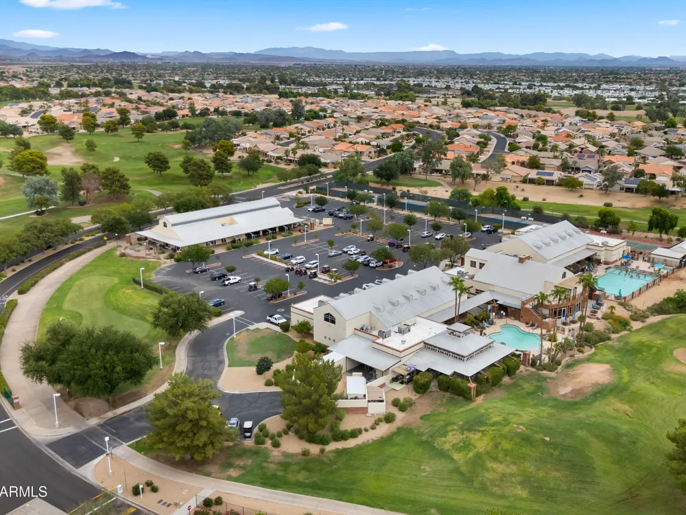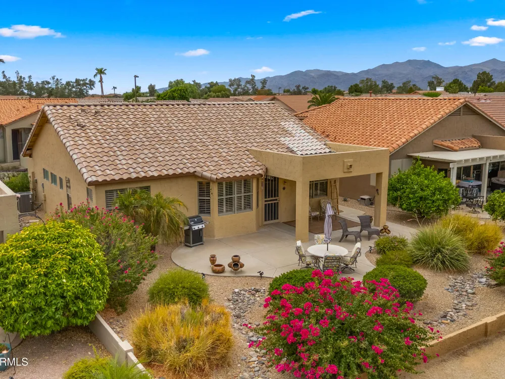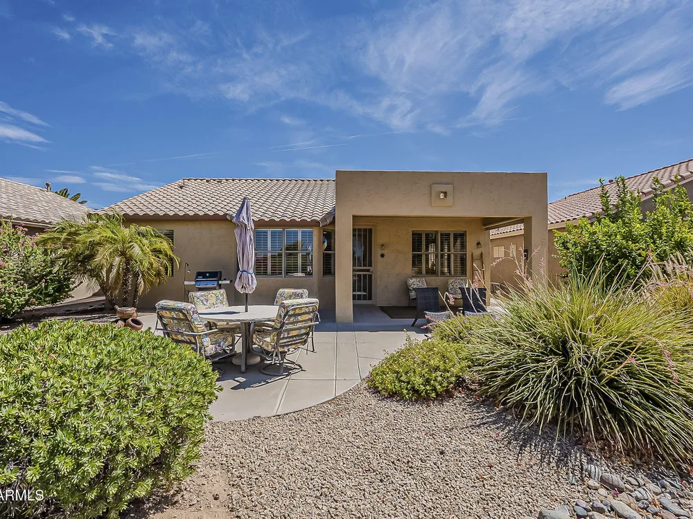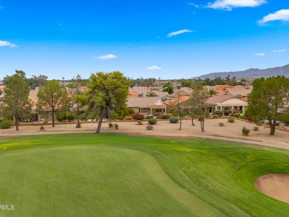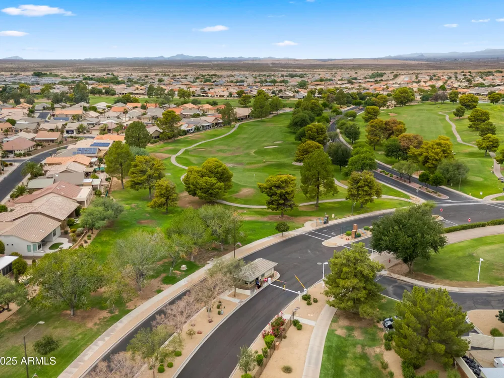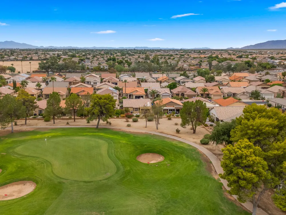 Experience desert living in this turnkey golf course home, in the guard-gated community of Arizona Traditions. Backing to the golf course, this home offers unobstructed views, privacy, and a breathtaking backdrop of sunsets and mountain peaks. Inside, soaring ceilings, custom shutters, and an open layout create a light-filled space. Upgrades include a brand new roof, driftwood-tone luxury vinyl flooring, tall baseboards, and fresh designer paint. The spacious interior flows to a large covered patio, perfect for entertaining or quiet mornings overlooking manicured greens. Arizona Traditions is a 55+ community offering golf, pools, tennis, pickleball, fitness, clubhouse, pub, and more. A rare opportunity on one of the community's premier lots. Furniture can be negotiated. on separate Bill of Sale.