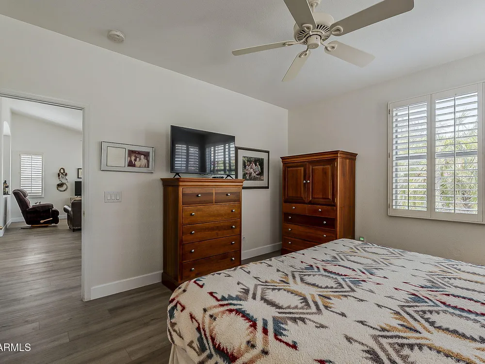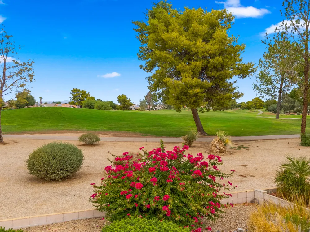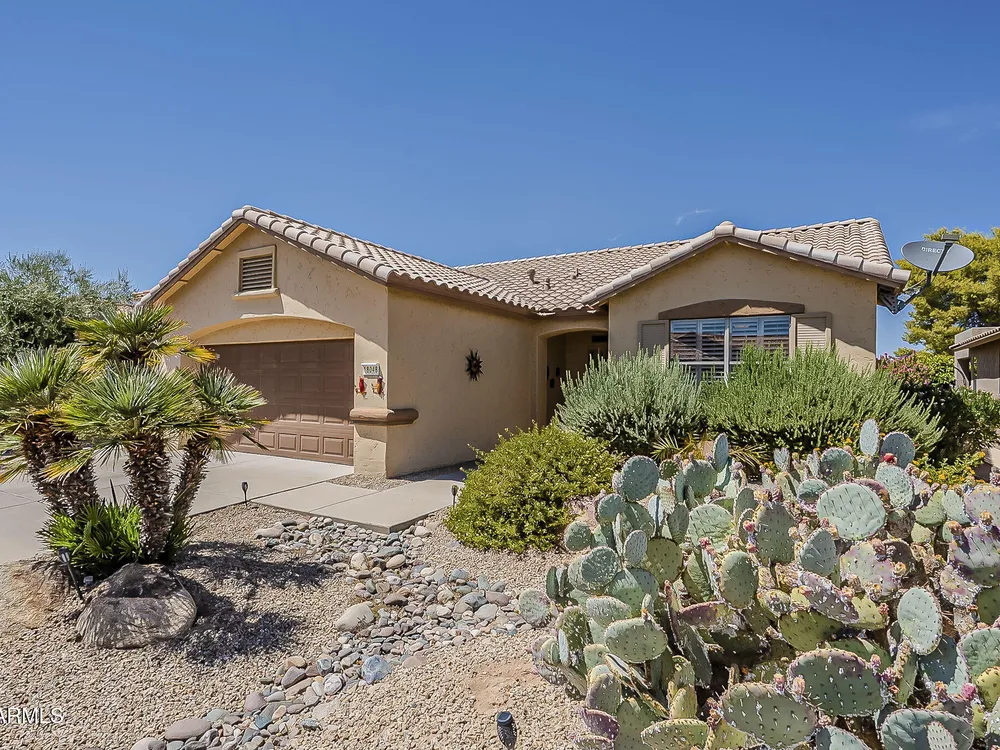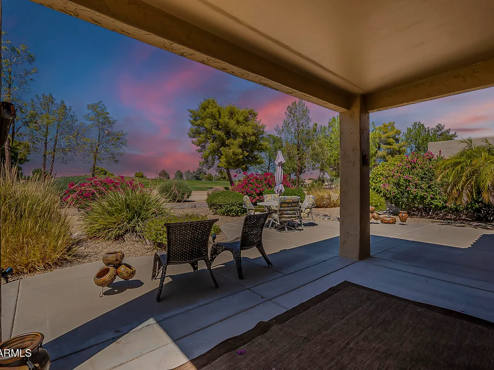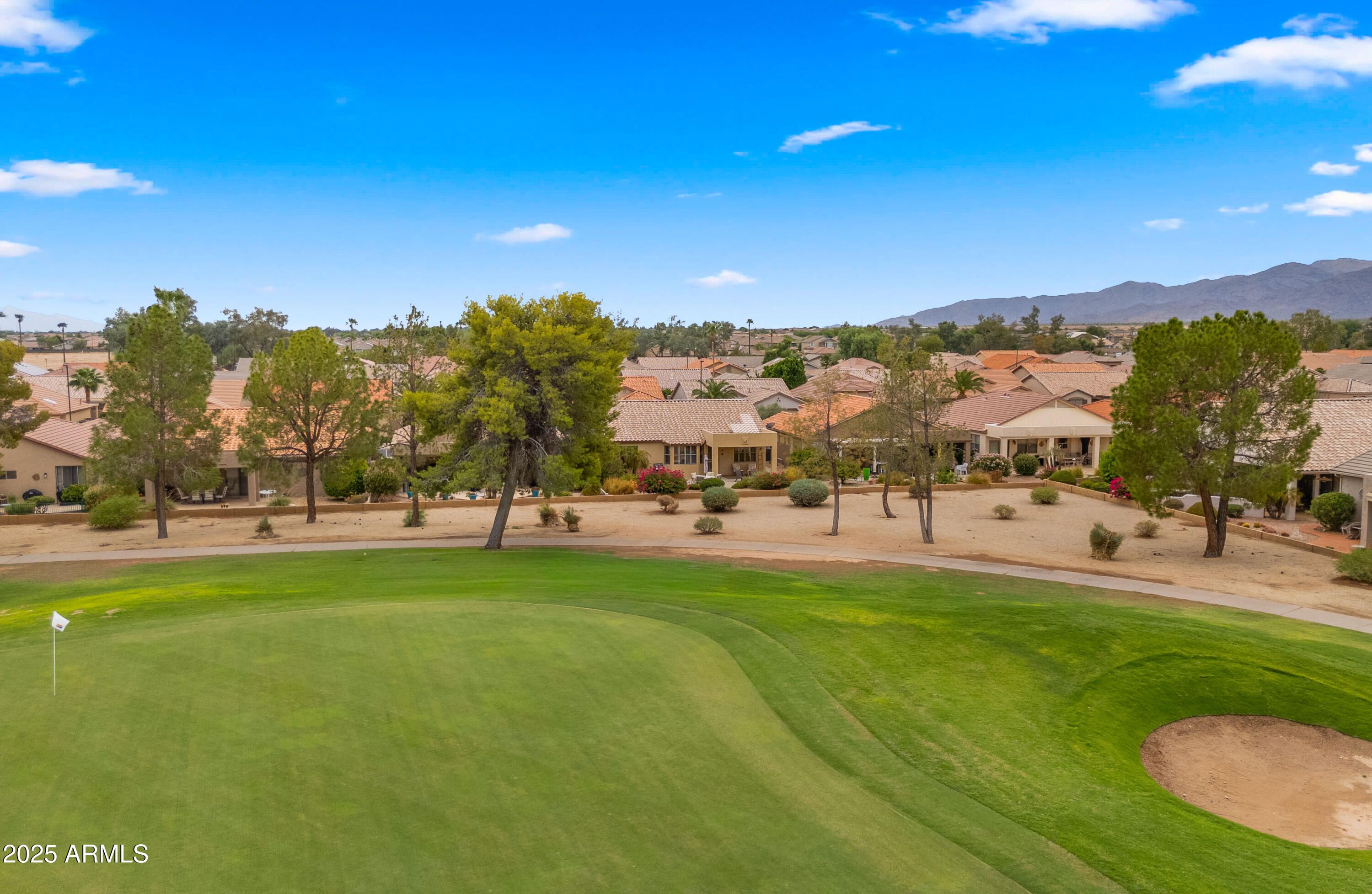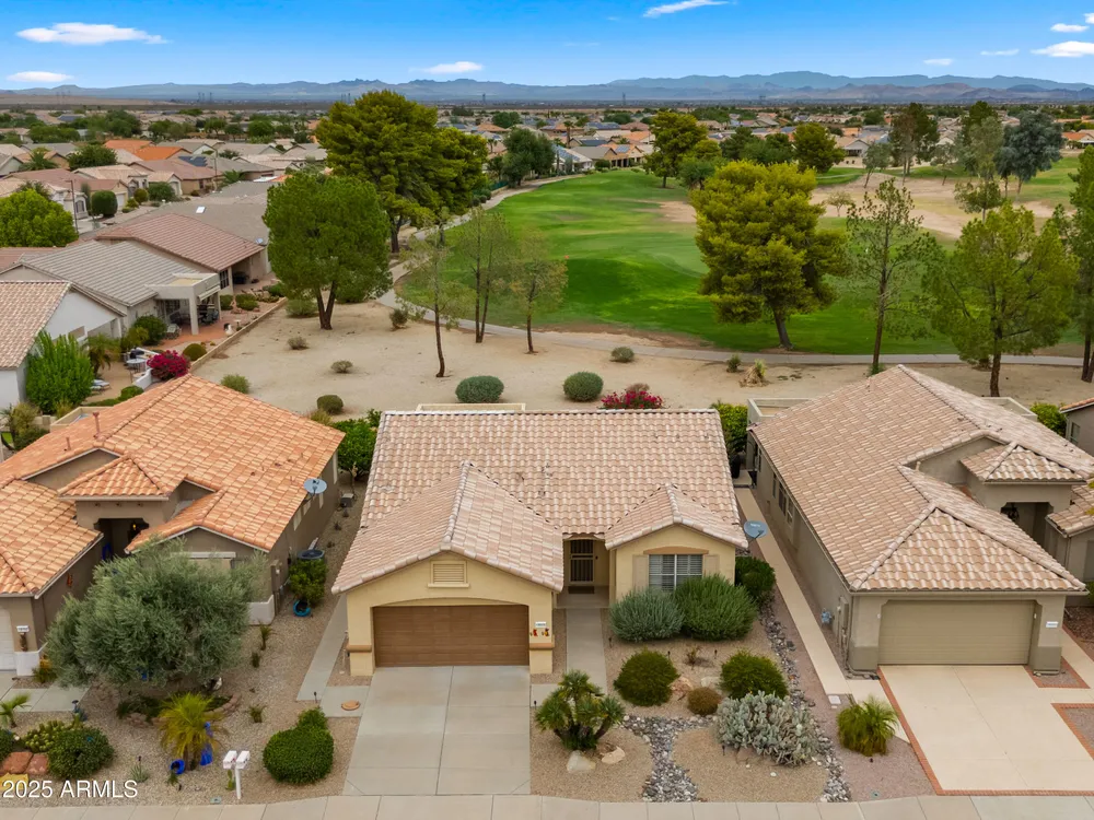 Experience desert living in this turnkey golf course home, in the guard-gated community of Arizona Traditions. Backing to the golf course, this home offers unobstructed views, privacy, and a breathtaking backdrop of sunsets and mountain peaks. Inside, soaring ceilings, custom shutters, and an open layout create a light-filled space. Upgrades include a brand new roof, driftwood-tone luxury vinyl flooring, tall baseboards, and fresh designer paint. The spacious interior flows to a large covered patio, perfect for entertaining or quiet mornings overlooking manicured greens. Arizona Traditions is a 55+ community offering golf, pools, tennis, pickleball, fitness, clubhouse, pub, and more. A rare opportunity on one of the community's premier lots. Furniture can be negotiated. on separate Bill of Sale.