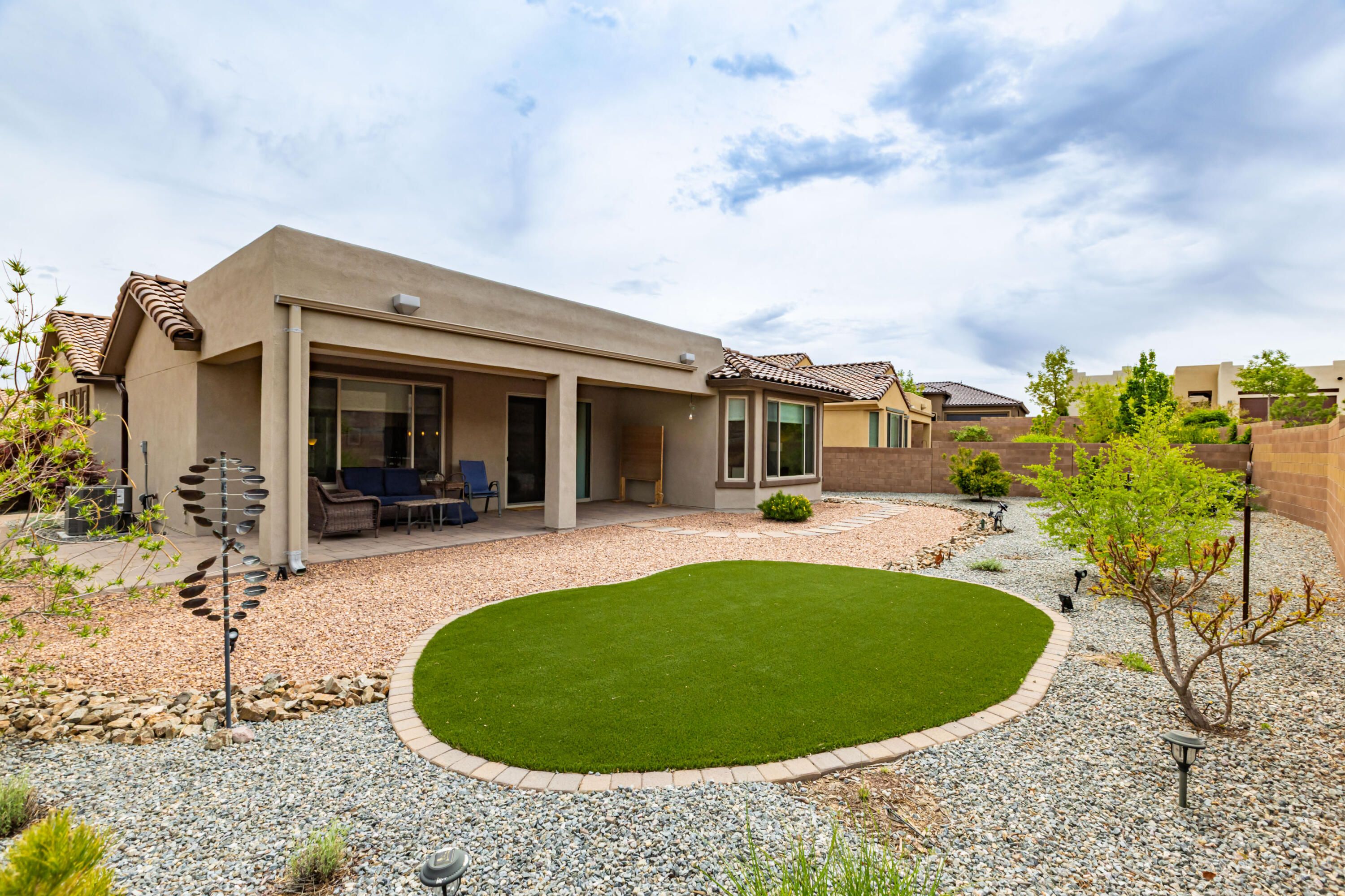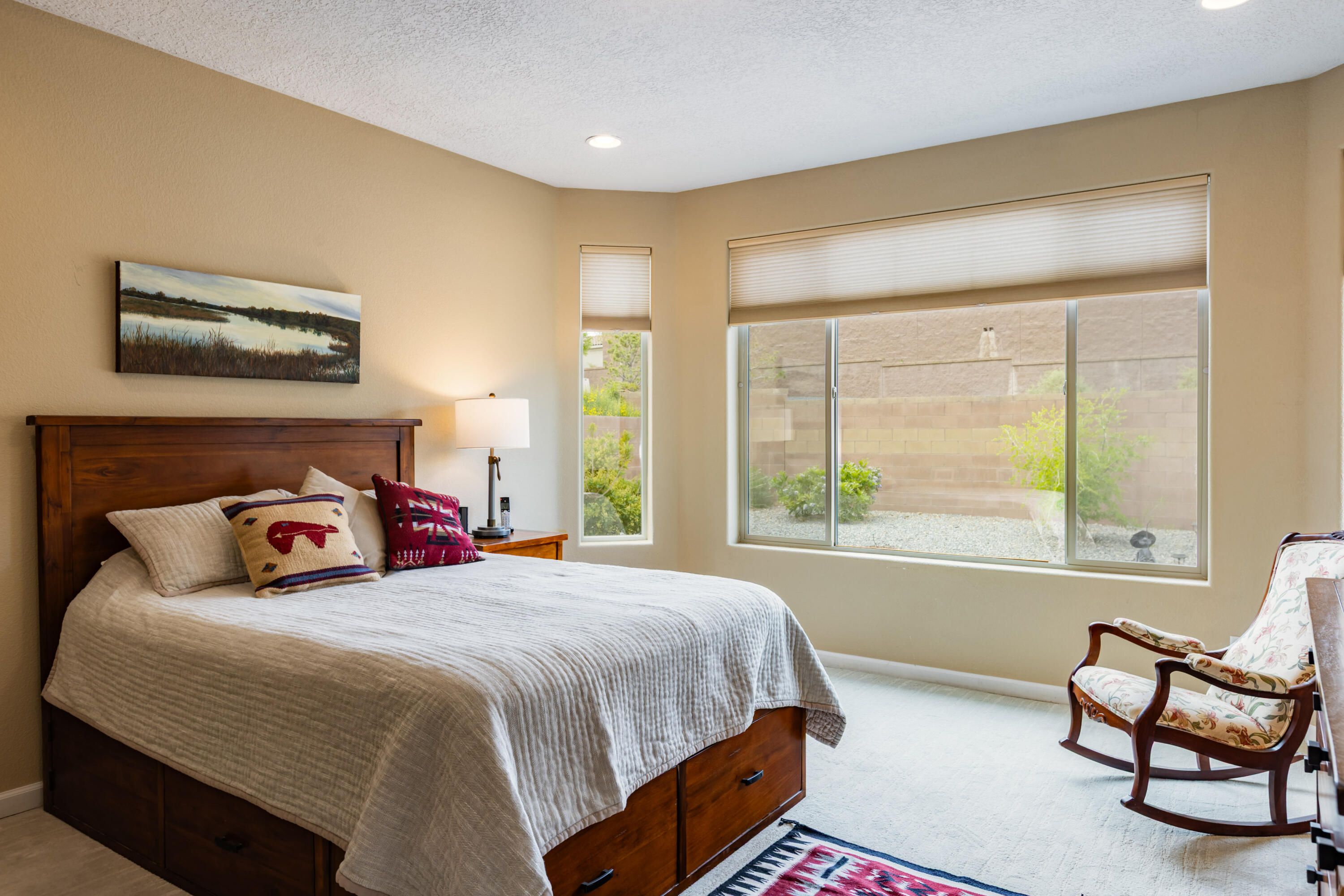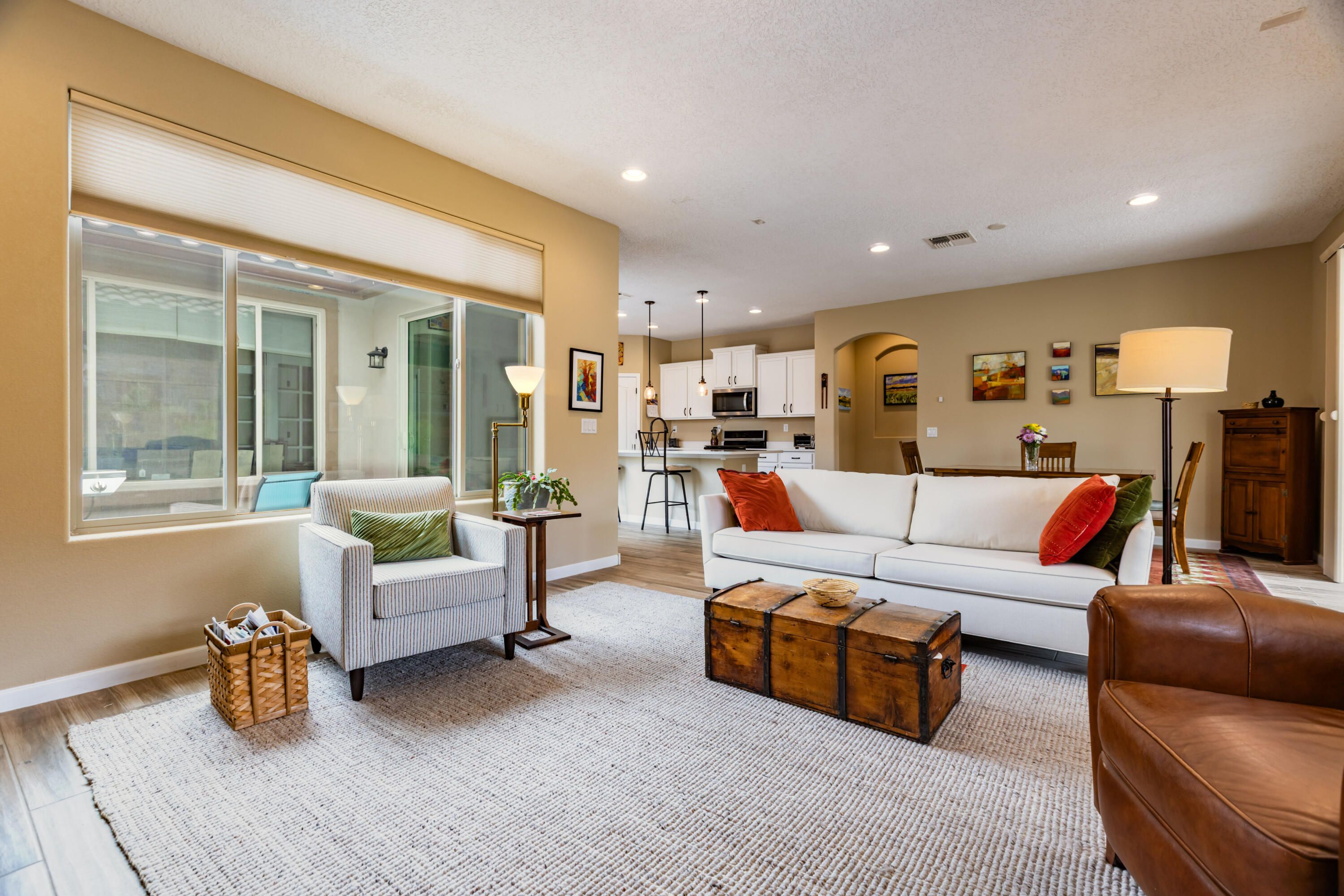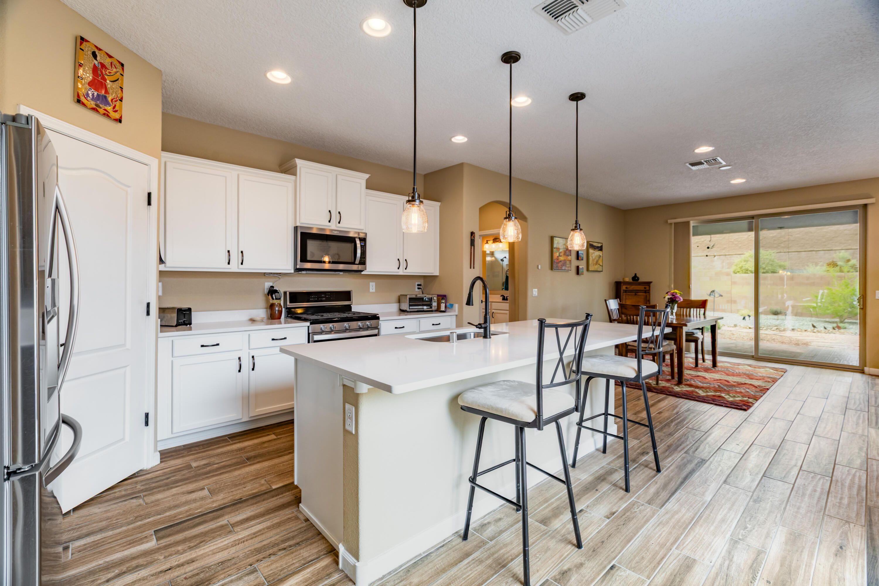 Beautiful home located in the 55+ Active Adult Gated Community in Del Webb Mirehaven! Original Owners built this home in 2019 w/ numerous upgrades including bay window in the primary bedroom, large WIC w/built-in drawers & shelving, extended 4ft garage w/'Hobby Package' w/extra storage & workbench stays, soft arched hallways, chefs kitchen, quartz countertops, French doors at office, laundry room sink, wood look tile, whole house water filter, custom blinds, ceiling fans, gas range. Home backs to open space & sits on a large .18 acre lot and is custom landscaped including: stained concrete side patio/courtyard & sidewalk to the backyard, pavers on the back patio, turf, plantings & gutters. You'll love the Sandia Amenity Center w/daily activities, gym, pool, Pickle Ball, tennis and more!!