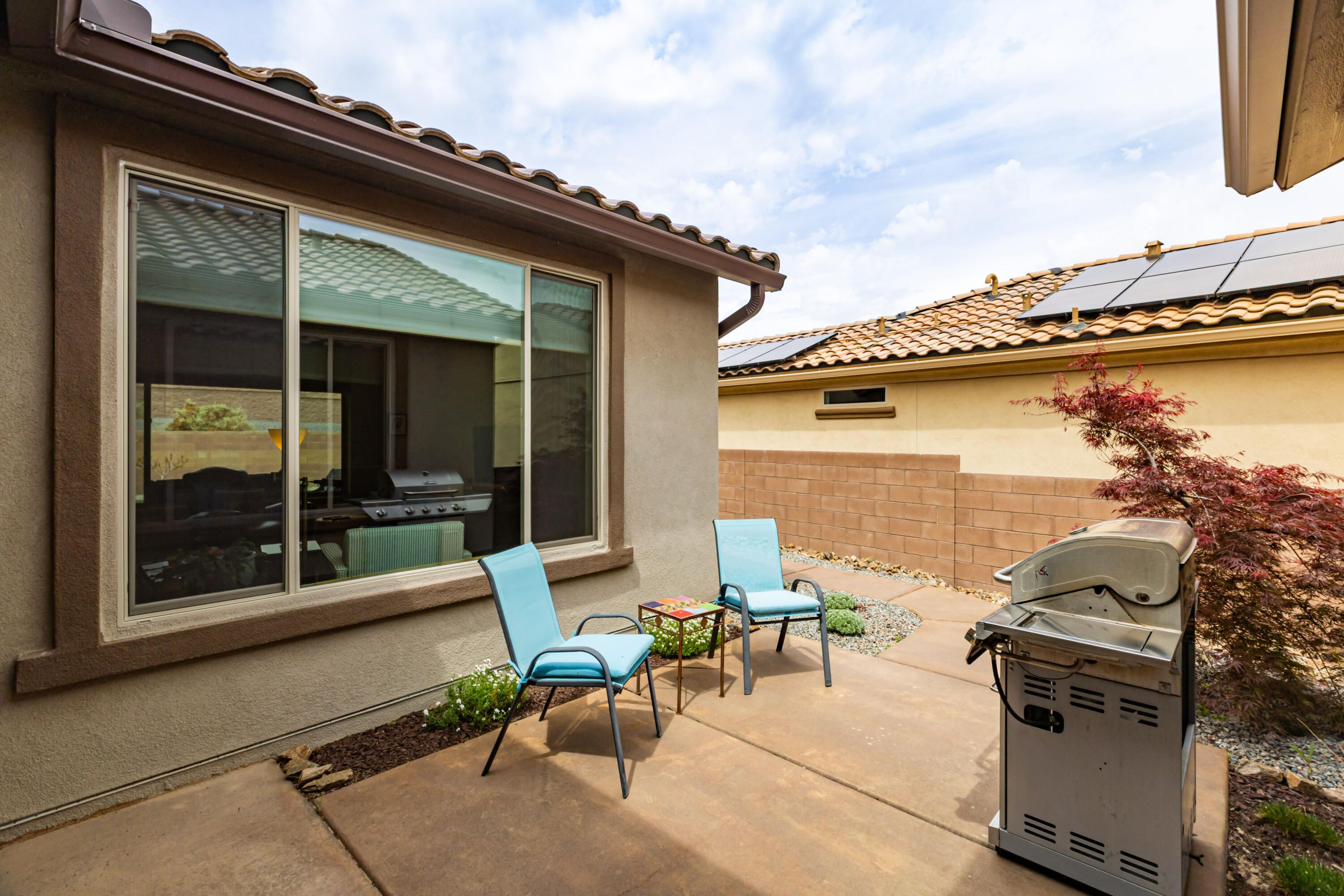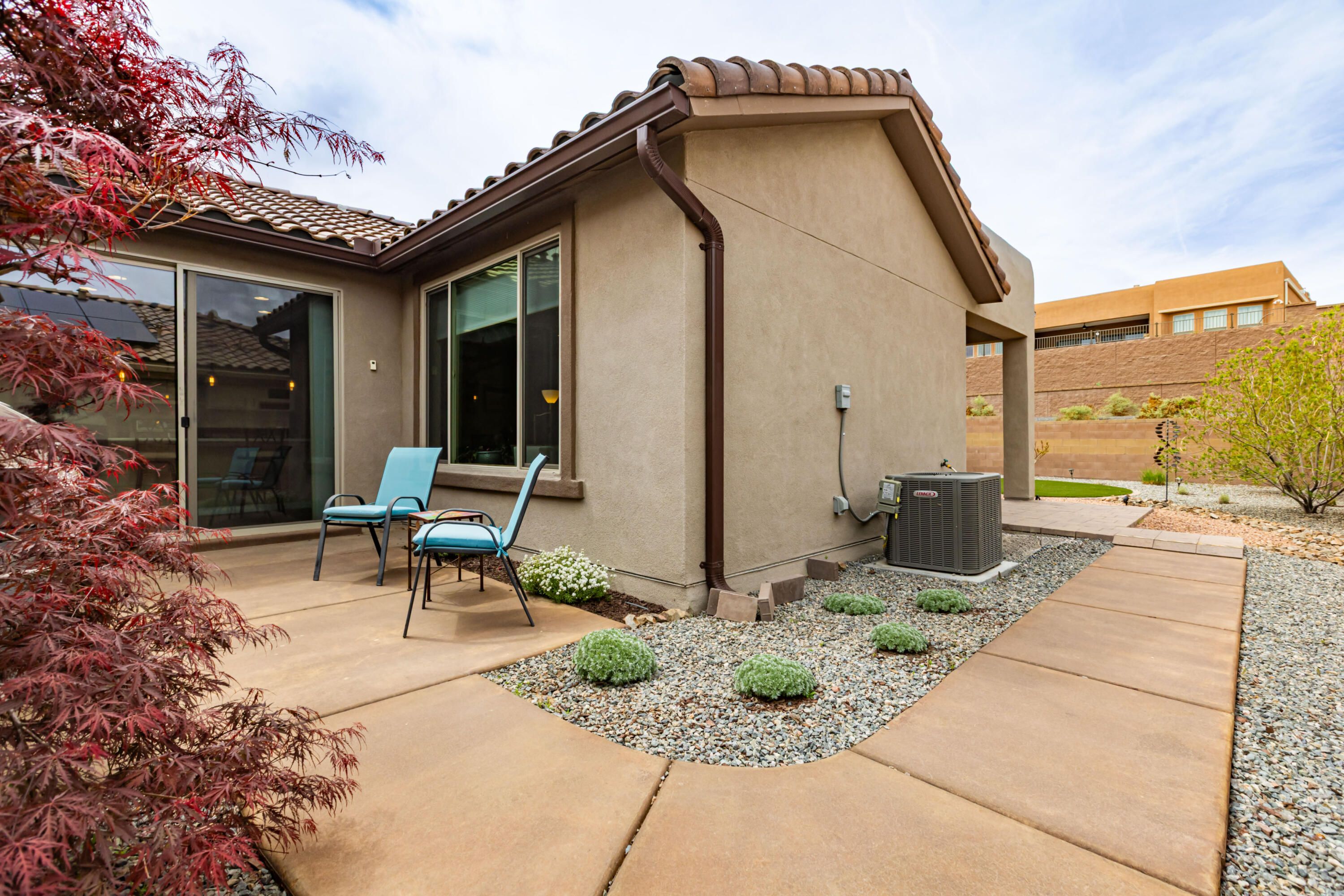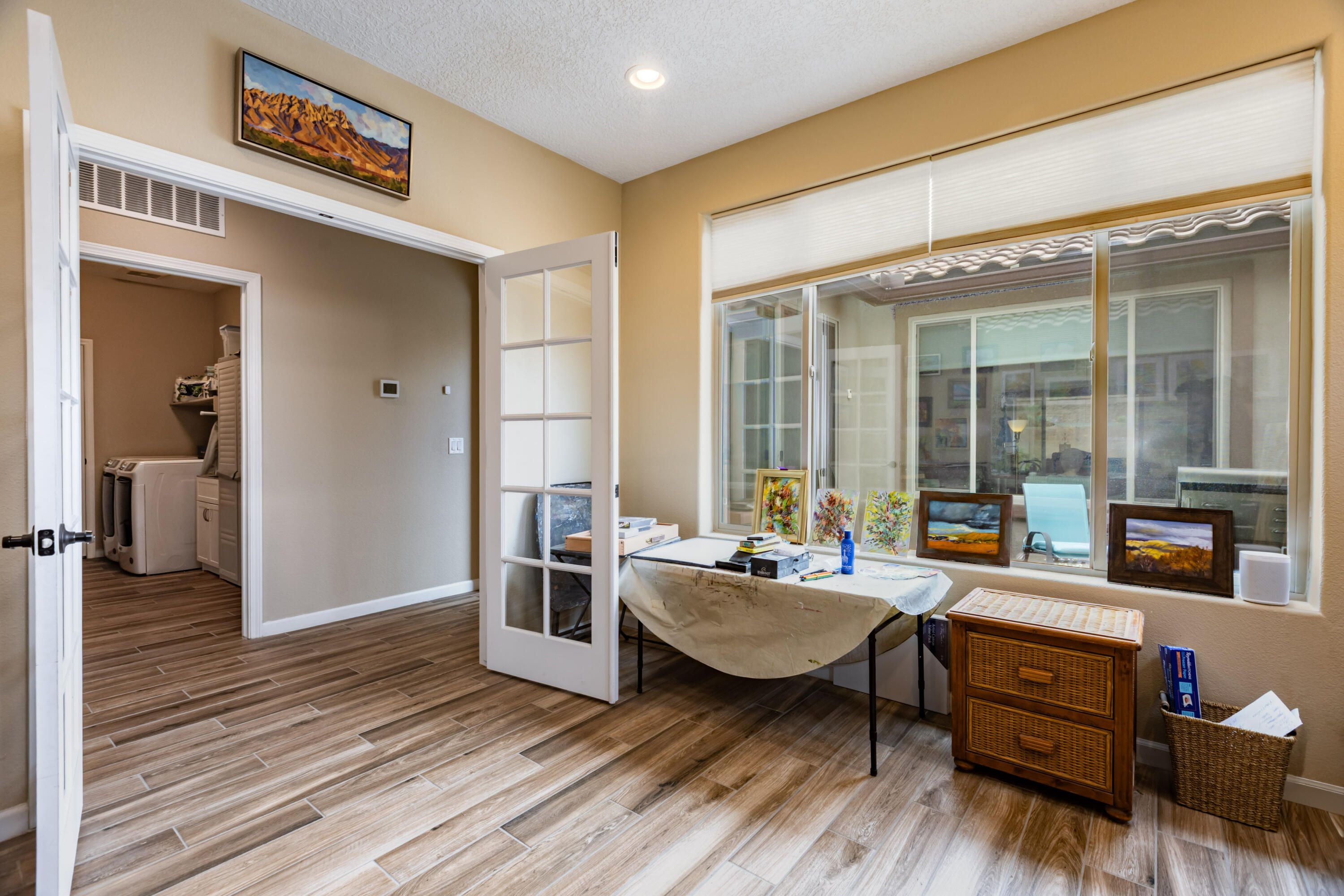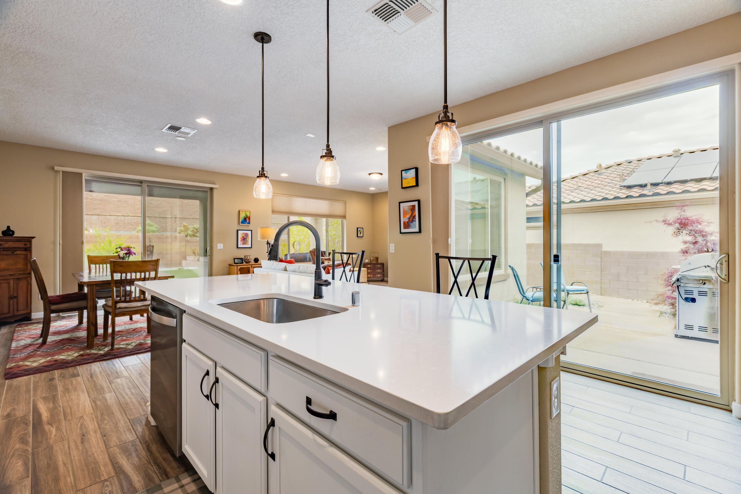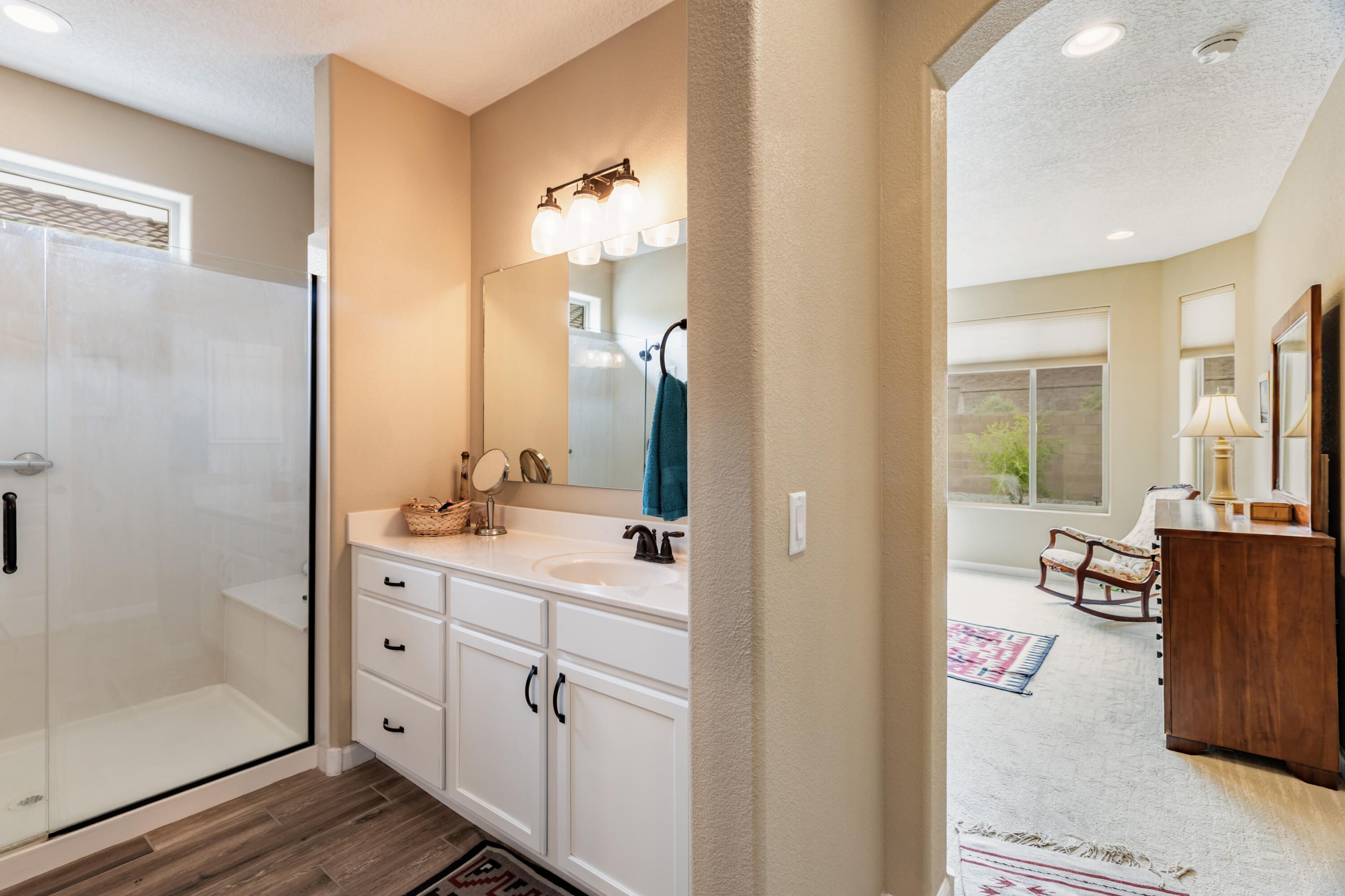Beautiful home located in the 55+ Active Adult Gated Community in Del Webb Mirehaven! Original Owners built this home in 2019 w/ numerous upgrades including bay window in the primary bedroom, large WIC w/built-in drawers & shelving, extended 4ft garage w/'Hobby Package' w/extra storage & workbench stays, soft arched hallways, chefs kitchen, quartz countertops, French doors at office, laundry room sink, wood look tile, whole house water filter, custom blinds, ceiling fans, gas range. Home backs to open space & sits on a large .18 acre lot and is custom landscaped including: stained concrete side patio/courtyard & sidewalk to the backyard, pavers on the back patio, turf, plantings & gutters. You'll love the Sandia Amenity Center w/daily activities, gym, pool, Pickle Ball, tennis and more!!