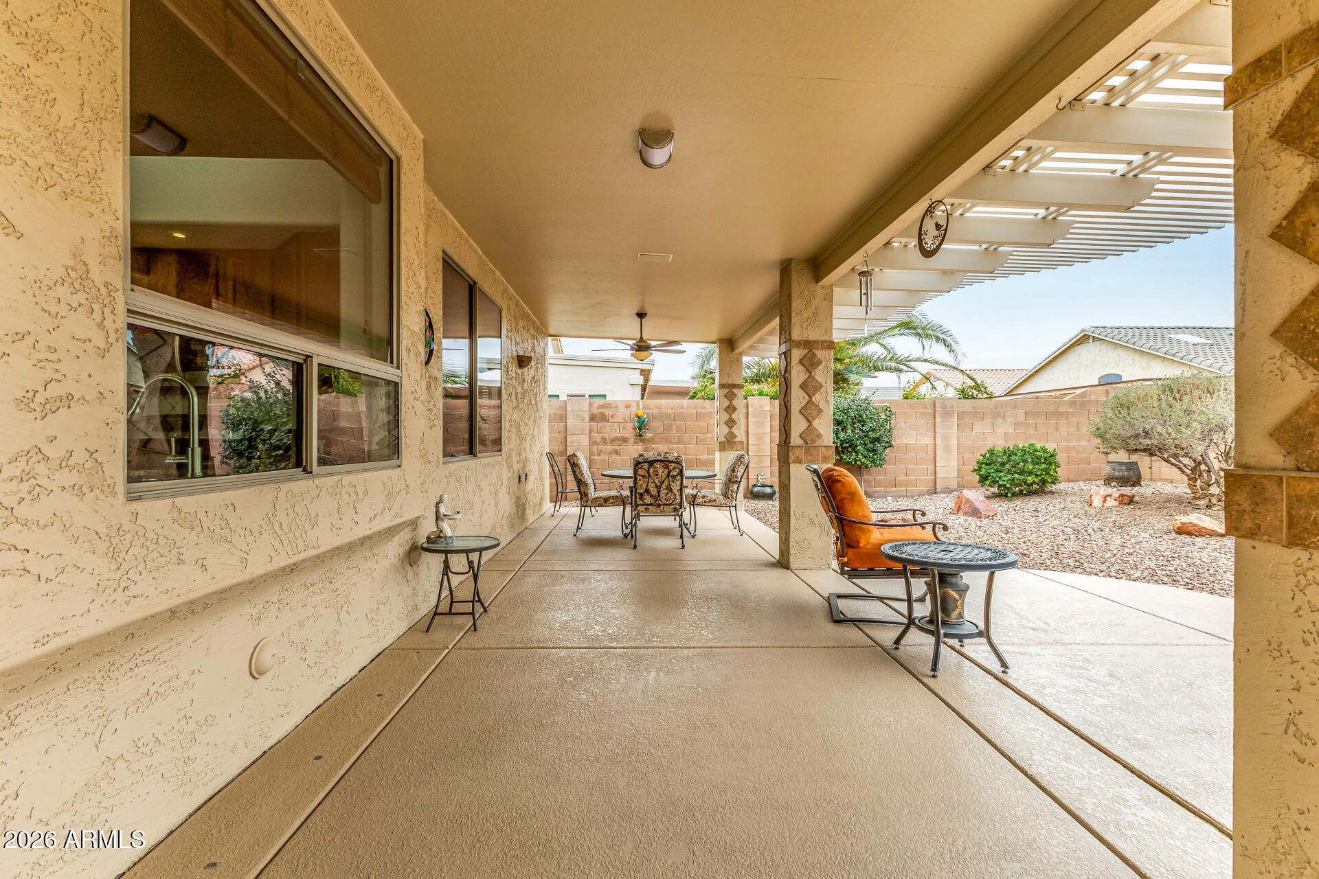 Welcome to resort-style living in the highly sought-after Arizona Traditions gated active adult community. Ideally situated on a premium cul-de-sac corner lot, this beautifully upgraded home offers one of the best locations in the neighborhood combining privacy, views, and easy access to all the incredible amenities. Step inside to an open concept living and dining area with vaulted ceilings that create a bright and airy feel. The thoughtfully designed split bedroom floor plan offers both functionality and privacy, featuring 2 bedrooms, 2 bathrooms, and a versatile den that can easily serve as a third bedroom, office, or hobby space. The spacious eat-in kitchen is beautifully appointed with granite countertops, stainless steel appliances, a large island for prep and casual dining, and a skylight that fills the space with natural light, along with ample cabinetry for storage. The primary suite is a peaceful retreat complete with dual sinks, a generous walk-in closet, and a spa-inspired bath. Enjoy Arizona's beautiful weather year-round in the extended covered patio overlooking the premium size fenced yard with easy care landscaping, tranquil fountain, and plenty of space to relax or entertain. Additional highlights include a laundry room with a sink and extra cabinetry, 2 car garage with built-in storage, and low maintenance landscaping for true lock-and-leave convenience. Living in Arizona Traditions means embracing an active, vibrant lifestyle with golf, 3 swimming pools, tennis, pickleball, bocce, horseshoes, clubs, social groups, and countless activities just moments from your door. This is more than a home, it's the lifestyle you've been waiting for.