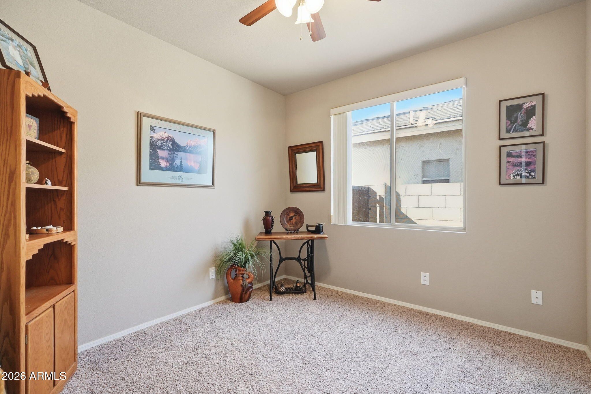 Welcome to this 2-bedroom + den, 2-bath home in Arizona Traditions, a premier 55+ active adult community in Surprise, Arizona. This thoughtfully designed floor plan offers a dedicated den—ideal for a home office or hobby space. The home features comfortable living areas and opens to a large covered patio, perfect for enjoying Arizona's indoor-outdoor lifestyle. Residents of Arizona Traditions enjoy resort-style amenities including golf, clubhouse, fitness center, pools, pickleball and tennis courts, walking trails, softball league and a full calendar of social activities, including a fully functional woodshop for the wood workers! Conveniently located near shopping, dining, medical services, and freeway access, this home is ideal for low-maintenance, active adult living