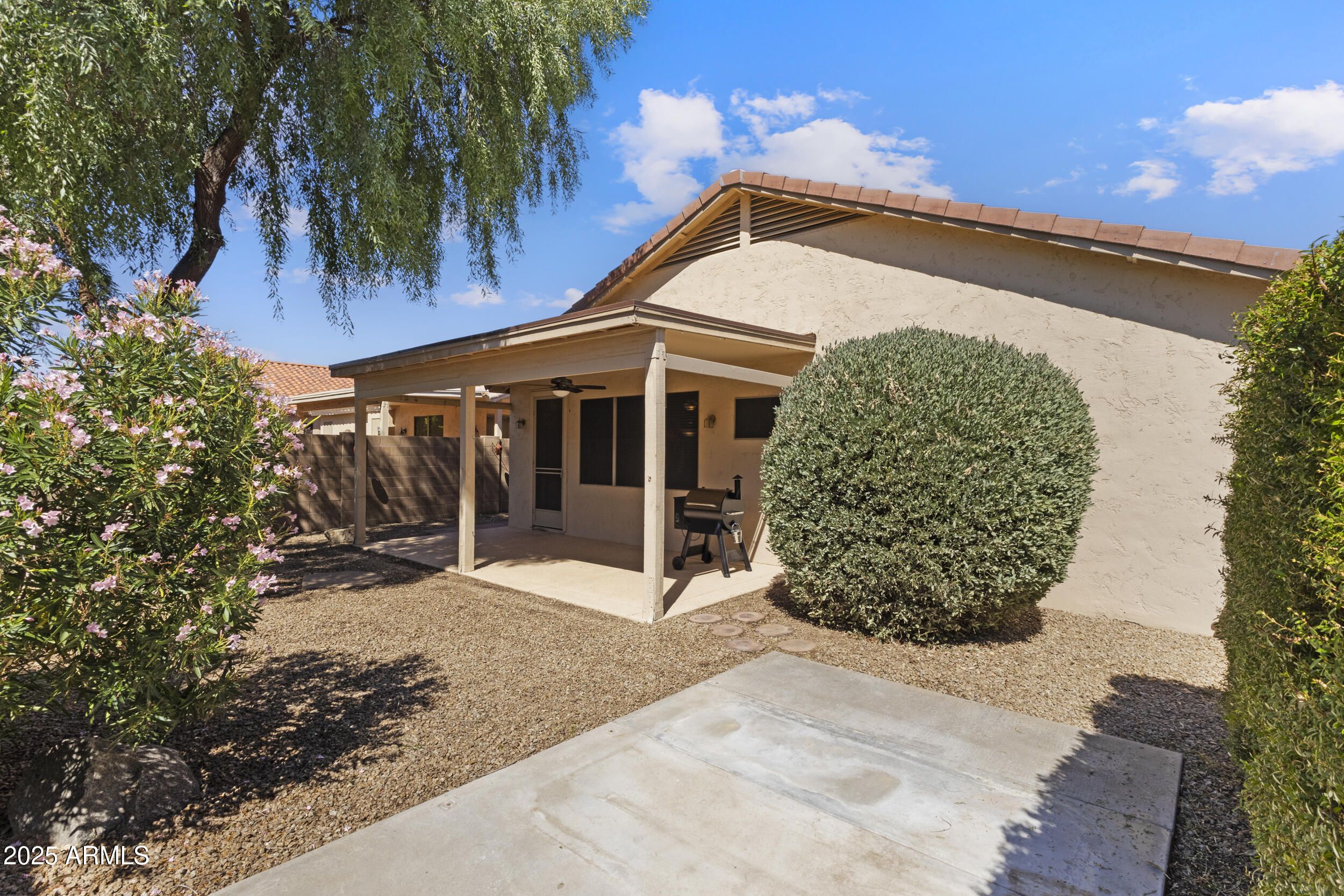 Come make this home your own! This charming single-level home in the gated 55+ Arizona Traditions community now features fresh interior paint and brand-new LVP flooring throughout. The inviting front porch is perfect for iced tea with neighbors, while the backyard offers plenty of shade for relaxing. Inside, the spacious living room welcomes you with a cozy fireplace, and the eat-in kitchen includes a custom built-in bench, pantry with slide-out shelves, and durable countertops. The large, light-filled primary suite boasts a walk-in closet, while the guest bedroom and separate office provide extra flexibility. The garage offers built-in cabinets for added storage. Community amenities include golf, swimming pools, fitness, pickleball, tennis, wood shop, sewing room, and lots of clubs!