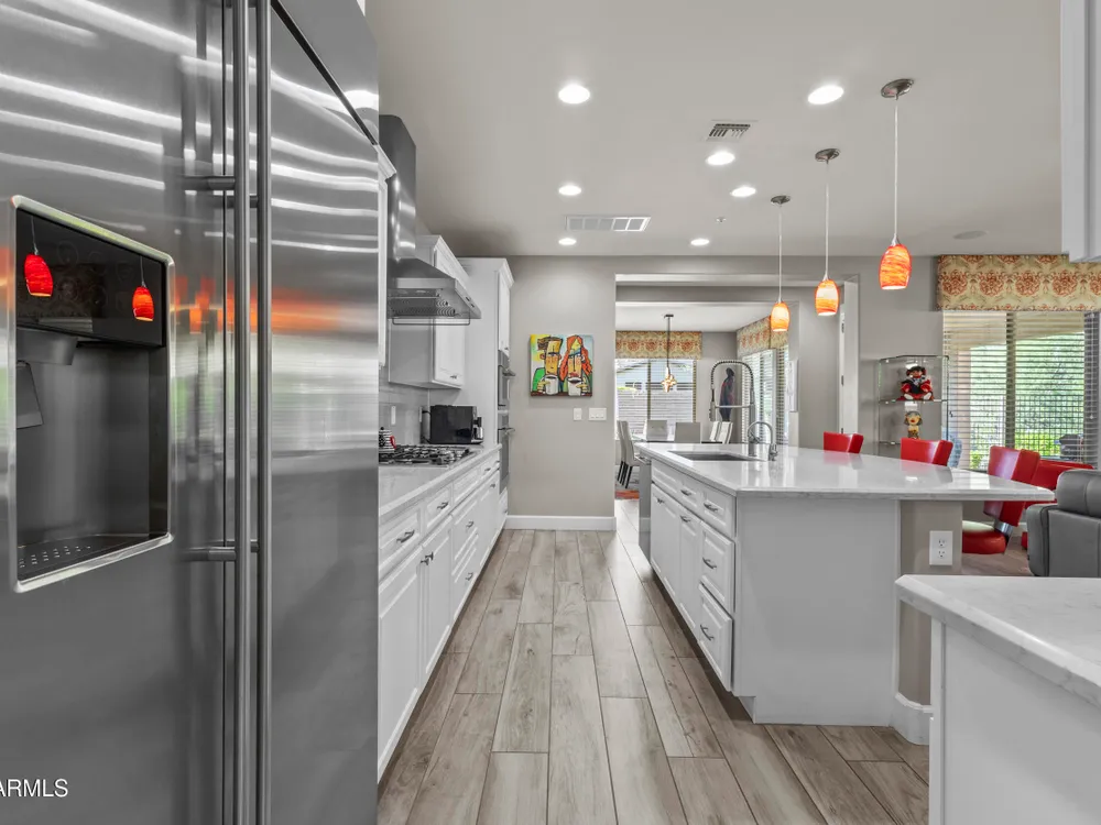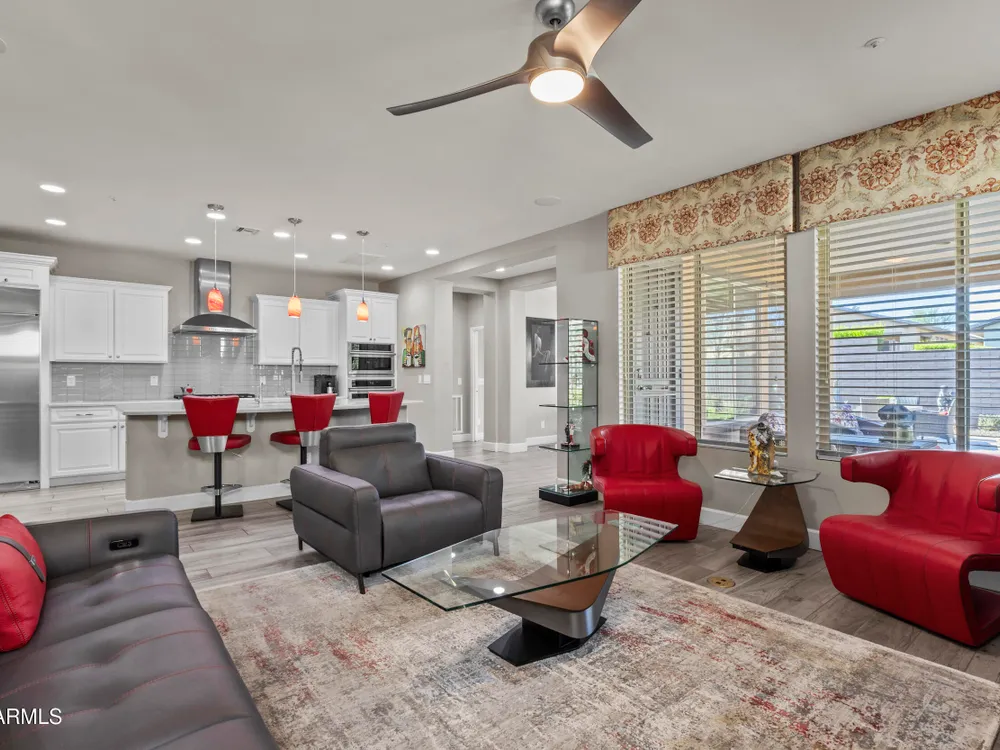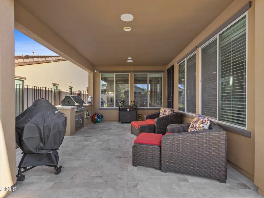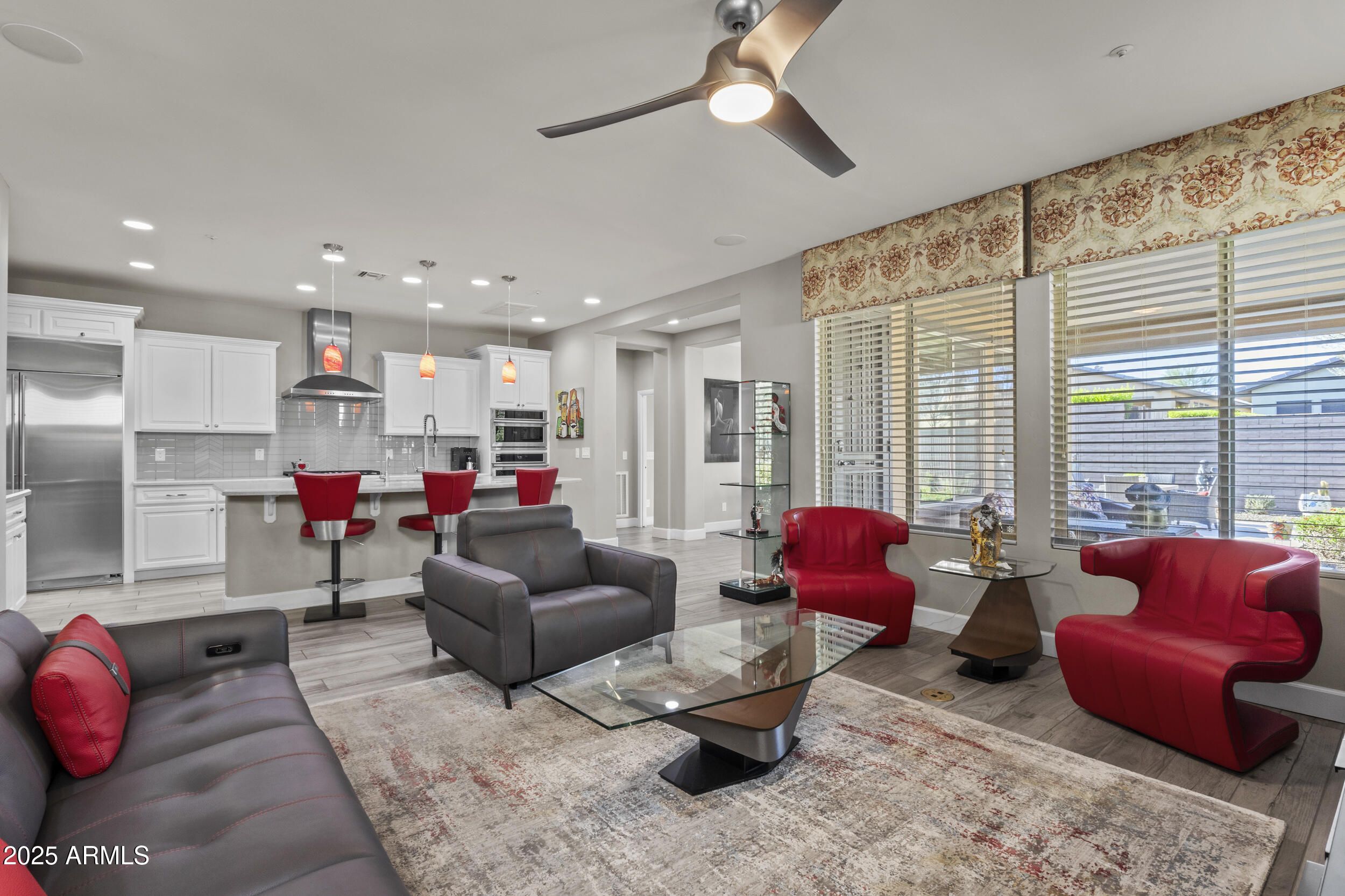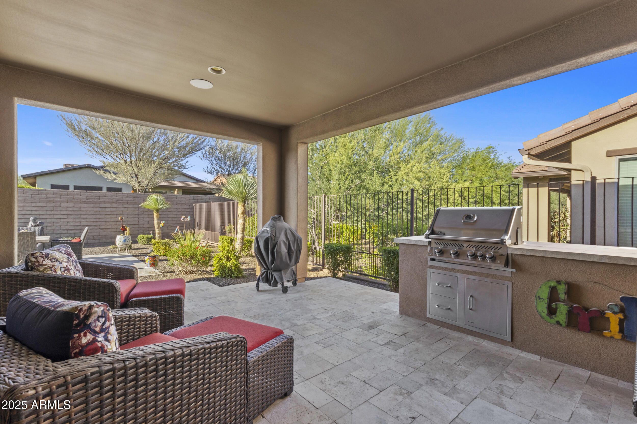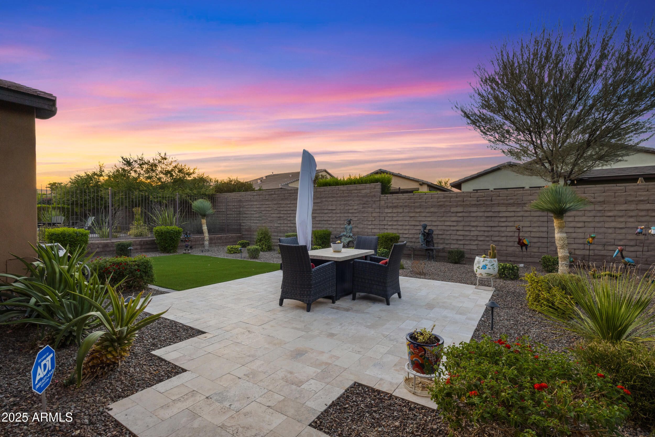 Discover this popular floor plan in the sought-after Trilogy at Verde River, a premier gated golf community. This 2-bedroom, 2-bath home includes a versatile den/office, a fenced backyard, and a gourmet kitchen with upgraded stainless steel built-ins, a spacious island, and custom touches throughout. The primary suite offers a tiled shower, dual sinks, and a custom walk-in closet. Extras include a soft/RO water system, upgraded smart room/laundry with quartz counters, garage cabinets with epoxy floors, and a peaceful backyard retreat with built-in BBQ, extended travertine pavers, artificial turf, and misting system. Enjoy resort-style living with access to a Tom Lehman-designed golf course, clubhouse with dining at Needle Rock Kitchen & Tap, casual fare at Eddy's Diner, full-service spa, fitness center, pools, tennis, pickleball, dog park, art studio, and more. Nestled by the Tonto National Forest with miles of hiking and biking trails, this is desert living at its finest.