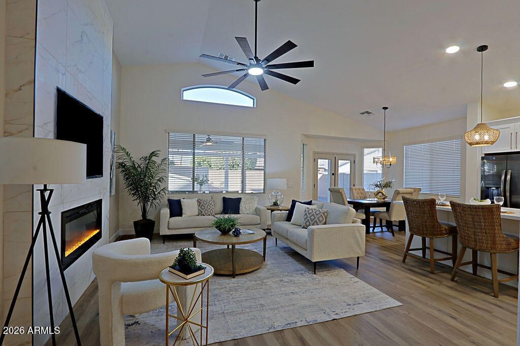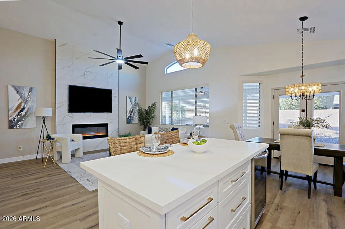 Enjoy retirement at it's best! Desirable golf course community AZ Traditions! This home been completely renovated and ready to move in. Private lot with N/S exposure, fenced in backyard with block wall. Spacious floor plan with vaulted ceilings, kitchen open to great room, kitchen island with breakfast bar, pendent light. 2 bedrooms, plus den. Master suite offers double sinks, private toilet room, tiled shower, walk-in closet. This home is highly upgraded with Luxury Vinyl flooring t/o, White Shaker cabinets, Quartz counter tops, Black stainless steel appliances including wine fridge. New HVAC 2026, new roof underlayment replaced 2026, new water heater 2025! Epoxy garage flooring . Large covered patio with outdoor fireplace. Low maintenance backyard landscaping. Home warranty included