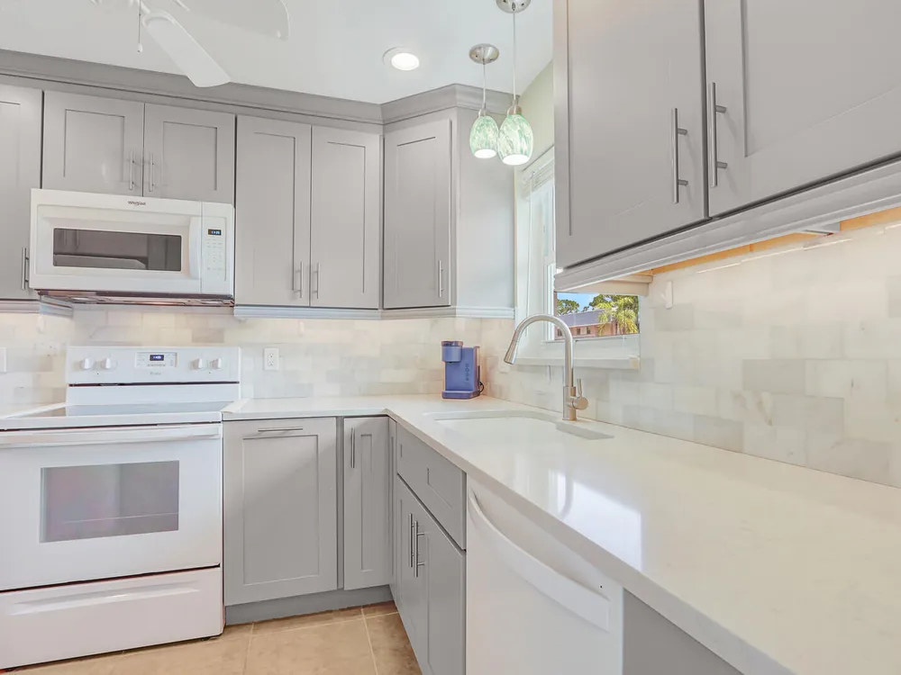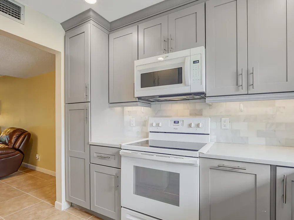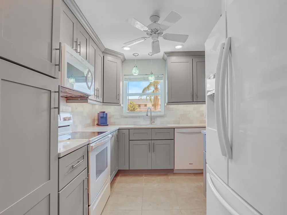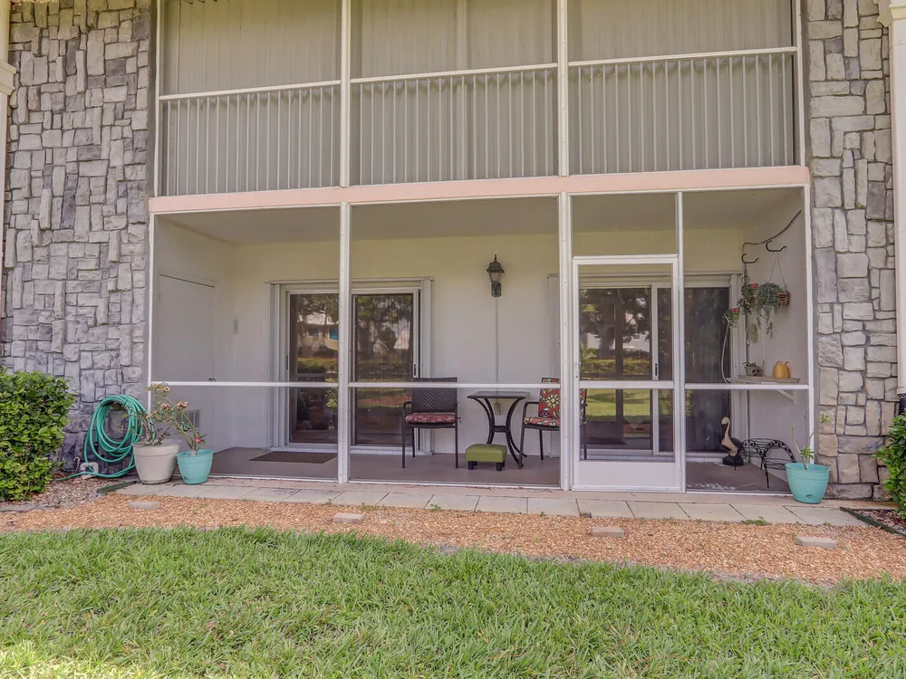 Beautifully updated 2-bedroom, first-floor condo that's move-in ready and fully furnished! This clean and well-kept unit offers easy access and a prime spot in Building 2. All new remodeled kitchen boasts custom cabinets, quartz countertops, under cabinet LED lights, new appliances & new pendant lights. Enjoy peaceful views from the screened-in patio, which includes an extra storage closet. Inside, you'll find stylish tile floors & impact windows. Both bedrooms feature spacious walk-in closets for plenty of storage. This 55+ community is packed with amenities--enjoy free golf (included in your HOA), a pool, tennis courts, clubhouse, shuffleboard, bocce, and more. Located right next to Jonathan Dickinson State Park. Close to restaurants, shops, golf, I-95 and The Beach.