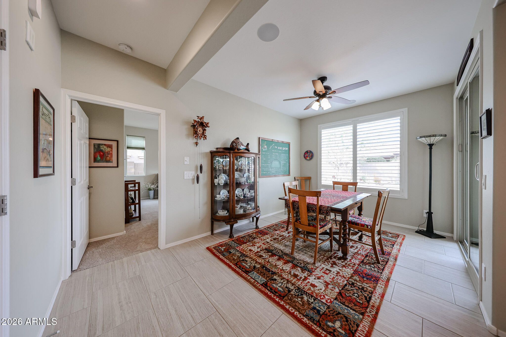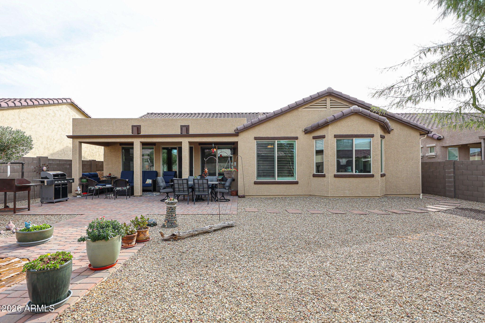 Welcome home to effortless living in this beautifully appointed 2-bedroom, 2-bath Serenade floorplan with a versatile den - perfect for a home office, hobby space, or cozy retreat. Charming curb appeal sets the tone with a paver walkway leading to a covered front porch accented by stacked stone and low-maintenance desert landscaping, inviting you to slow down and enjoy the moment. Inside, the open-concept design is both stylish and functional, featuring tile flooring throughout the main living areas and plantation shutters across most of the home for a timeless, polished look. The den welcomes you with elegant glass double doors, while the spacious guest bedroom offers comfort and privacy for visitors or everyday living. The heart of the home is the light-filled great room - ideal for entertaining or relaxing - anchored by a well-designed kitchen with rich espresso cabinetry, stainless steel appliances, a gas range, quartz countertops, and a chic tile backsplash. A casual dining area sits just off the kitchen, making everyday meals and gatherings feel effortless. The serene primary suite is your personal retreat, complete with a bay window and an ensuite bath featuring dual sinks and a large walk-in shower with a built-in bench. Step outside and enjoy Arizona living at its best. The oversized, fully enclosed backyard offers exceptional privacy and an extended paver patio with a covered seating area and soothing water feature - perfect for morning coffee, sunset dinners, or weekend barbecues with friends. Living in the 55+ CantaMia Community means more than just a beautiful home - it's a lifestyle. CantaMia is a premier 55+ gated community offering resort-style amenities including a grand clubhouse, indoor and outdoor pools, fitness center, pickleball and tennis courts, walking trails, on-site café, art studio, dog parks, and a full calendar of clubs, classes, and social events. Whether you're looking to stay active, connect with neighbors, or simply relax and enjoy the good life, CantaMia delivers it all.