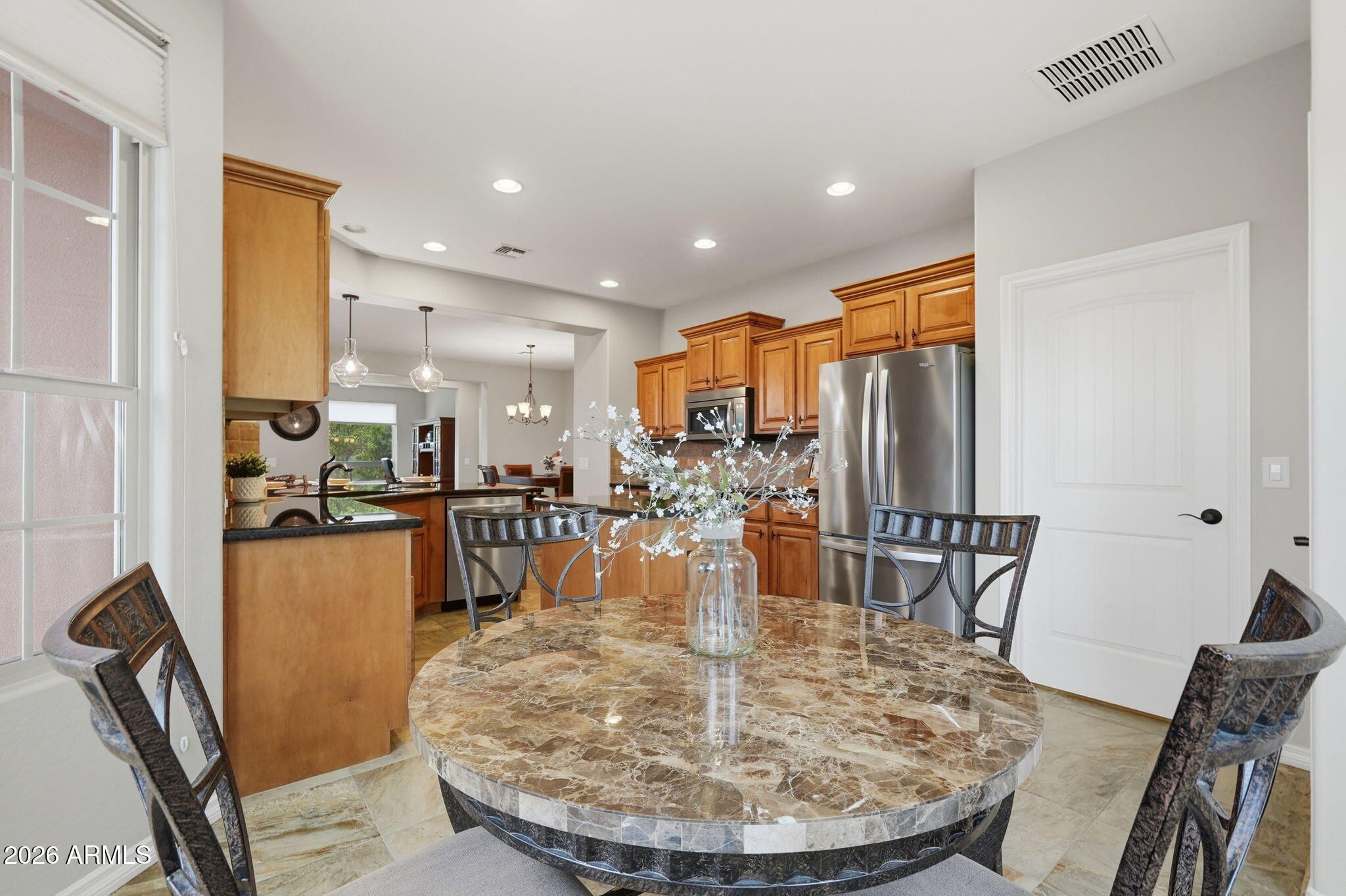 Beautiful corner-lot home in Encanterra Country Club featuring the highly desirable Monaco floor plan! The kitchen offers stone countertops, maple cabinetry, stainless steel appliances, a breakfast bar, and a charming eat-in area, plus a separate dining space for entertaining. Oversized patio sliders create seamless indoor-outdoor living and open to a covered patio with a cozy fireplace—perfect for relaxing or hosting guests. Rare opportunity to skip the golf waitlist: seller holds an existing golf membership allowing immediate golf privileges upon purchase of a membership. Enjoy the Encanterra lifestyle at its finest! Enjoy the Good Life in Encanterra, with pools, Tennis, Pickleball, restaurants, work out facility and so much more!!!