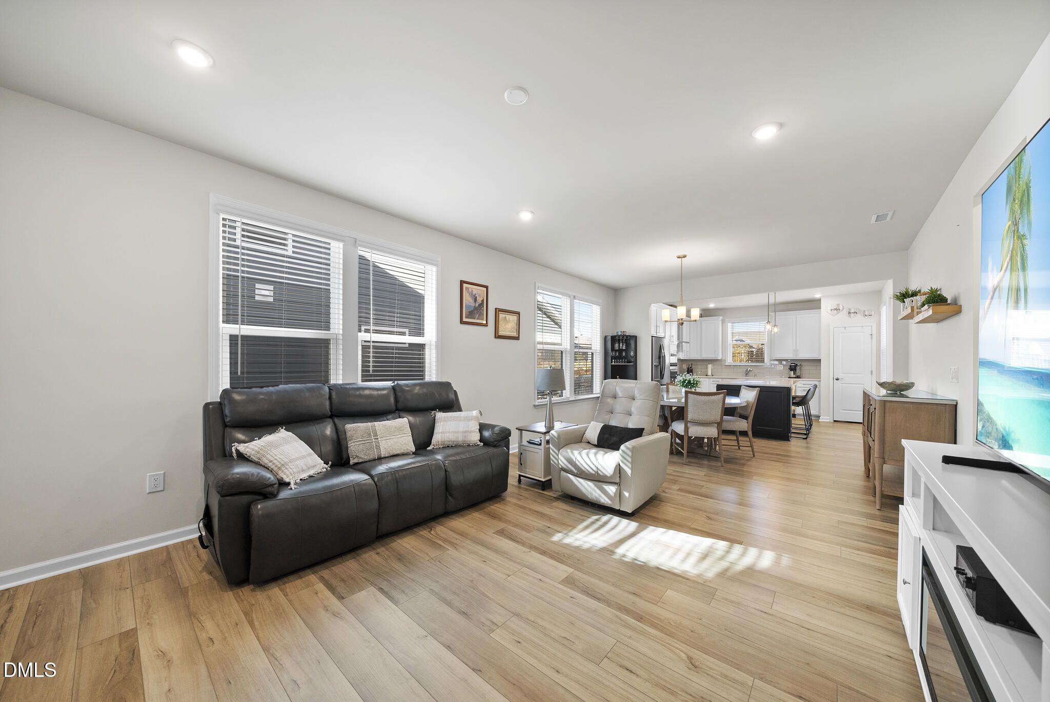New on the Market! Built in December 2024 and just 13 months young, this beautifully maintained home is located in the highly desirable Del Webb Carolina Gardens, one of the region's most vibrant 55+ active adult communities. This popular Compass model with a second level offers the perfect blend of main-level living and flexible bonus space. Featuring 3 bedrooms and 3 full baths, the thoughtfully designed layout provides generous first-floor living with the added benefit of a private second-level retreat—ideal for guests, hobbies, or a home office. Still under full builder warranty, this home delivers peace of mind along with premium upgrades throughout. The exterior showcases durable Hardiplank-style siding, a 30-year architectural shingle roof, and an upgraded radiant barrier roof sheathing for enhanced energy efficiency and year-round comfort. Inside, enjoy luxury vinyl plank flooring throughout the main living areas and primary suite. Just off the foyer, a flex room/home office provides a quiet and versatile space—perfect for working from home, reading, or hobbies. The bright and inviting gathering room features modern LED flush-mount lighting and an open, welcoming feel. The stunning kitchen is a true showstopper, offering upgraded soft-close cabinetry, quartz countertops, a custom tile backsplash, and a sleek built-in wall oven and microwave. The open-concept design flows seamlessly into the dining and living areas—ideal for both everyday living and entertaining. The spacious primary suite is a peaceful retreat with a tray ceiling, a custom-designed walk-in closet, and a spa-inspired en-suite bath featuring quartz counters, upgraded cabinetry, framed mirrors, and a beautifully tiled walk-in shower. Upstairs, stained oak tread stairs lead to a versatile second level complete with a loft, bedroom, full bath, and walk-in storage—perfect for visiting guests, grandchildren, or a creative space. Step outside to relax on the screened patio or enjoy the extended uncovered area, ideal for grilling or outdoor dining. The fenced rear yard adds privacy and functionality, while the fully finished garage is painted and trimmed. An insulated garage door provides seasonal comfort and quieter operation. Additional highlights include upgraded electrical outlets and switches throughout and smart home features such as dual Cat6 media outlets in the gathering room and owner's suite, a video doorbell, smart thermostat, and wireless access prewire. Best of all, this home is just a short walk to the Del Webb Amenities Center, where residents enjoy a heated indoor pool with lake views, outdoor pool, fitness center, pickleball, tennis and bocce courts, walking trails, and beautifully designed gathering spaces. A full calendar of clubs and activities ensures there's always something to enjoy. The monthly HOA includes lawn care and landscaping, Spectrum high-speed internet and cable, and full access to all community amenities—allowing for a truly low-maintenance lifestyle. This is more than just a home—it's a lifestyle upgrade. Don't miss the opportunity to own this pristine, move-in-ready beauty in Carolina Gardens.