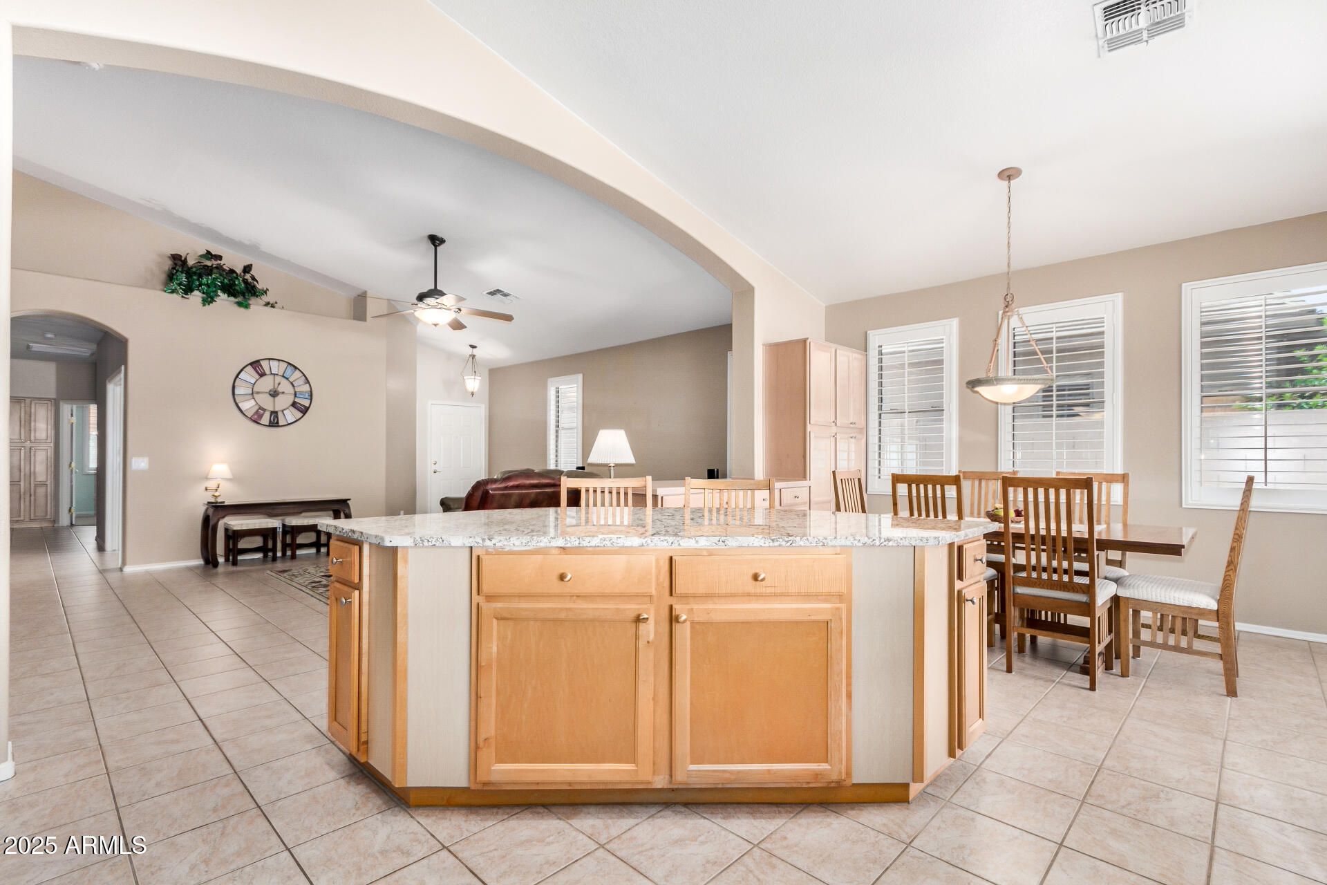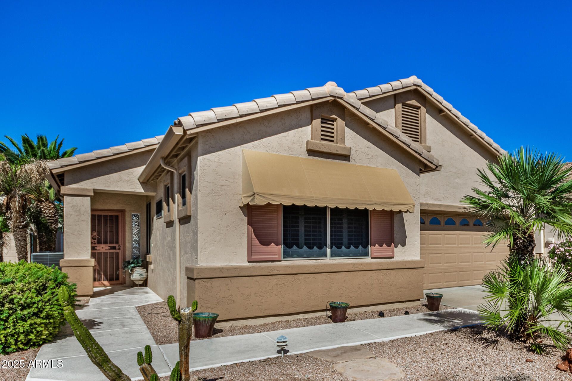 Highly desired 1,696 SF Coronado floor plan with enclosed backyard! Spacious open great room with shutters and neutral tile throughout walkways and baths. The kitchen features granite counters, stainless appliances, gas range, and wood cabinets. Dining area includes additional cabinets and buffet for extra storage. Split floor plan with two bedrooms and an open den — perfect for a home office. Private primary suite with laminate flooring, large bath with step-in shower, and a generous walk-in closet. Guest bedroom is split at the front for added privacy. Laundry room with plenty of cabinets and deep sink. Enjoy the private fenced backyard with a full covered patio, natural gas line for BBQ, coated concrete, and low-maintenance hardscape. Additional features include solar tubes, garage cab inets, and a water softener.