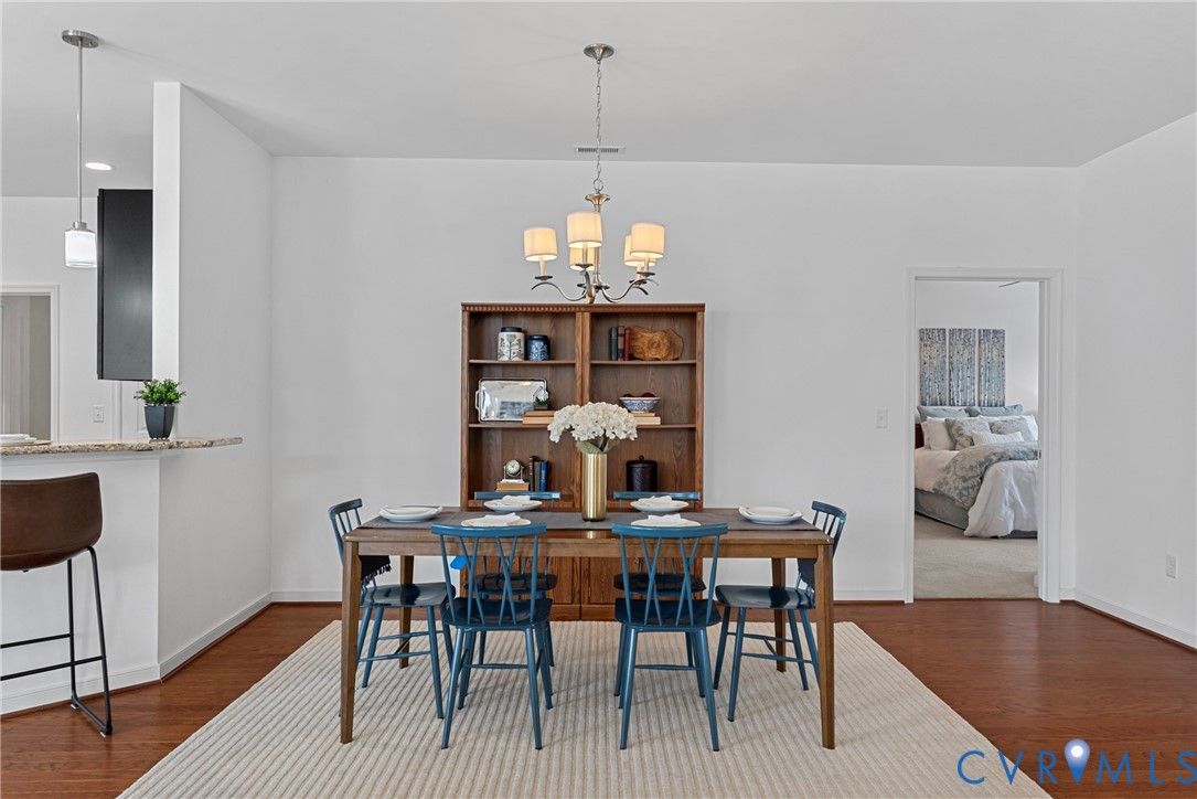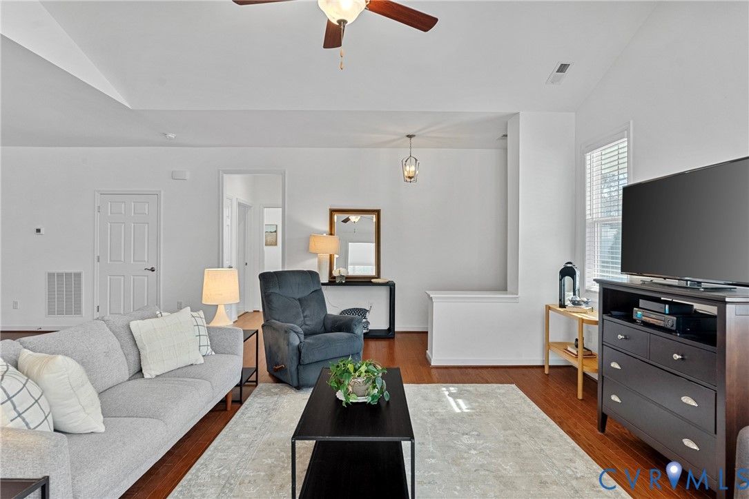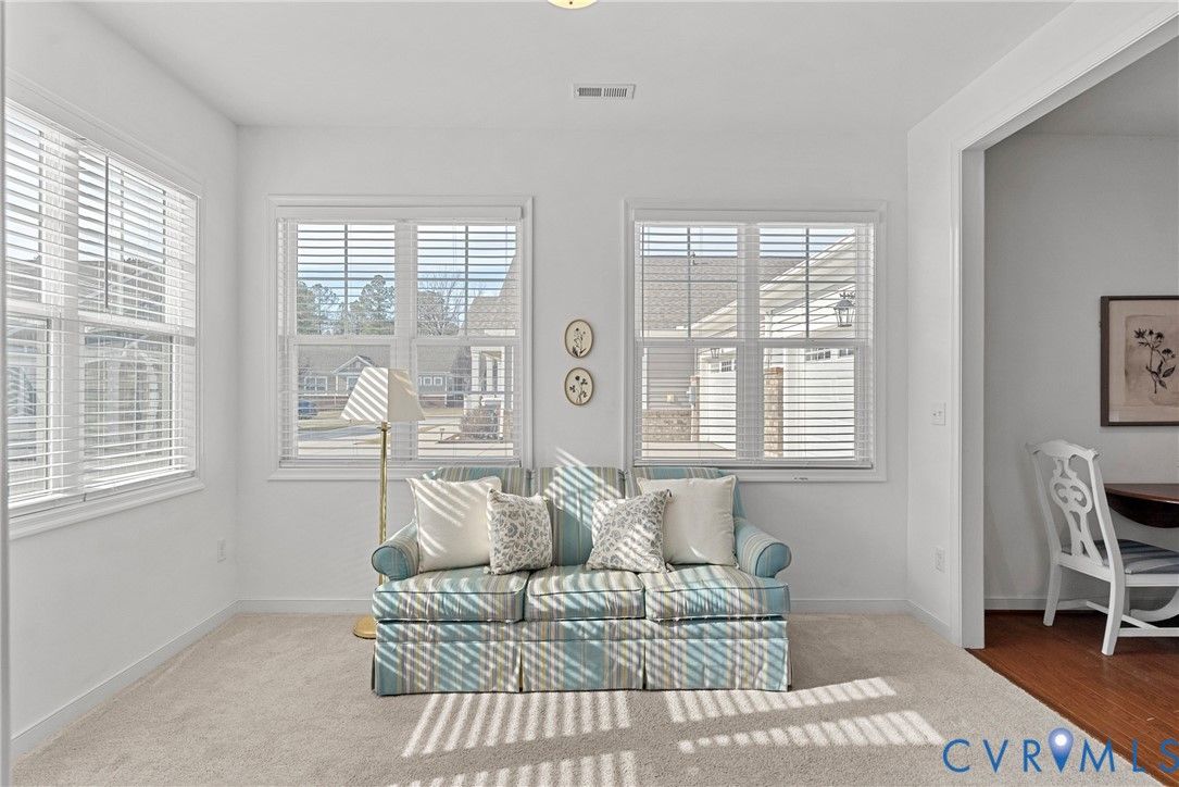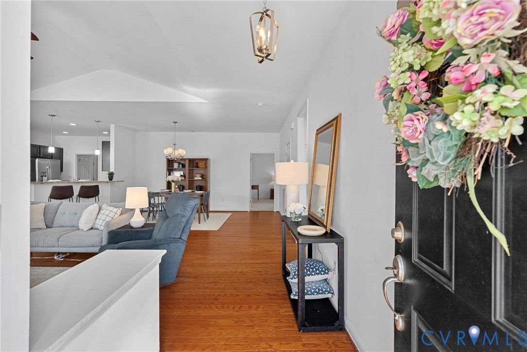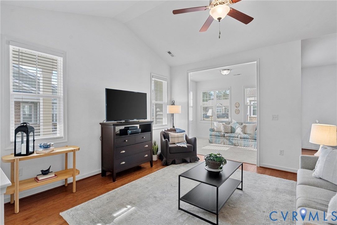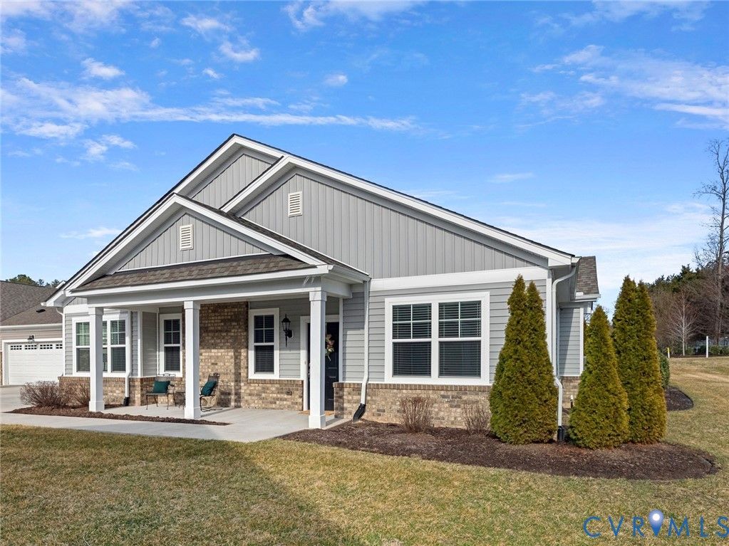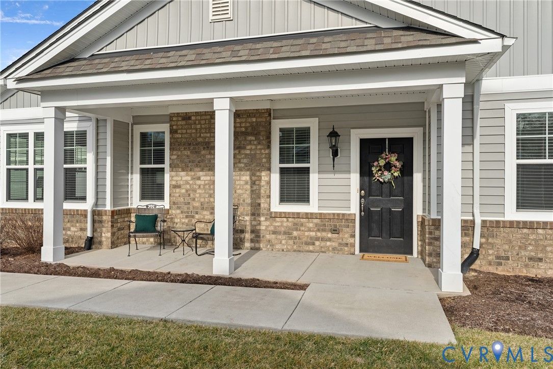 Welcome to The Villas at Providence, a sought-after 55+ community in the heart of Chesterfield County. With quick access to Powhite Parkway and Route 288, getting anywhere in the Richmond area is easy—while dining, shopping, grocery, and top-tier medical care are just minutes away. Tucked in a peaceful setting, The Villas offers maintenance-free living, giving you time to enjoy each day. Step inside a welcoming foyer and discover hardwood floors throughout the main areas creating a warm and polished feel from the start. The vaulted living room is spacious and inviting, complete with a ceiling fan and an open layout flowing seamlessly into the kitchen and dining room, perfect for everyday living and entertaining. The dining room offers generous space for hosting family gatherings and celebrations. The large kitchen features bar seating, abundant cabinetry and counter space, stainless steel appliances, and a granite countertops. A large pantry offers excellent storage, and the deep double-bowl sink adds both function and style. For casual meals or morning coffee, enjoy the cozy breakfast nook just off the kitchen. Beyond the main living area, a sunroom offers a peaceful retreat filled with natural light—perfect for unwinding with a book. The primary suite offers two large walk-in closets, a ceiling fan with light, and wood blinds. The en-suite bath features tile floors, a zero-entry tiled shower with a built-in seat and grab bars, a double adult-height vanity, an oversized linen closet. Two additional bedrooms offer flexibility for guests or a home office, with a full bath conveniently located between them. Off the kitchen, you’ll find a spacious laundry room with a closet for extra storage. The oversized two-car garage includes an automatic door opener, plenty of room for vehicles, closet storage, and a pull-down attic. This beautifully maintained community features irrigated green spaces, manicured grounds, and a charming neighborhood gazebo—perfect for gathering with friends.