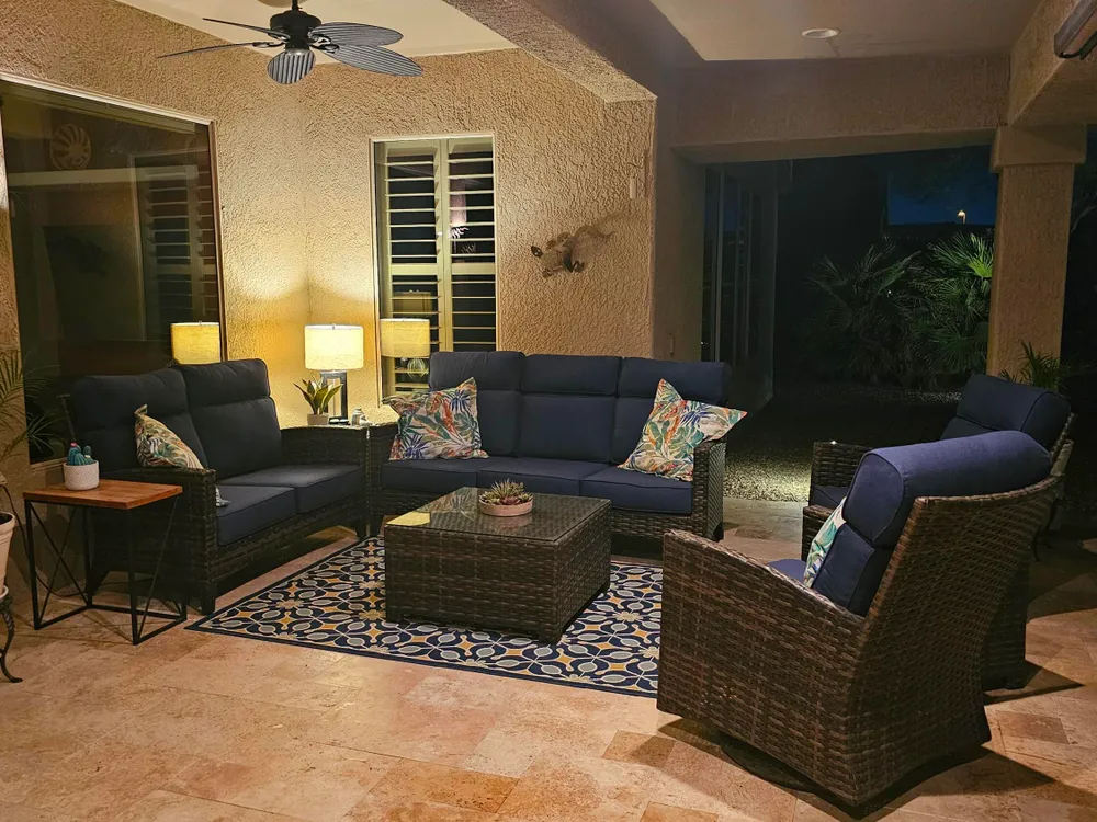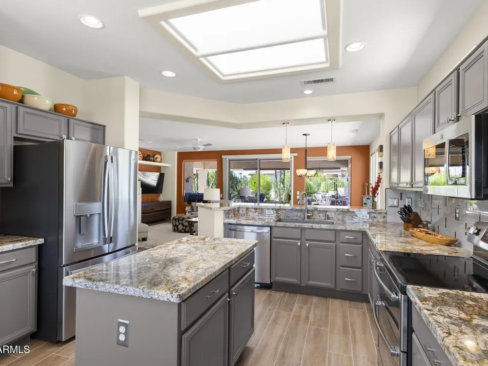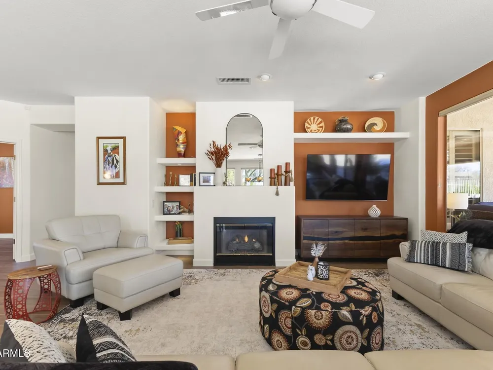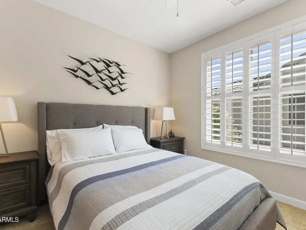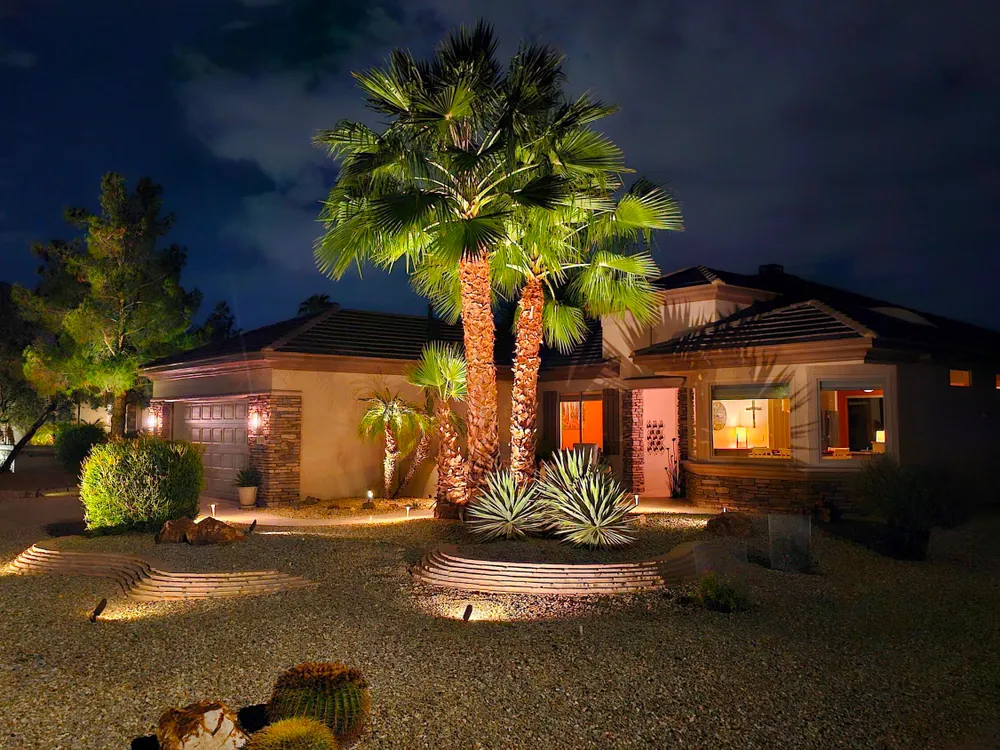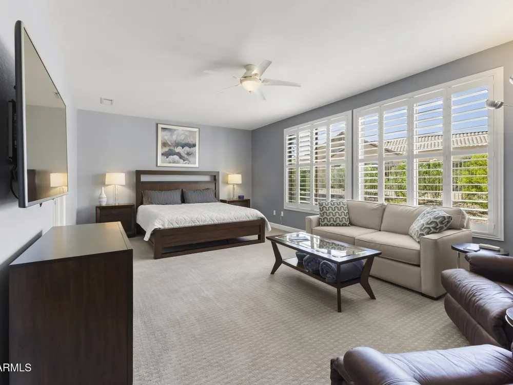 Uniquely positioned with picturesque views of both the undulating green of the 4th hole on one side and scenic views of the 5th tee box and fairway from the bay window out front! There are Golf views from almost every room in the house! The open-floorplan is evenly lit with abundant natural light from all the large picture windows! The bright kitchen has absolutely gorgeous granite countertops, stainless steel GE appliances, designer pendant lights, a center island and pantry and even a touchless faucet! The entertainment wall is newly remodeled with built-in dimmable accent lighting, a gas fireplace and a spacious place for your large screen TV! Spoil yourself in the expansive 23' x 13' master suite with its bright en-suite bathroom and spacious walk-in closet! The owned solar system: You'll have low utility bills with the completely owned solar system (no payments!), the beautiful energy-efficient Renewal by Anderson windows and newer Trane furnace and A/C! The Trane furnace even has a UV light to eliminate germs, viruses and mold spores! New and inviting tile floors were also added this summer throughout in all but the bedrooms! You'll enjoy many other features including a whole house hot water recirculator for quicker hot water at all sinks and showers as well as the smart technologies like the app savvy intelligent Nest Thermostat and the Bhyve sprinkler system controller - you can control the temperature inside and the watering schedule even while you're away for the summer or on a long trip! French doors were added to the study to allow it to serve as a private office or a third bedroom when extended family comes to visit! Entertain your friends and family in the on the extended and covered travertine patio and the large gas firepit in the privacy of the lush landscaping or just relax with the gentle sounds of the water feature! Your new home shows off well at night as well with an abundance of accent landscape lighting! This house is more than just a place to liveit's a place to thrive. Whether you're hosting gatherings with friends or family, preparing meals in the gourmet kitchen, or just enjoying quiet evenings by the firepit in your own private backyard oasis, you'll find comfort at home!