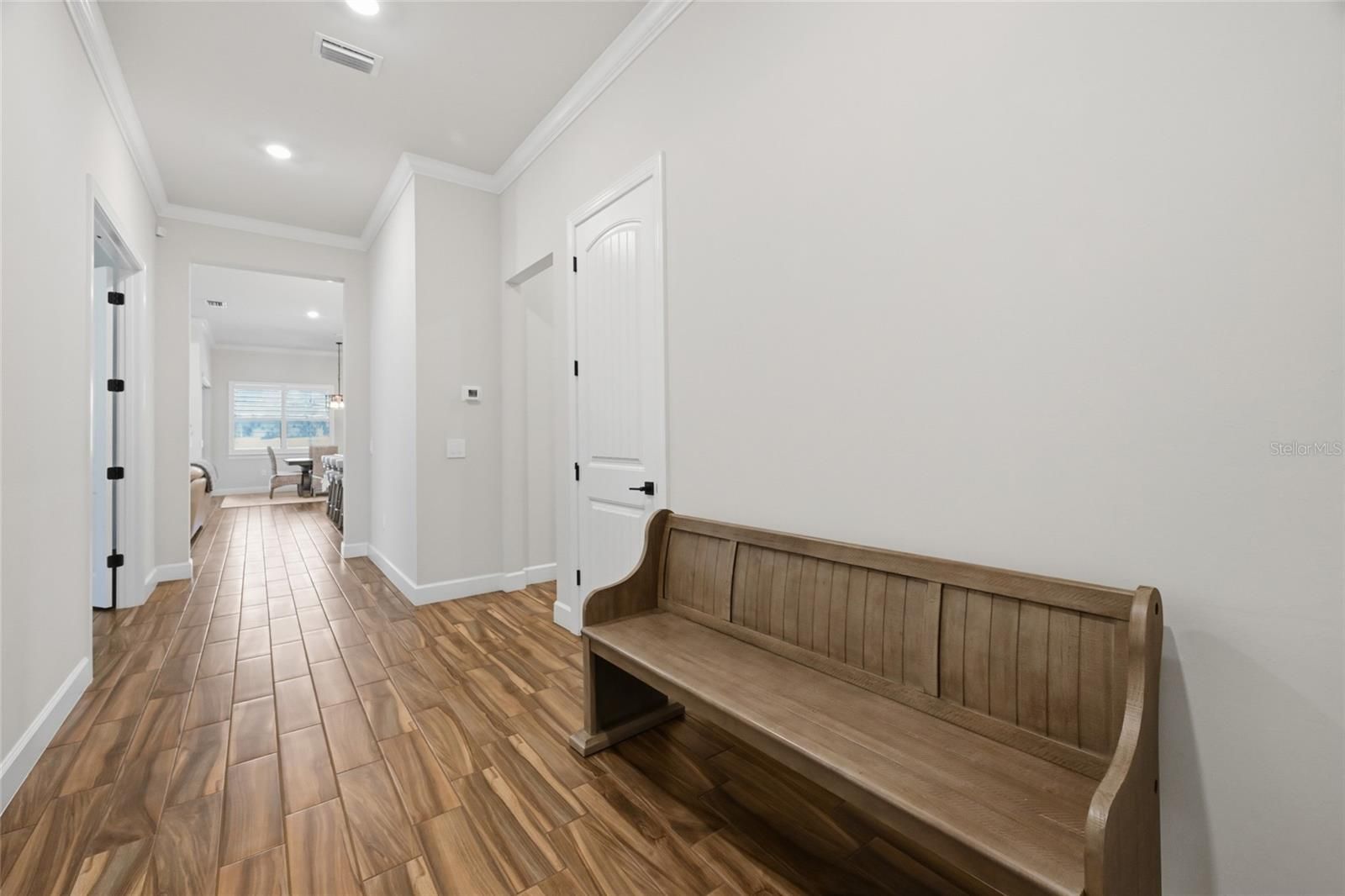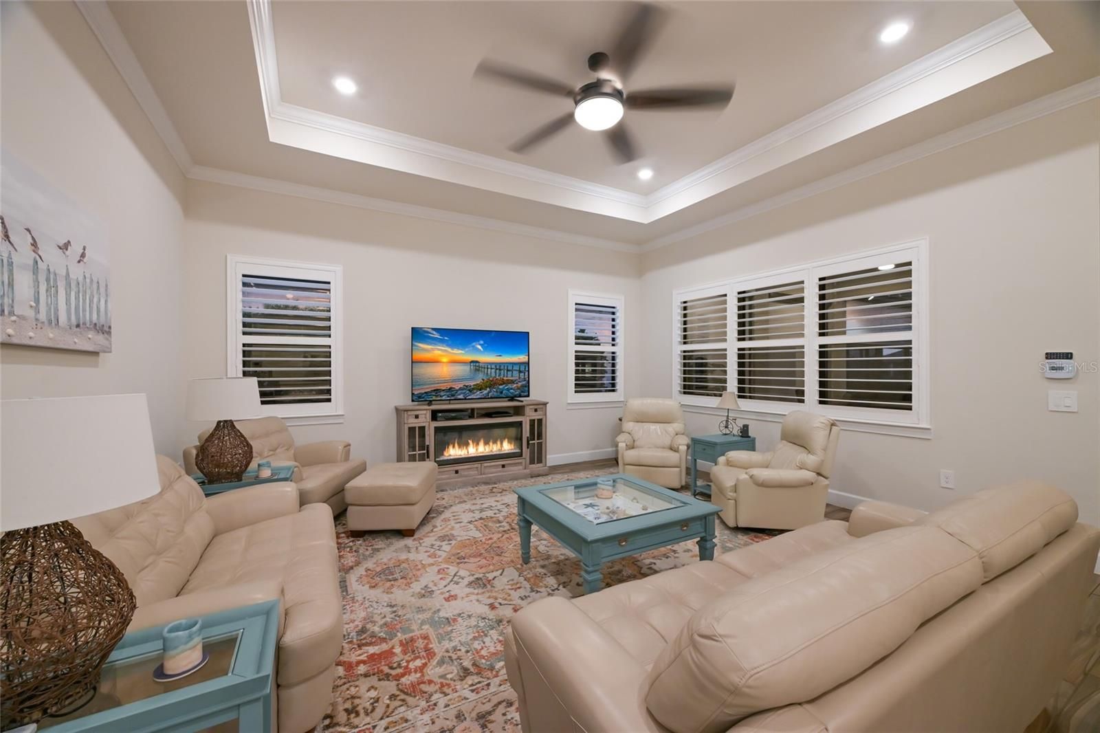 - Ceiling Fan(s), Crown Molding, Eat-in Kitchen, High Ceilings, In-Wall Pest Control, Kitchen/Family Room Combo, Open Floorplan, Main Level Primary, Solid-Wood Cabinets, Split Bedrooms, Stone Counters, Thermostat, Tray Ceiling(s), Walk-In Closet(s), Window Treatments