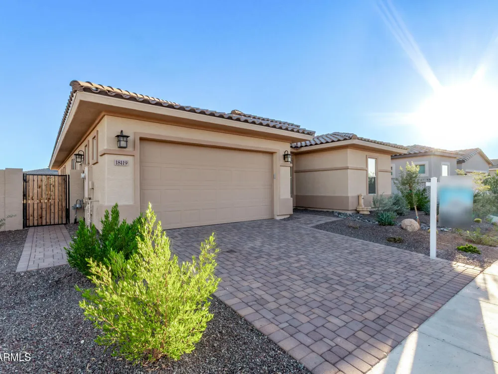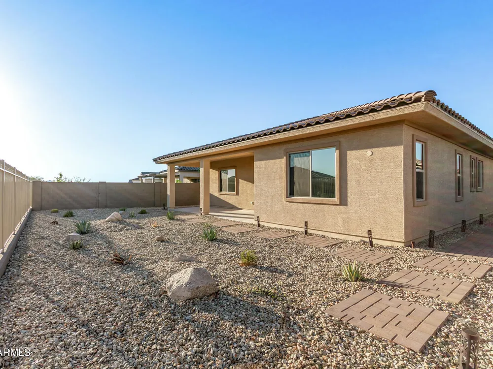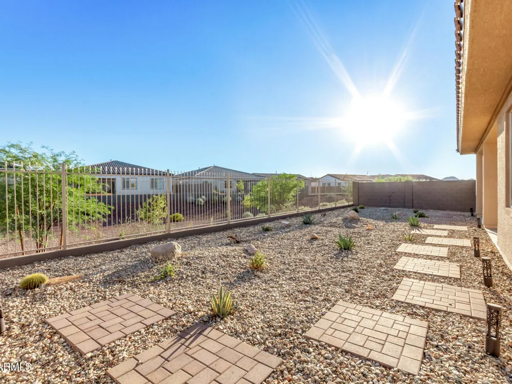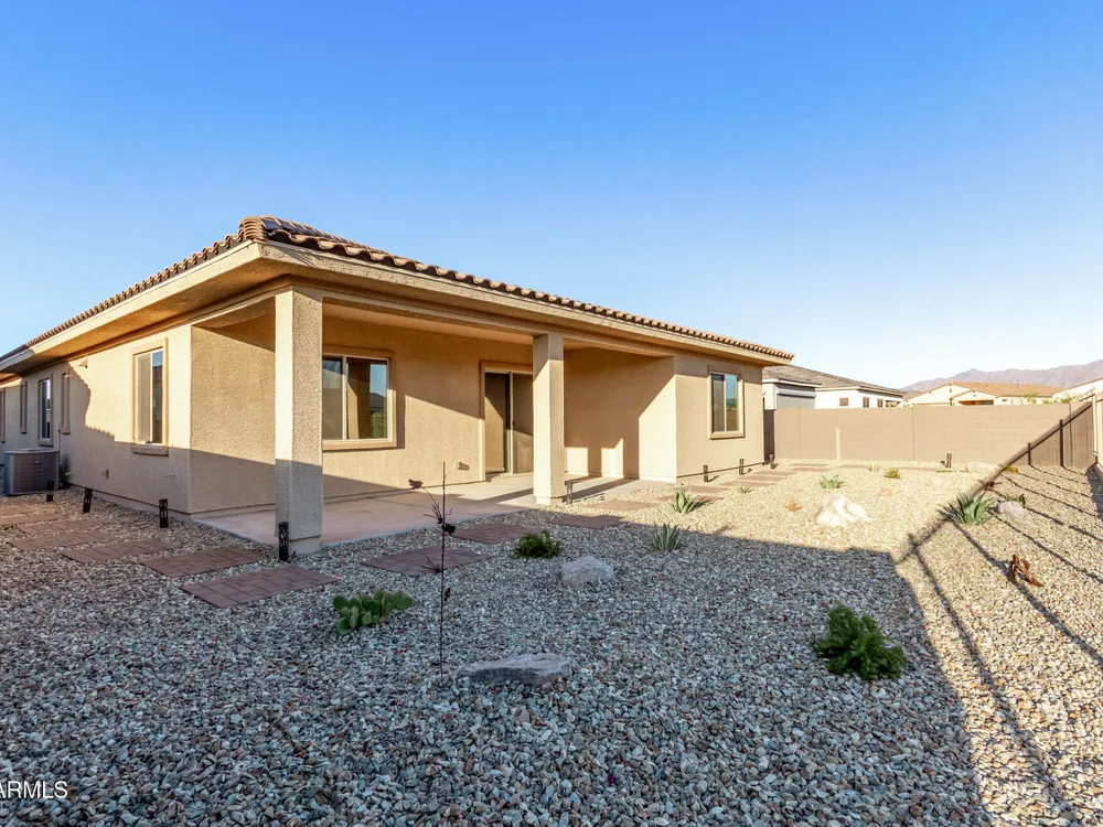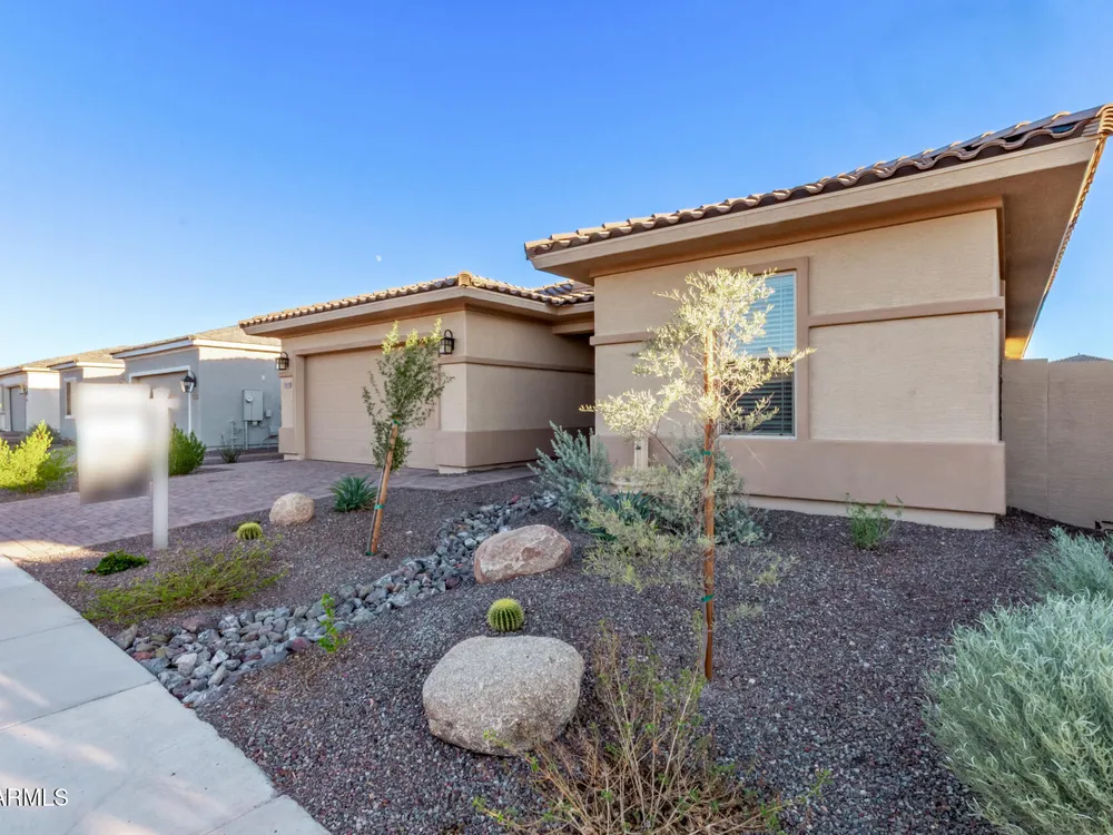 Your ideal haven is here in the gated 55+ CantaMia! Offering a spacious almost new expanded Hillary model w/3 beds + den & separate flex space, 2.5 baths, 2-car garage. Fabulous interior showcases desirable open floor plan paired with wood tile flooring. Impressive kitchen boasts high-end appliances, walk-in pantry, quartz counters, tiled backsplash and island. Split main bedroom with dual sinks, separate tub/shower, & large walk-in closet. 2 guest bedrooms w/shared bath. Relax in your fenced backyard w/mtn views, desert landscape & covered patio! Community amenities include 29,000 SF Village Center w/resort-style pools, fitness studios, arts & crafts, a cafe, and library. Residents enjoy pickleball, tennis, bocce, scenic lakes, walking trails, and wide variety of clubs & social activitie