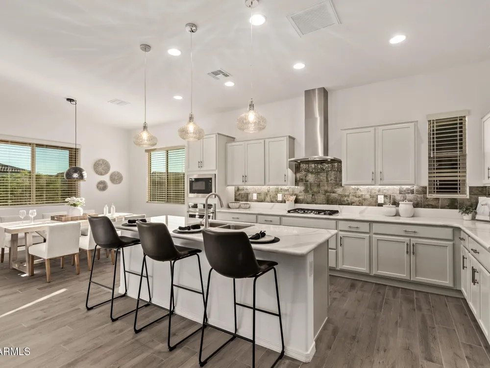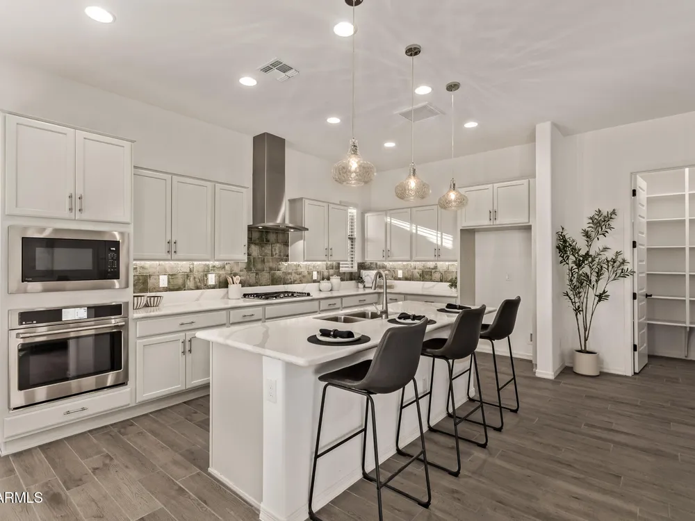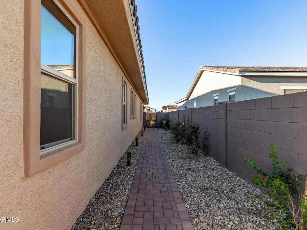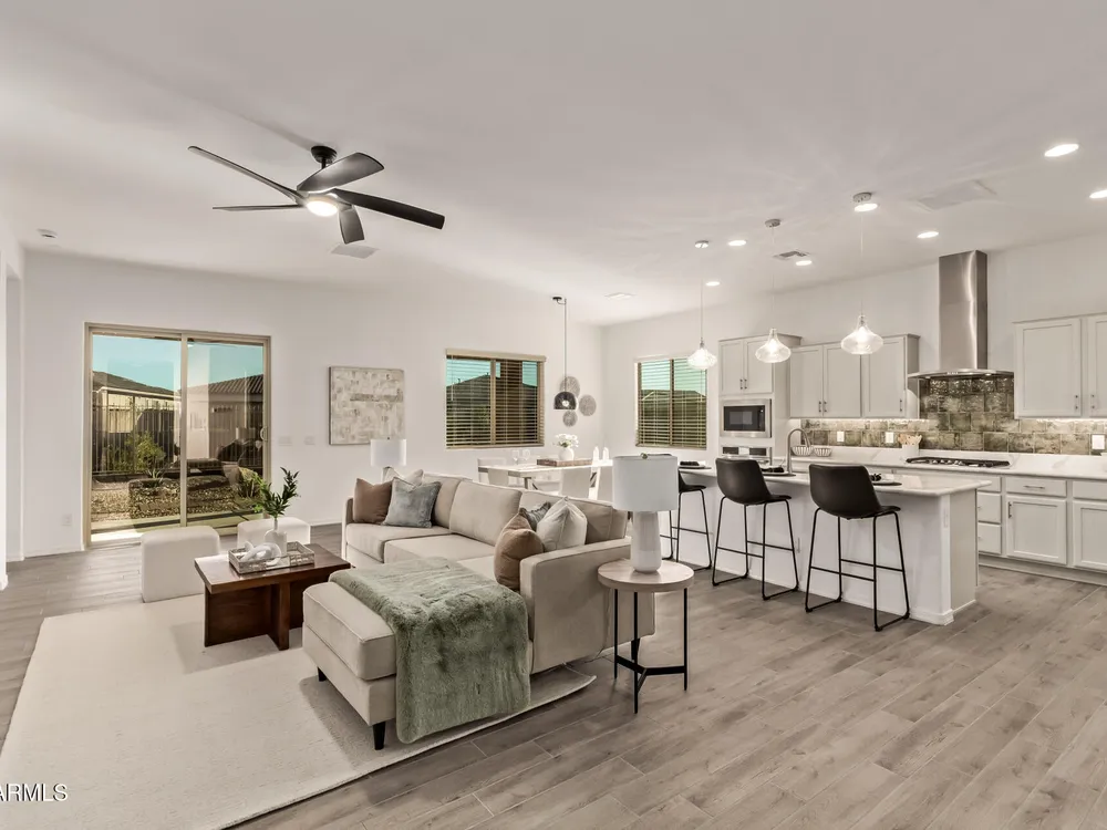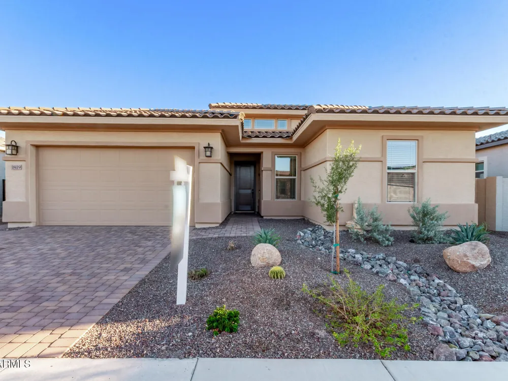 Your ideal haven is here in the gated 55+ CantaMia! Offering a spacious almost new expanded Hillary model w/3 beds + den & separate flex space, 2.5 baths, 2-car garage. Fabulous interior showcases desirable open floor plan paired with wood tile flooring. Impressive kitchen boasts high-end appliances, walk-in pantry, quartz counters, tiled backsplash and island. Split main bedroom with dual sinks, separate tub/shower, & large walk-in closet. 2 guest bedrooms w/shared bath. Relax in your fenced backyard w/mtn views, desert landscape & covered patio! Community amenities include 29,000 SF Village Center w/resort-style pools, fitness studios, arts & crafts, a cafe, and library. Residents enjoy pickleball, tennis, bocce, scenic lakes, walking trails, and wide variety of clubs & social activitie