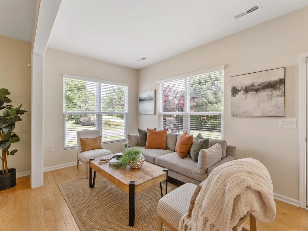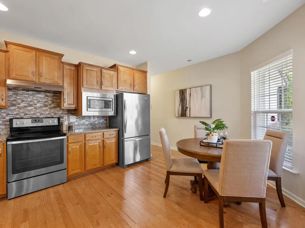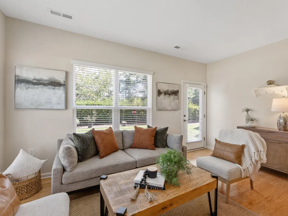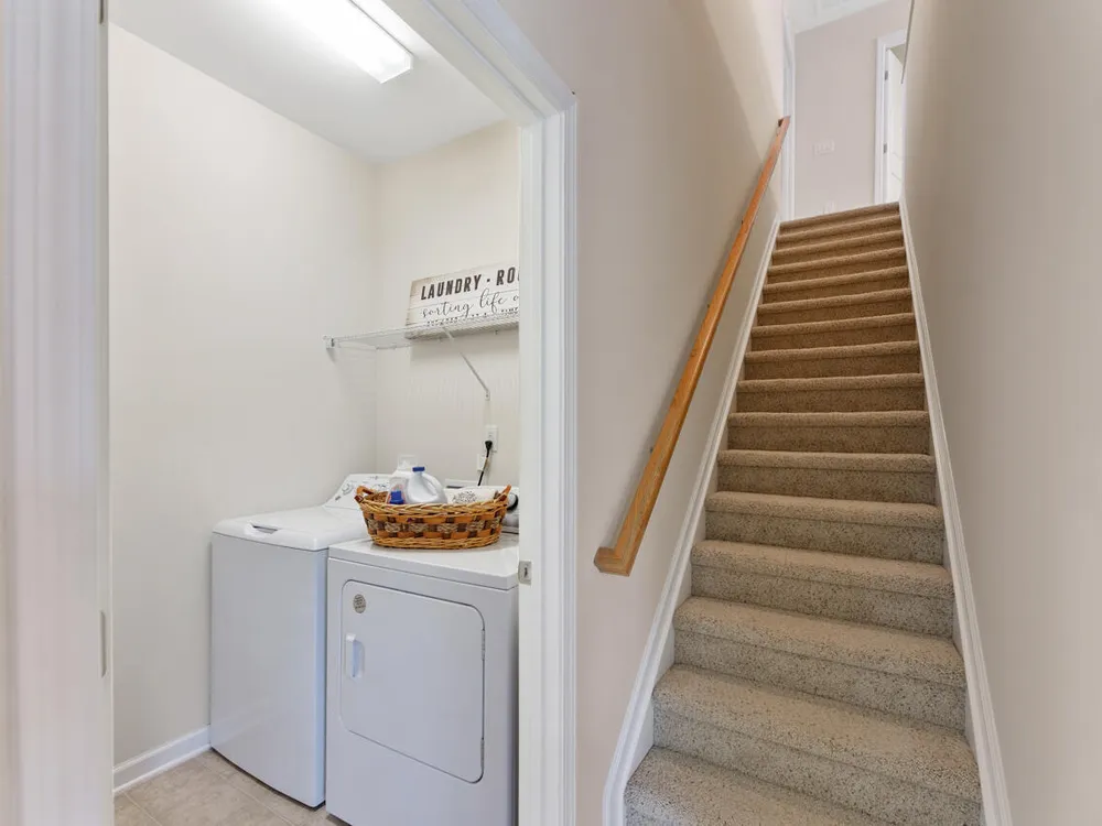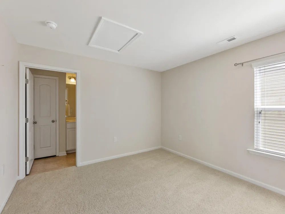 Welcome to 1812 Horne Creek Dr in Durham, NC! This spacious 2,002 sq ft home on a corner lot offers the perfect blend of comfort and convenience along with tons of natural light. It has three bedrooms and three full baths with the primary and a secondary bedroom on the main level. The main-floor owners' suite is a true retreat with a huge walk-in closet, fresh paint and brand-new carpeting. Upstairs, you'll find a third bedroom, a versatile loft space bonus room, and plenty of storage space, including a full-length dual-entry closet and walk-in attic access. The two car garage has a built-in sink, perfect for washing a pup or cleaning the garden tools. This home is full of thoughtful updates, including much fresh paint, a new HVAC (2025), and new carpeting in both of the downstairs bedrooms. The kitchen comes complete with all appliances (fridge, dishwasher, disposal, microwave), AND the first floor laundry room includes washer and dryer (2024) with purchase so you can move in and start living! Enjoy the cozy sunroom off the living room, perfect for relaxing or reading, and a back patio with just the right amount of space for your outdoor furniture and grill. Plus, with a blank canvas yard, you have the opportunity to add your personal touch and create your dream outdoor space. No mowing necessary as the HOA takes care of that. Located in the desirable Carolina Arbors community, you'll have access to top-tier amenities, including a massive clubhouse, indoor and outdoor pools, hot tub, gym, pickleball courts, basketball courts, dog parks, and walking trails. All this is just a 5-minute drive to shopping, dining, and everything you need.