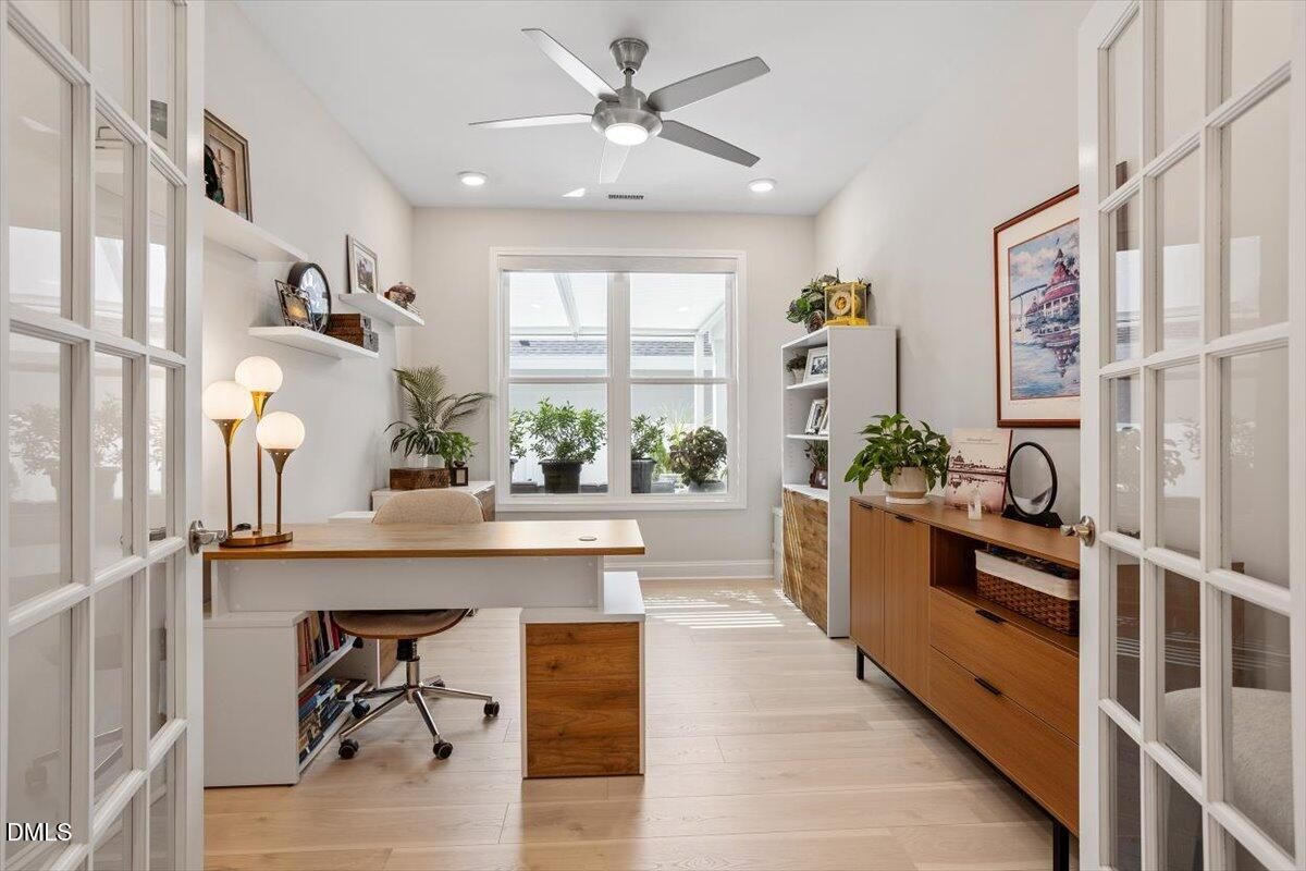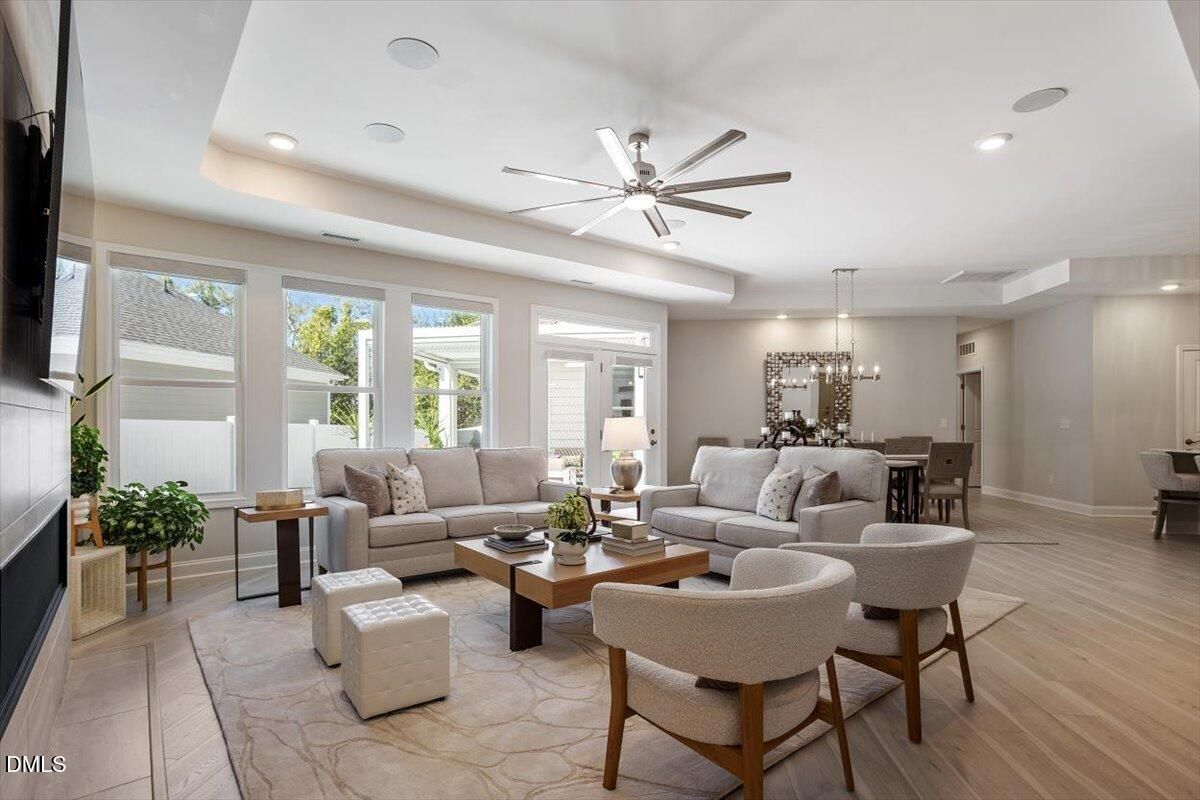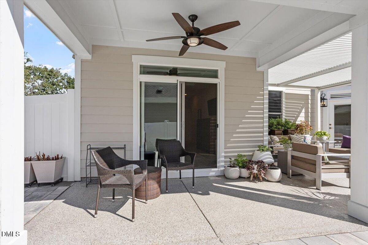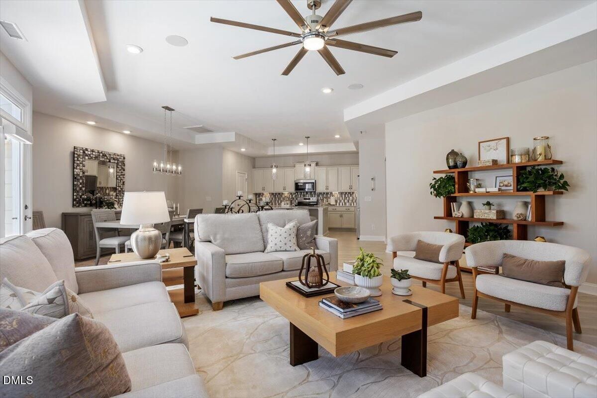 Step into easy living & luxury in this thoughtfully upgraded ranch home in Fuquay-Varina's Highridge community. This single-level floor plan was built in 2022 and upgraded from top to bottom. The open living area features abundant natural light, upgraded trim, and wide-plank LVP floors throughout. A chef's kitchen with quartz counters, designer backsplash, under-cabinet lighting, and a large island flows seamlessly into the dining and living spaces. The custom backlit gas fireplace is a striking focal point, while motorized blinds and upgraded lighting add everyday convenience. The primary suite offers a spa-like zero-entry shower, walk-in closet, and direct access to the private courtyard patio. Outdoor living shines with an extended epoxied patio, pergola, privacy fence, and wooded buffer. Additional highlights include French doors on the office, a fully finished laundry with cabinetry and sink, ceiling fans, and an epoxied garage floor. High ridge offers sidewalks, pocket parks, and a dog park—all minutes downtown Fuquay-Varina's shops, dining, and breweries and the new Gold Leaf Crossing Shopping Center that will feature a new Target and high-end retail and dining. Low HOA dues also include yard maintenance for a true low-maintenance lifestyle. A must see!