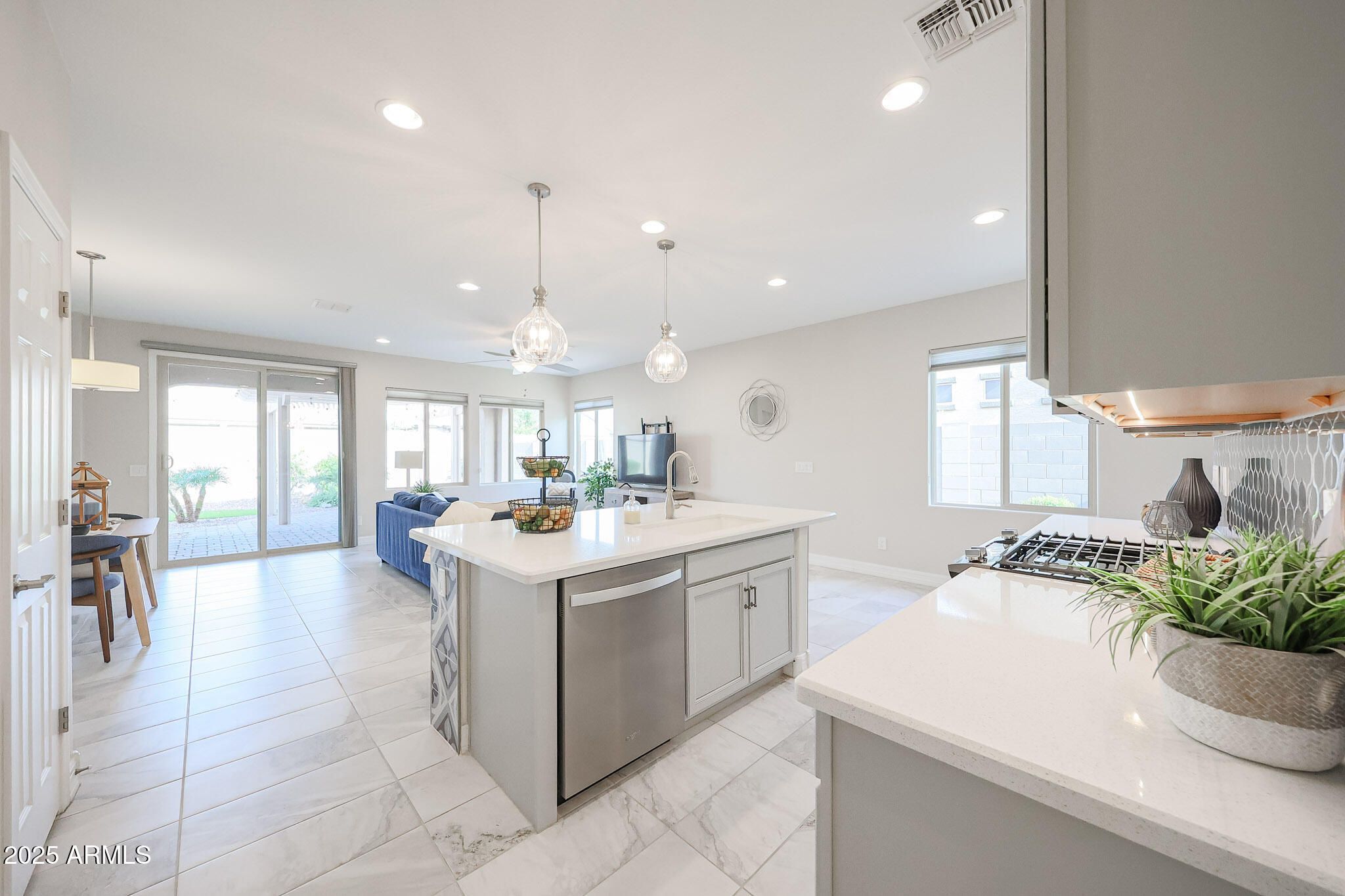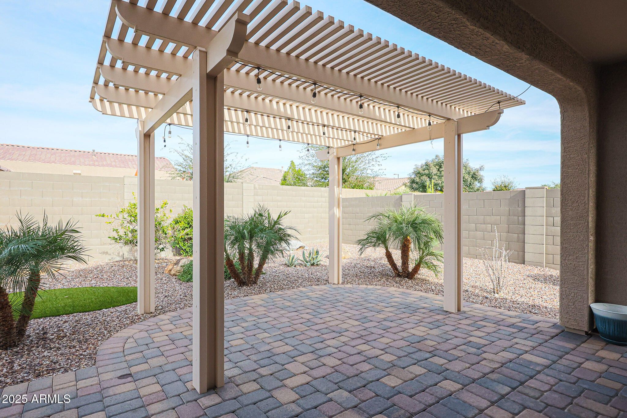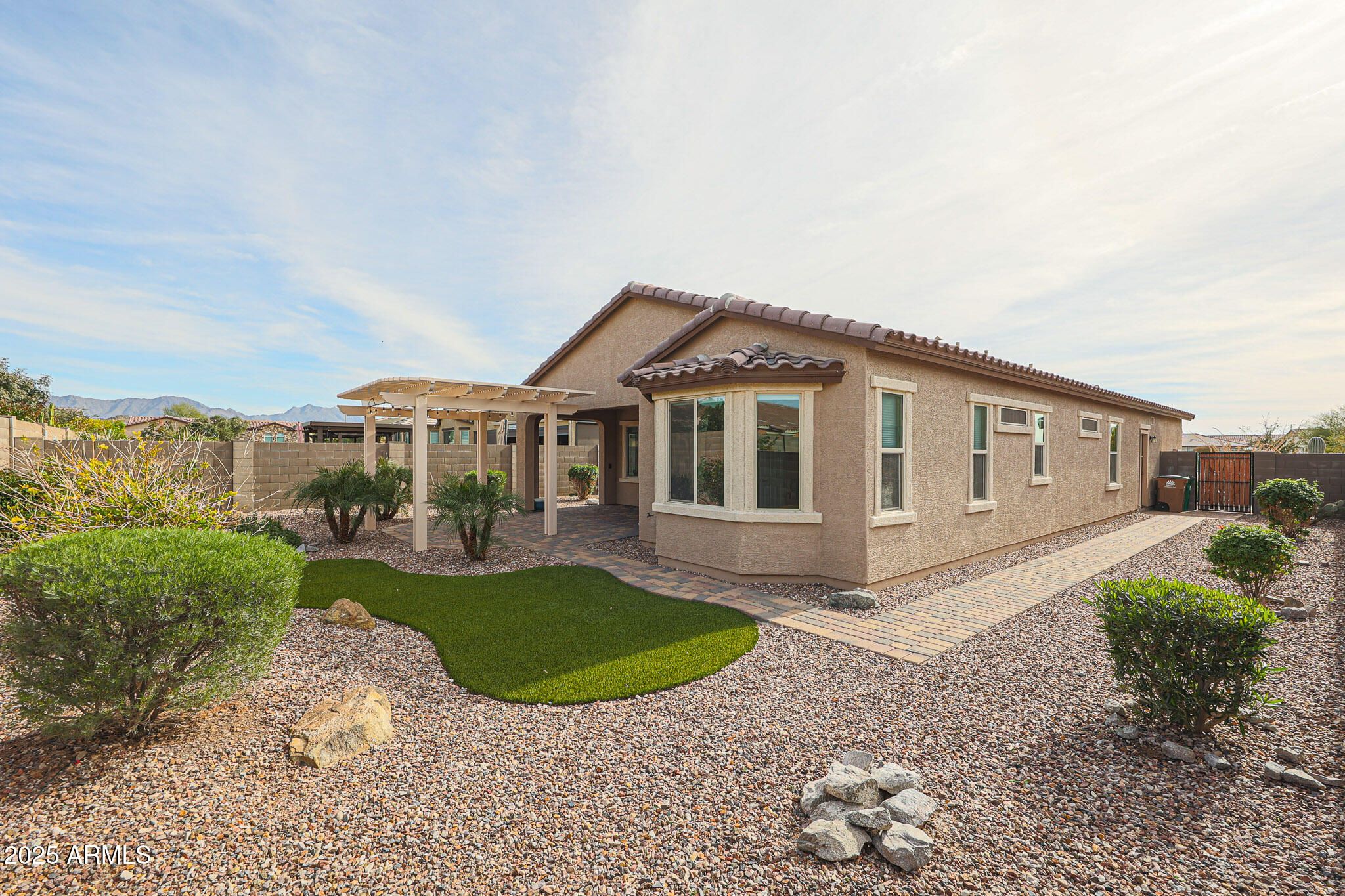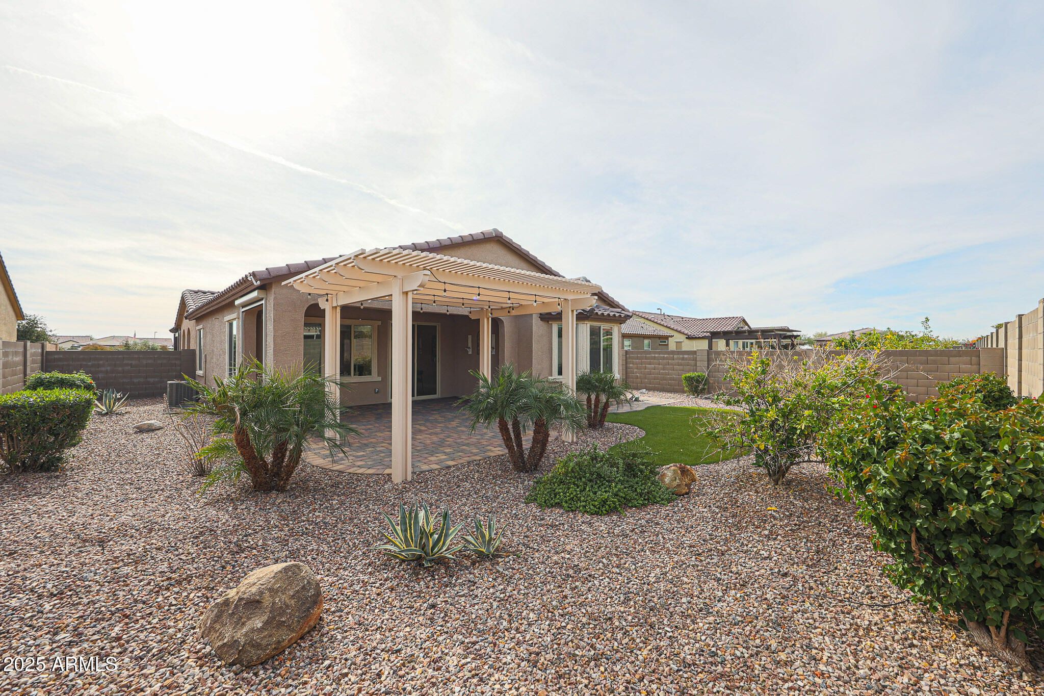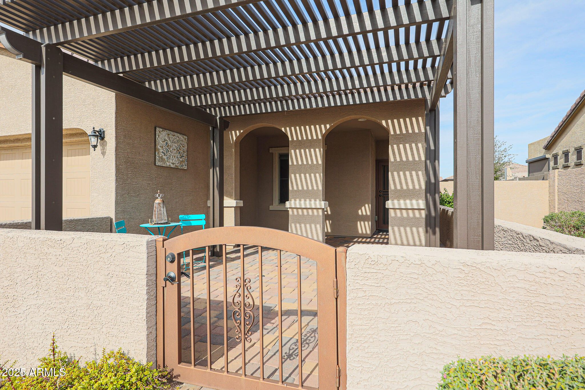 Welcome home to this light-filled and highly sought-after Libretto floor plan, where comfort, style, and easy living come together beautifully. This 2-bedroom, 2-bath home with a versatile den/flex space features upgraded tile throughout all high traffic areas and a thoughtful layout designed for both everyday enjoyment and entertaining. The charming gated front porch/courtyard offers a spacious pergola that creates a welcoming retreat- perfect for morning coffee or evening conversations with friends. Inside, the bright and open kitchen is the heart of the home, showcasing soft gray cabinetry, a gas stove, a tile-accented island, and elegant pendant lighting that flows seamlessly into the dining area and great room. The private primary suite feels like a personal sanctuary with its bay window and spa-inspired bath featuring dual sinks and a large walk-in shower with a built-in bench. The garage adds extra convenience with built-in storage cabinets and a water softener. Step outside to a fully enclosed, low-maintenance backyard oasis complete with artificial turf, palm trees, a covered patio, and an extended paver patio with pergola - plus a mechanical sunshade on the east side to keep summer afternoons cool and comfortable. Located in the award-winning 55+ resort-style community of CantaMia, this home offers far more than just a place to live. Residents enjoy indoor and outdoor pools, a state-of-the-art fitness center, pickleball and tennis courts, scenic walking trails, creative arts studios, on-site dining, and a vibrant social calendar - delivering a lifestyle centered on wellness, connection, and relaxation.