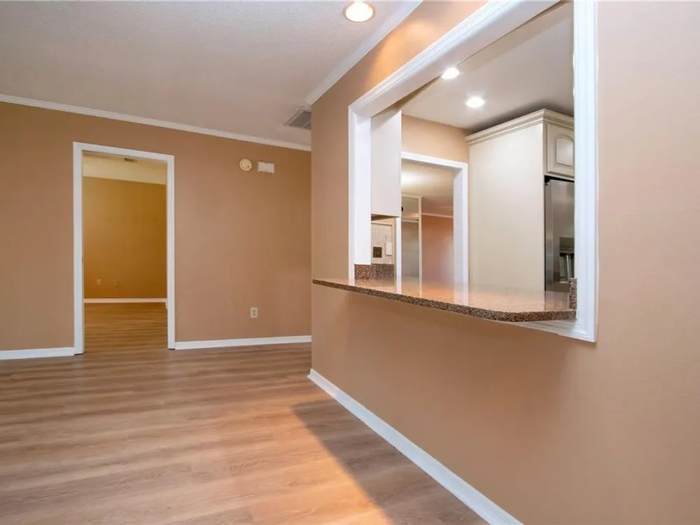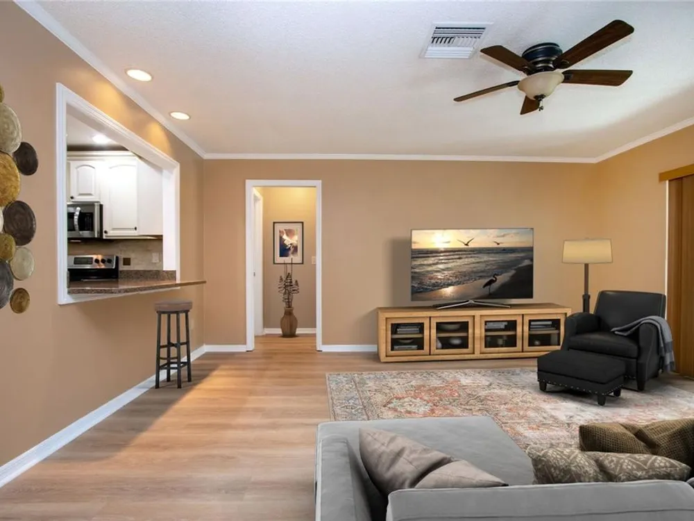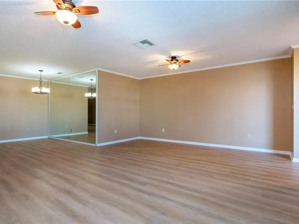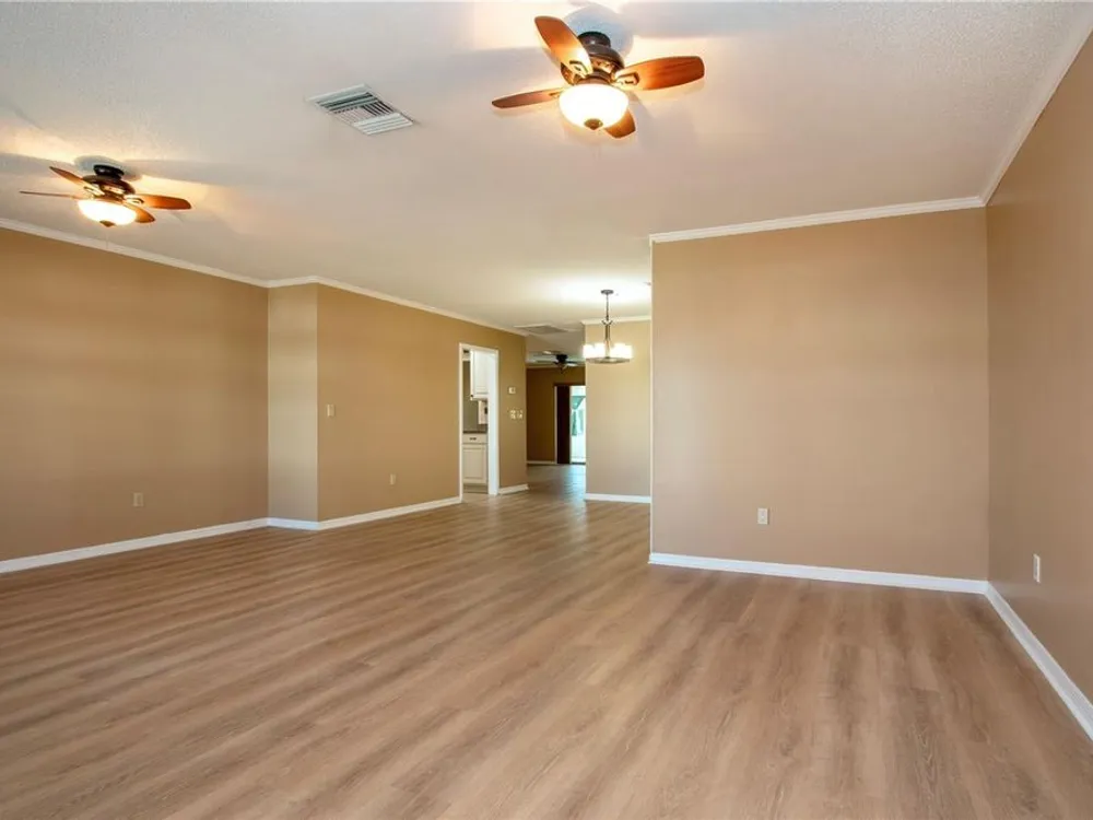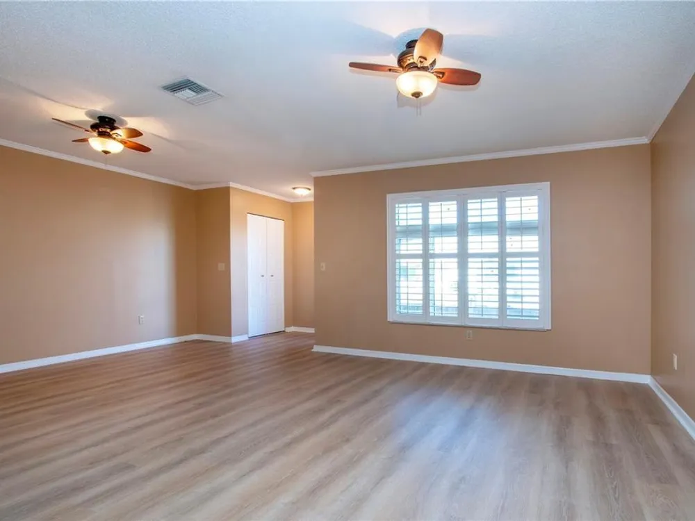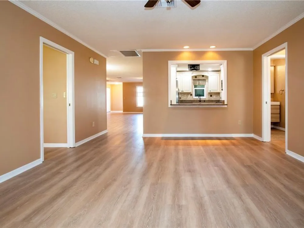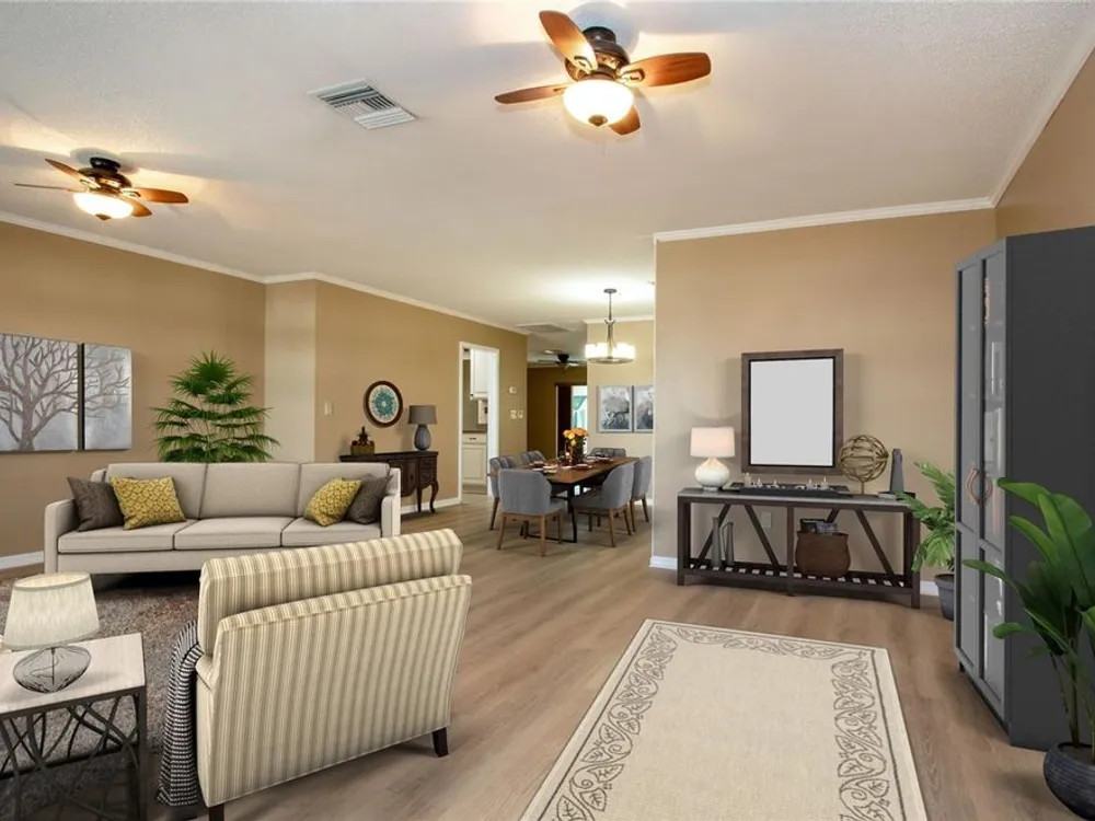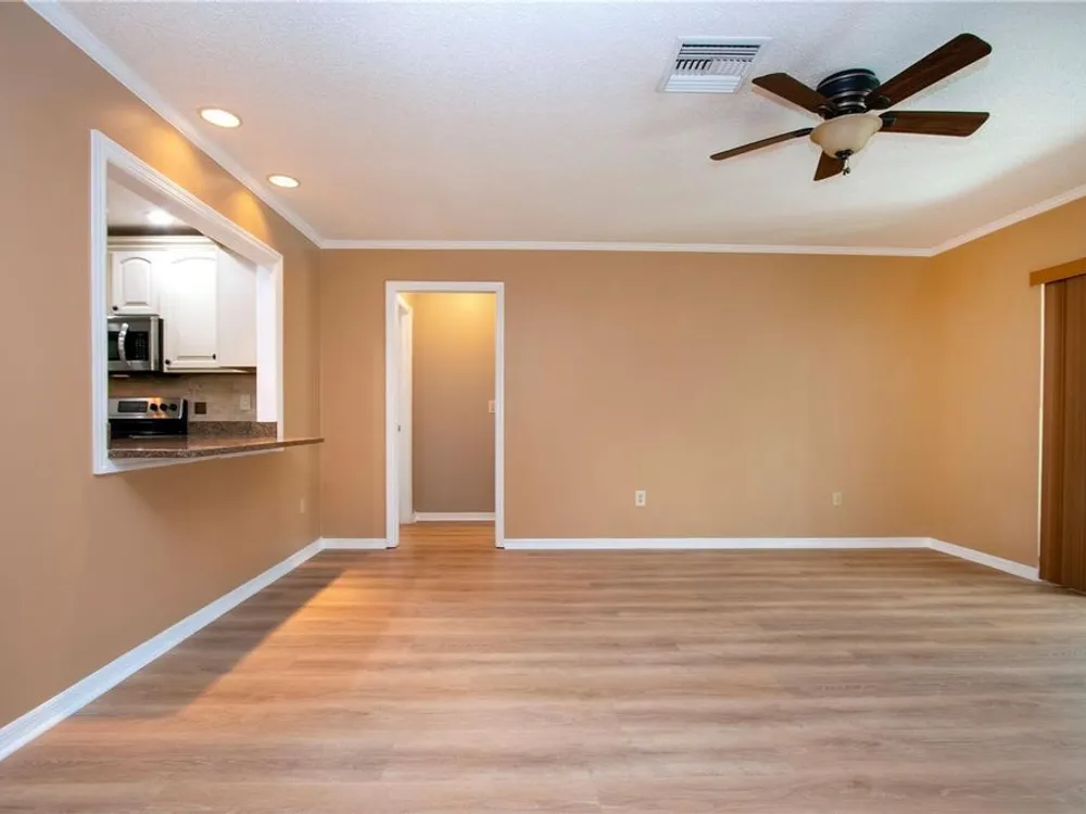 - Ceiling Fan(s), Crown Molding, Living/Dining Room, Open Floorplan, Split Bedrooms, Stone Counters, Thermostat, Window Treatments