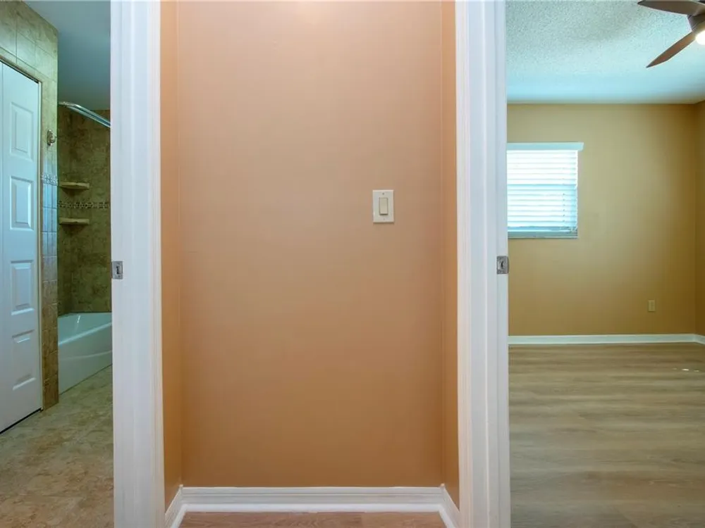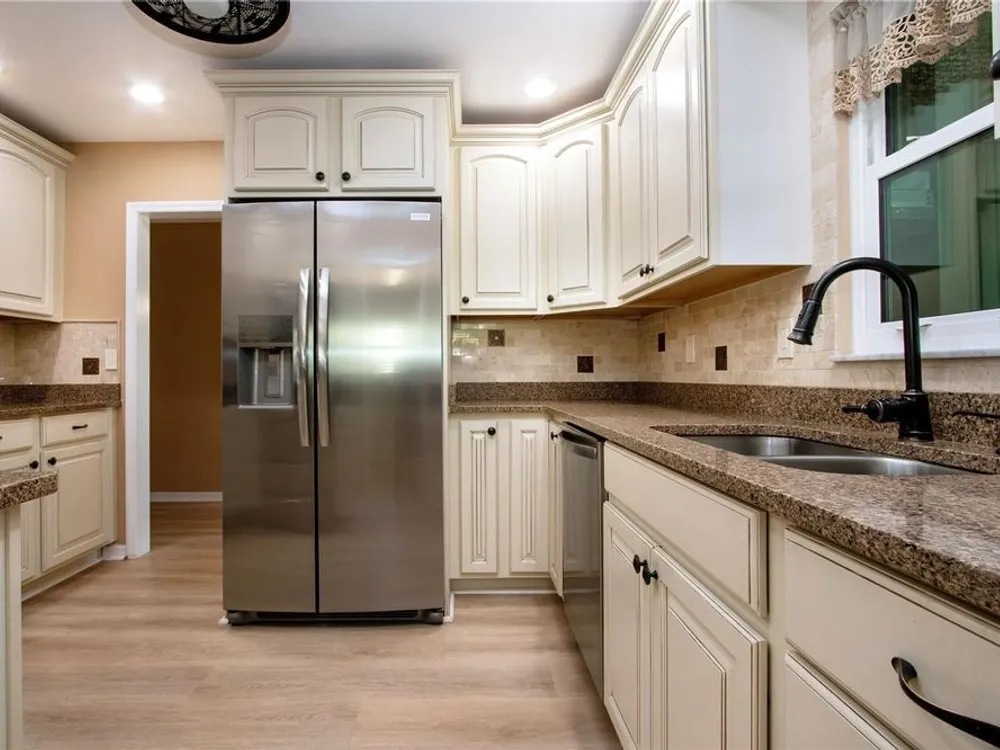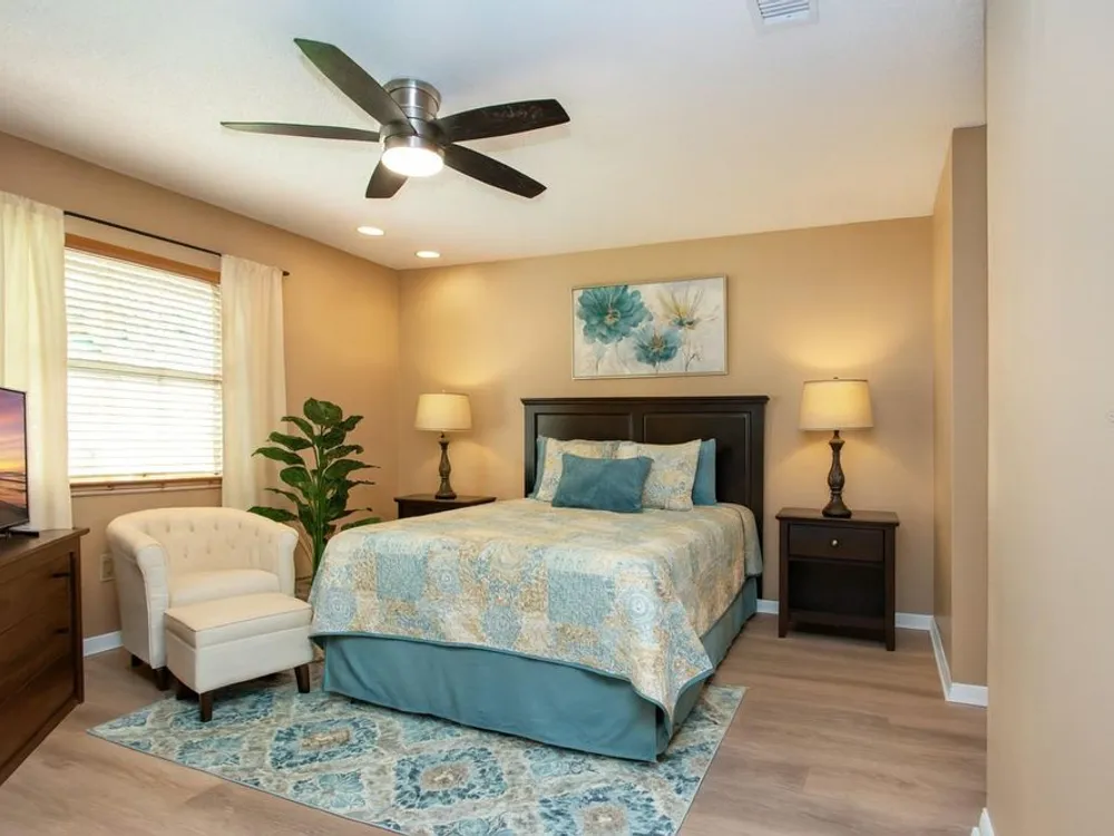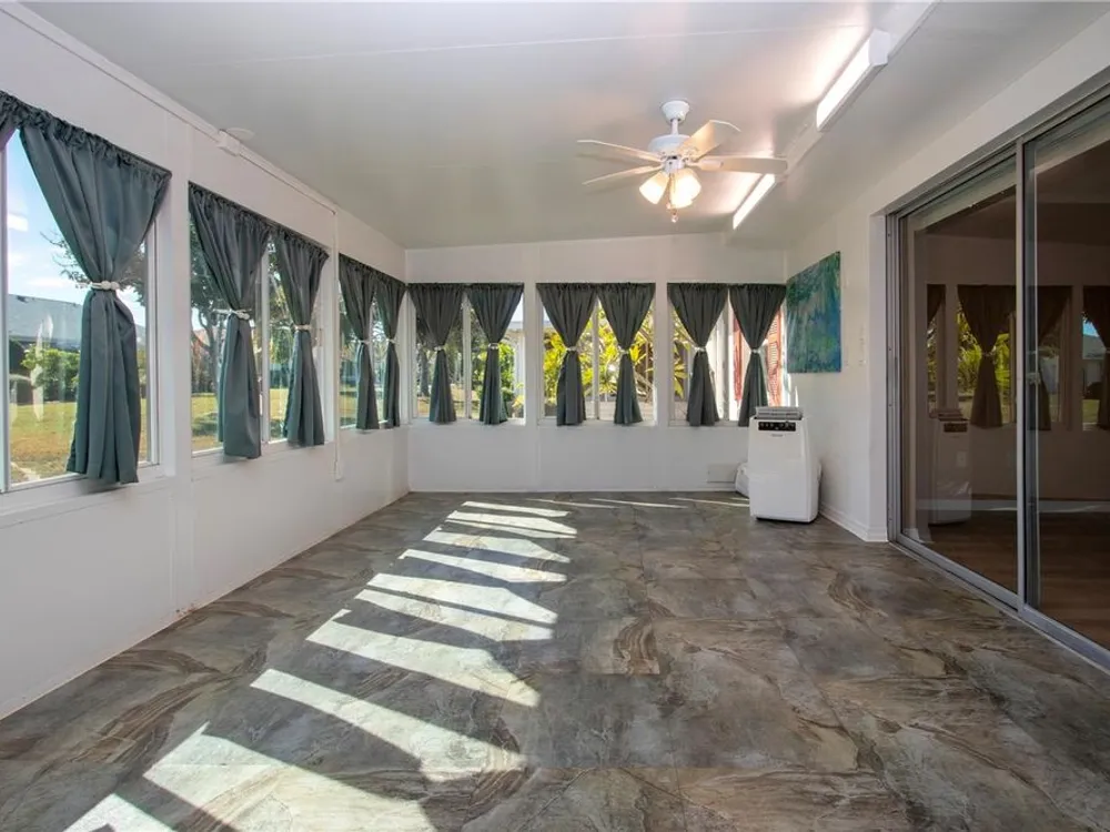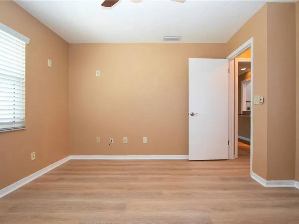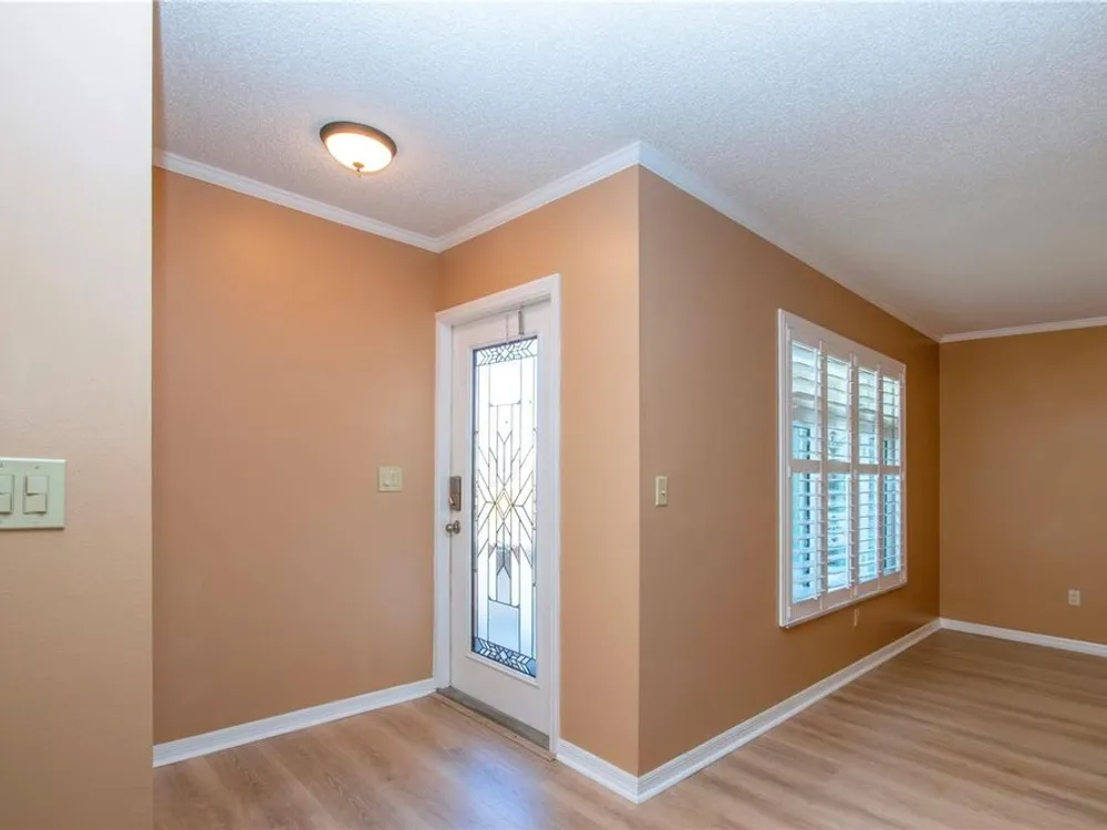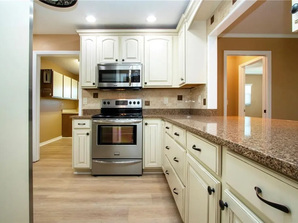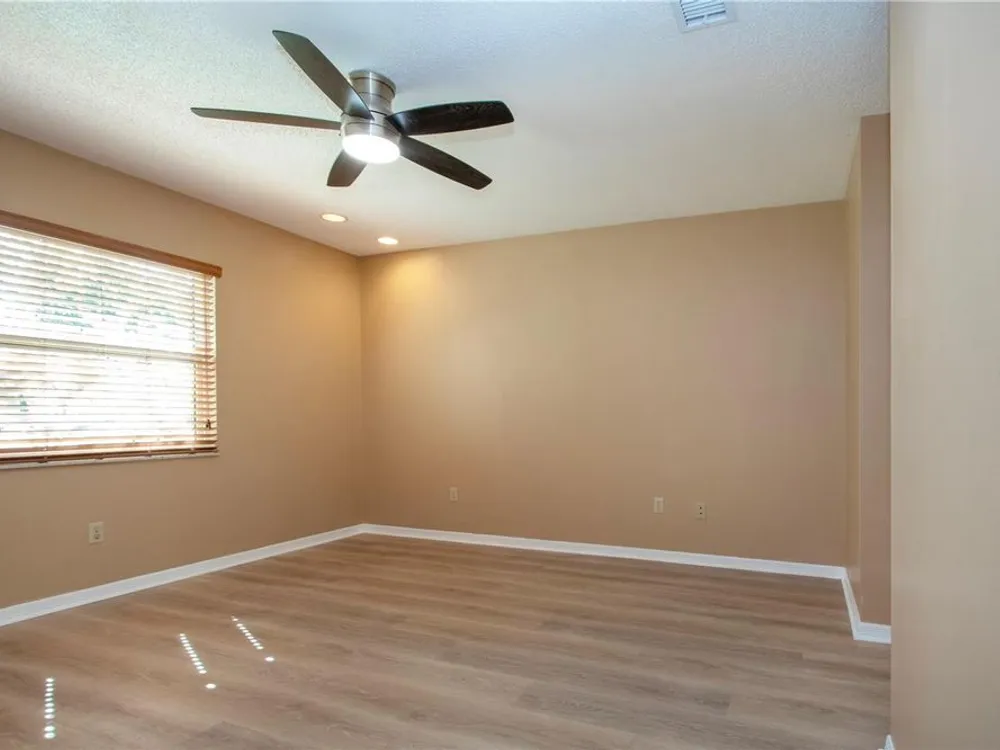 - Ceiling Fan(s), Crown Molding, Living/Dining Room, Open Floorplan, Split Bedrooms, Stone Counters, Thermostat, Window Treatments