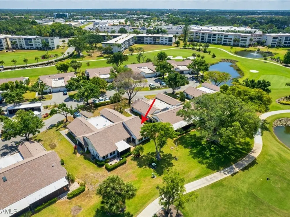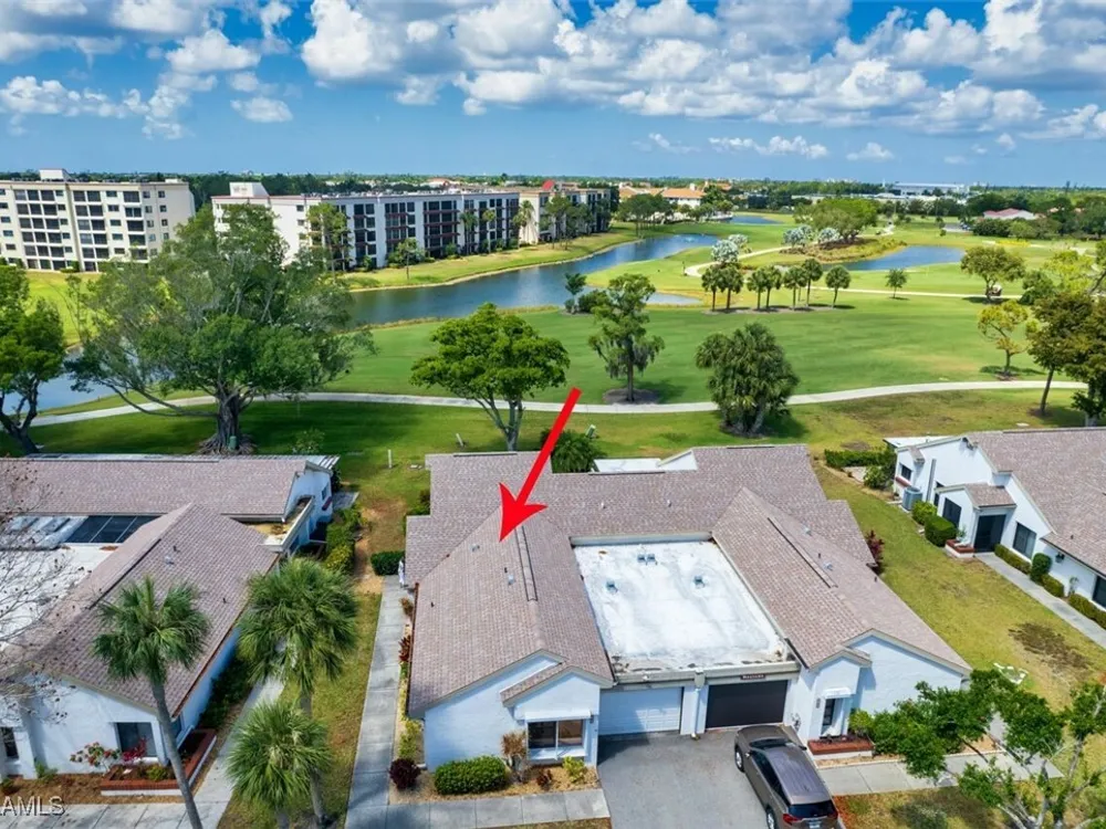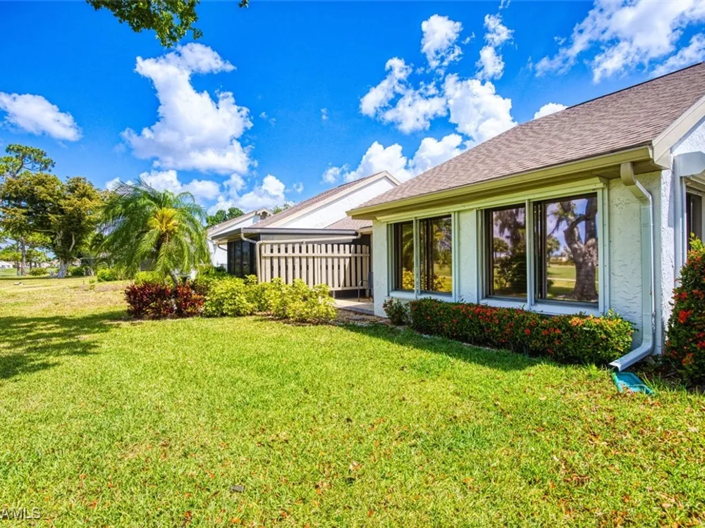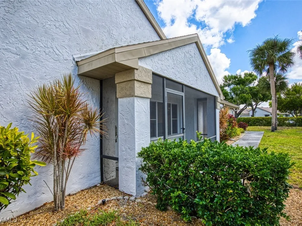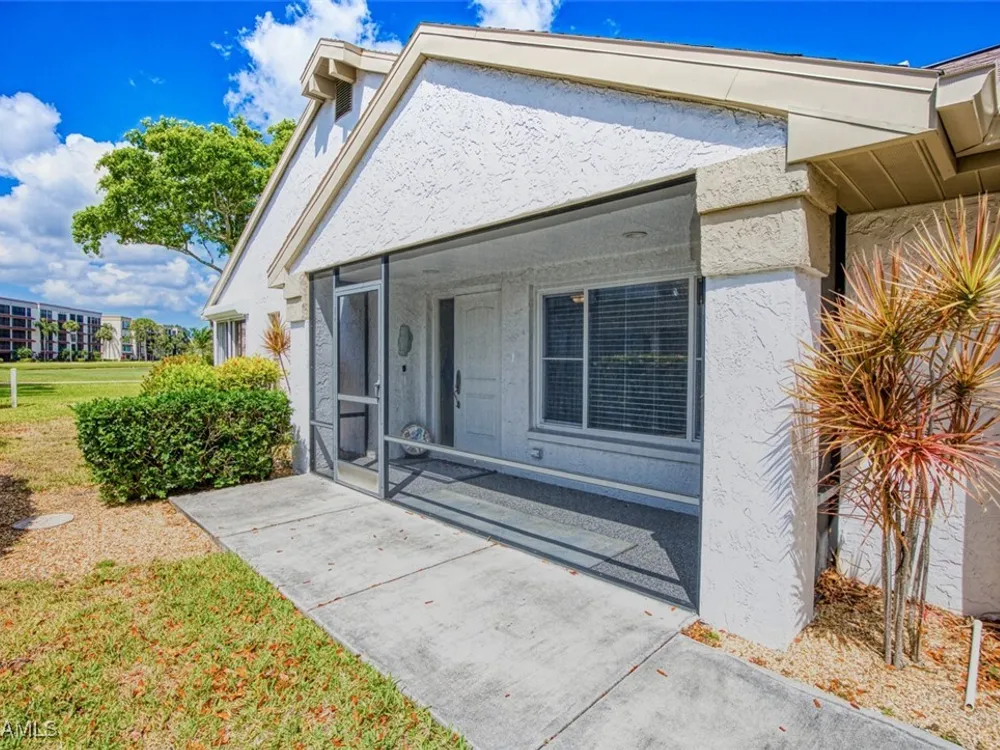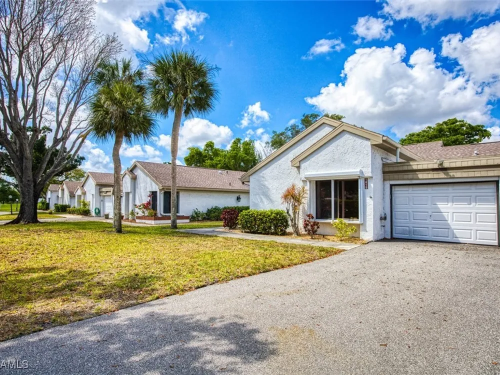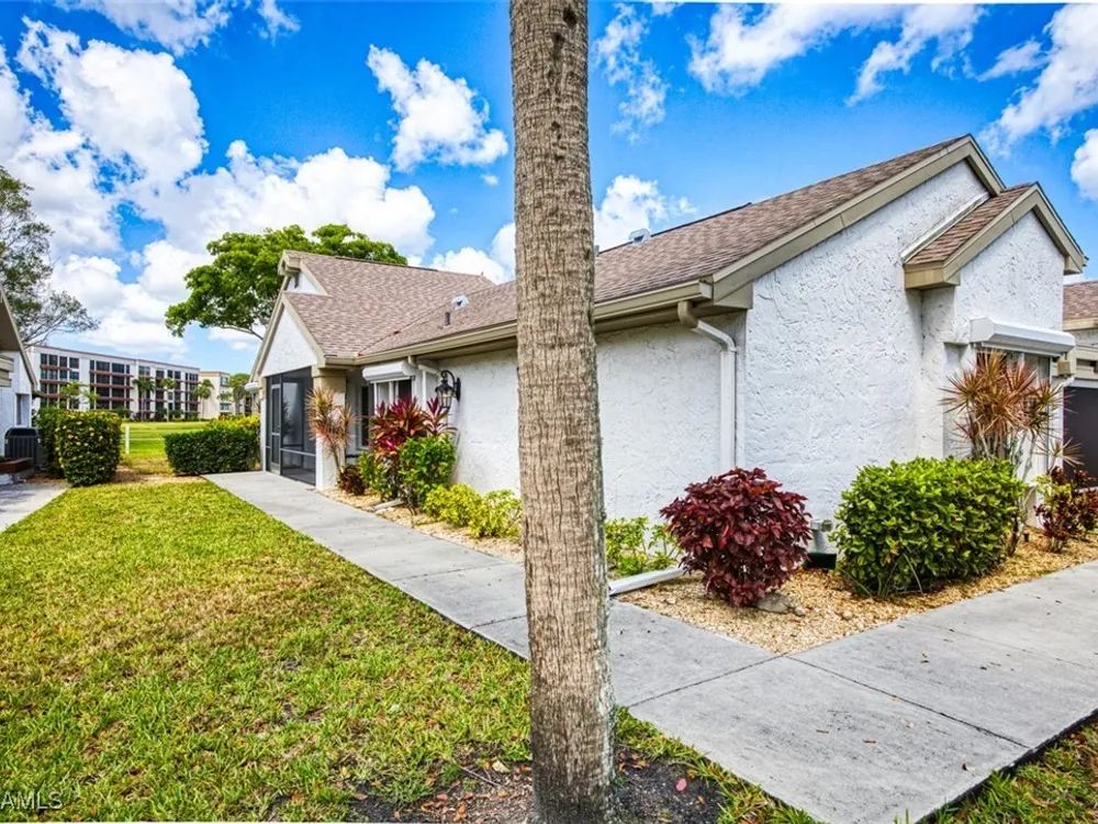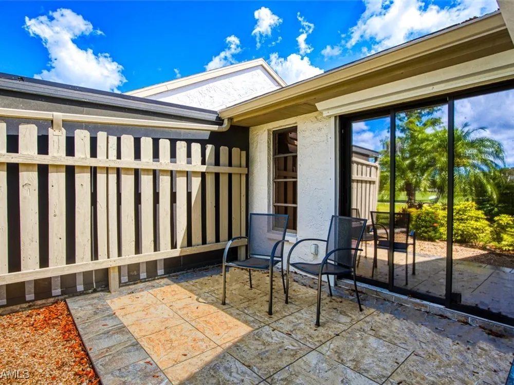 Welcome to resort style living at its finest. This stunning 2 bedroom 2.5 bath Valencia model Garden Villa situated on the 9th fairway gives you plenty of living space with just under 1600 sq ft. A private screened sitting area leads you to an entry foyer with diagonal tile through out main living area. Large eat in kitchen with granite counter tops, luxury vinyl flooring tiled back splash and recessed lighting. Oversized living room with separate sitting area to enjoy your morning coffee or a peaceful sunset. Sliders from living room and owners suite to a private patio area. Main bedroom boasts tiled walk in shower, raised vanity and plenty of closet space. Guest room is located far enough away for your guests privacy with their own bathroom and large walk in closet. Half bath is a bonus in this model as both owners and guests have complete privacy when entertaining. Impact window (kitchen) as well as manual shutters for added peace of mind. Electric garage screen, front load washer and dryer, AC unit 2018, New roof 2023, UNIT BEING SOLD TURNKEY. Seven Lakes a true bundled 55+ active golf and tennis community with no transfer, green or trail fees- giving you unlimited golf on the 18 hole executive course. 6 heated pools throughout community, tennis pavilion, pickle ball, bocce, on site restaurant with no minimum, auditorium for many socials and dances, movies and concerts, on site golf pro, fitness center, wood shop, billiards, full service Lifestyle department to keep you up to date on all the activities in the community as well as bus trips. Enjoy, trivia, karaoke, bingo, art classes, card games, lapidary, line dances and many clubs to keep you social. Centrally located across from Bell Tower Shops, restaurants, shopping. Minutes to Barbara B Mann Theater, Lakes Park, RSW Airport and beaches. Pet friendly community 1 pet under 25 lbs- Monthly condo fees includes all excluding electric. A tour of the community is well worth your time.