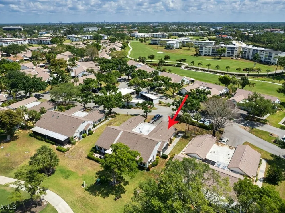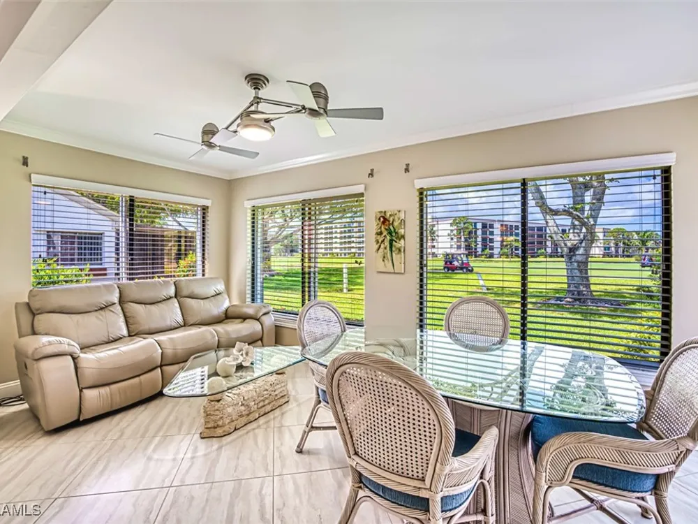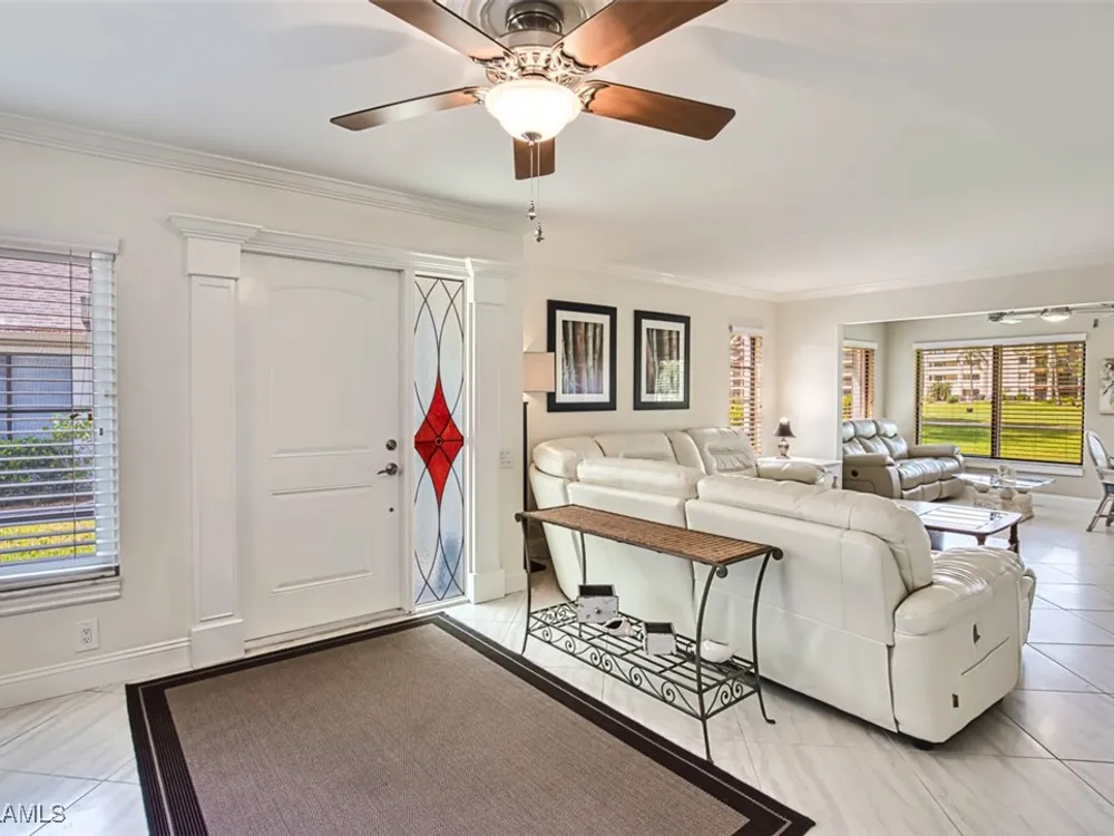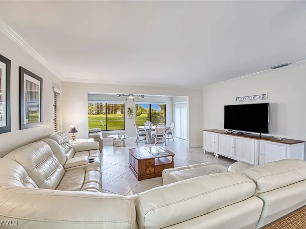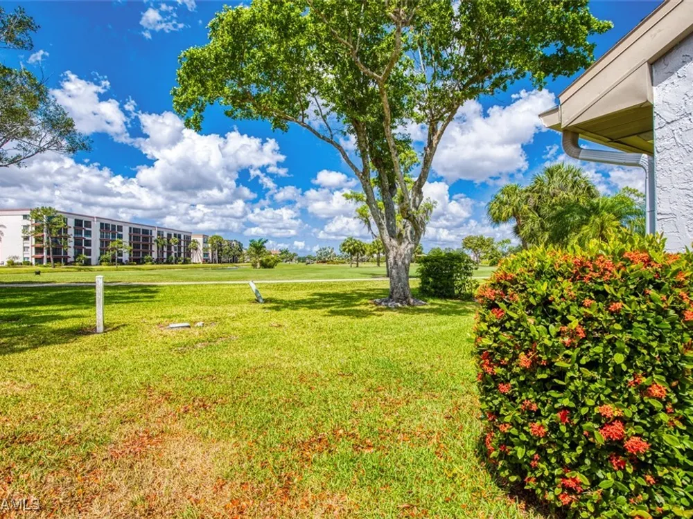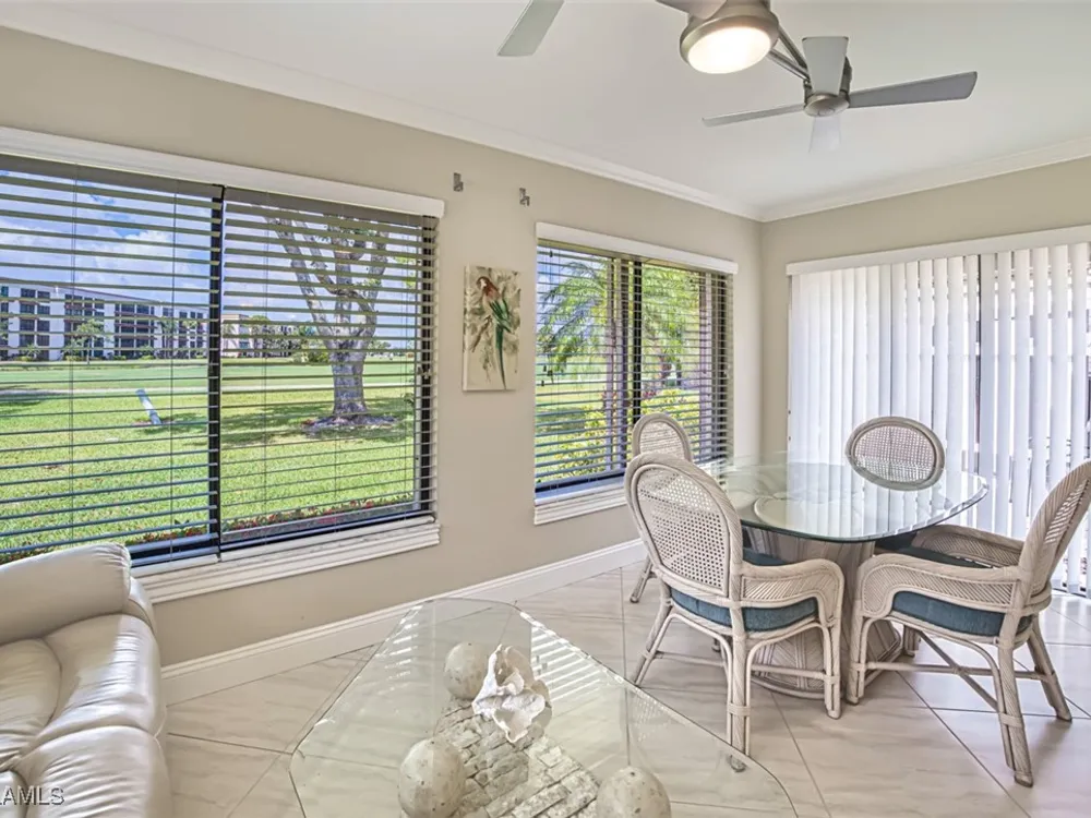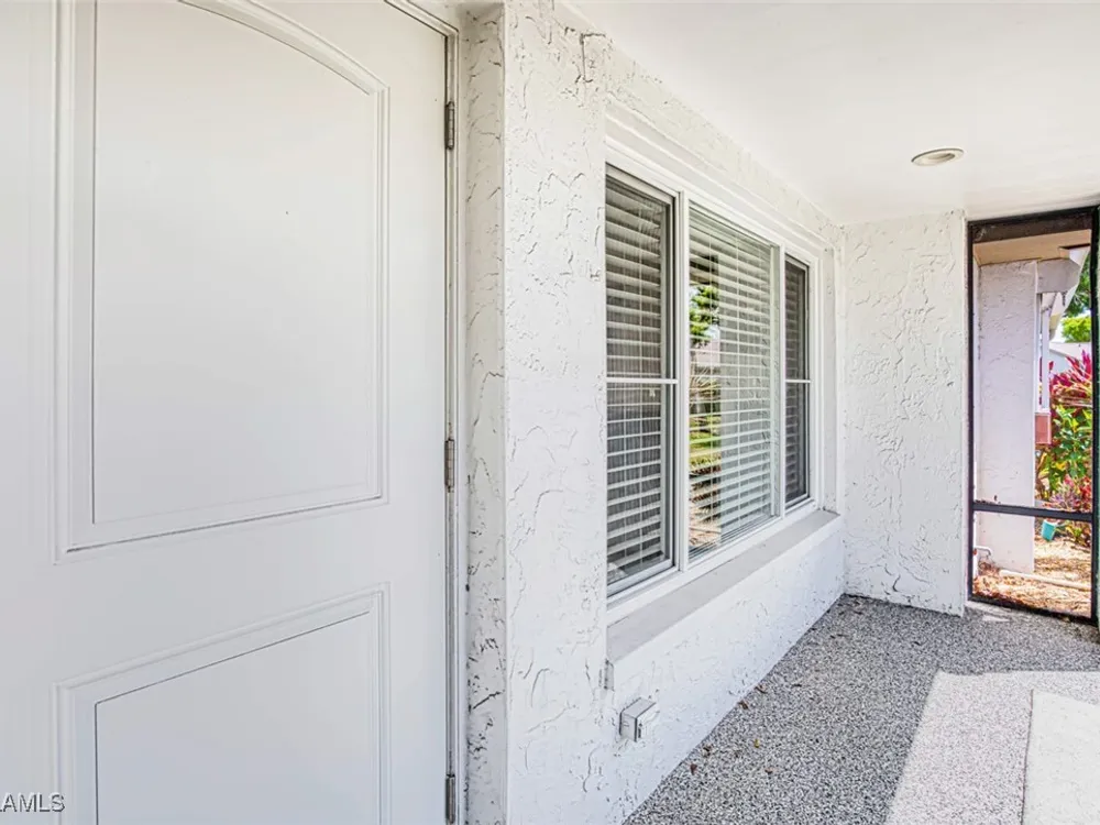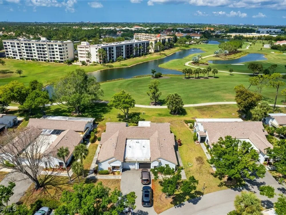 Welcome to resort style living at its finest. This stunning 2 bedroom 2.5 bath Valencia model Garden Villa situated on the 9th fairway gives you plenty of living space with just under 1600 sq ft. A private screened sitting area leads you to an entry foyer with diagonal tile through out main living area. Large eat in kitchen with granite counter tops, luxury vinyl flooring tiled back splash and recessed lighting. Oversized living room with separate sitting area to enjoy your morning coffee or a peaceful sunset. Sliders from living room and owners suite to a private patio area. Main bedroom boasts tiled walk in shower, raised vanity and plenty of closet space. Guest room is located far enough away for your guests privacy with their own bathroom and large walk in closet. Half bath is a bonus in this model as both owners and guests have complete privacy when entertaining. Impact window (kitchen) as well as manual shutters for added peace of mind. Electric garage screen, front load washer and dryer, AC unit 2018, New roof 2023, UNIT BEING SOLD TURNKEY. Seven Lakes a true bundled 55+ active golf and tennis community with no transfer, green or trail fees- giving you unlimited golf on the 18 hole executive course. 6 heated pools throughout community, tennis pavilion, pickle ball, bocce, on site restaurant with no minimum, auditorium for many socials and dances, movies and concerts, on site golf pro, fitness center, wood shop, billiards, full service Lifestyle department to keep you up to date on all the activities in the community as well as bus trips. Enjoy, trivia, karaoke, bingo, art classes, card games, lapidary, line dances and many clubs to keep you social. Centrally located across from Bell Tower Shops, restaurants, shopping. Minutes to Barbara B Mann Theater, Lakes Park, RSW Airport and beaches. Pet friendly community 1 pet under 25 lbs- Monthly condo fees includes all excluding electric. A tour of the community is well worth your time.