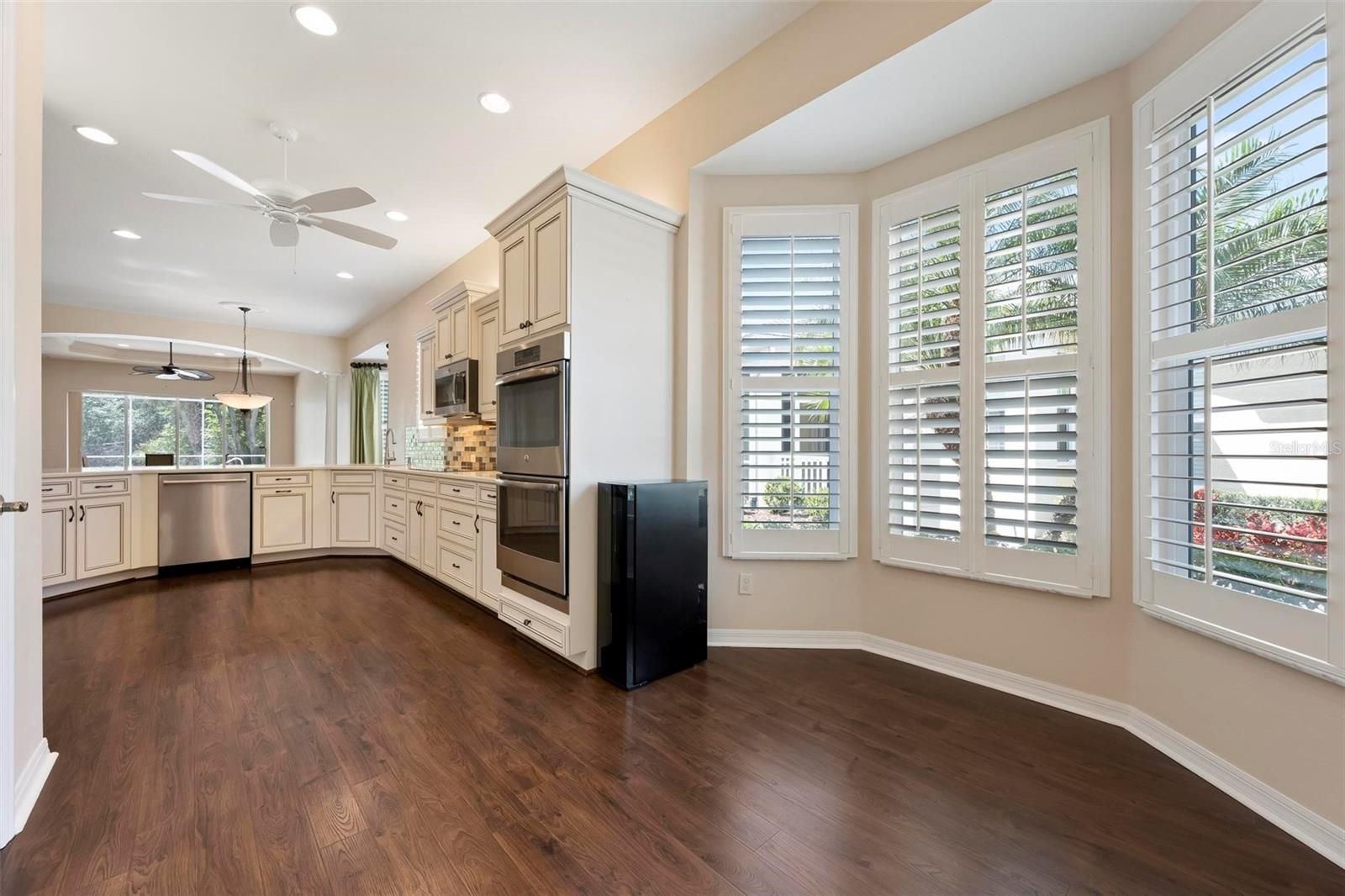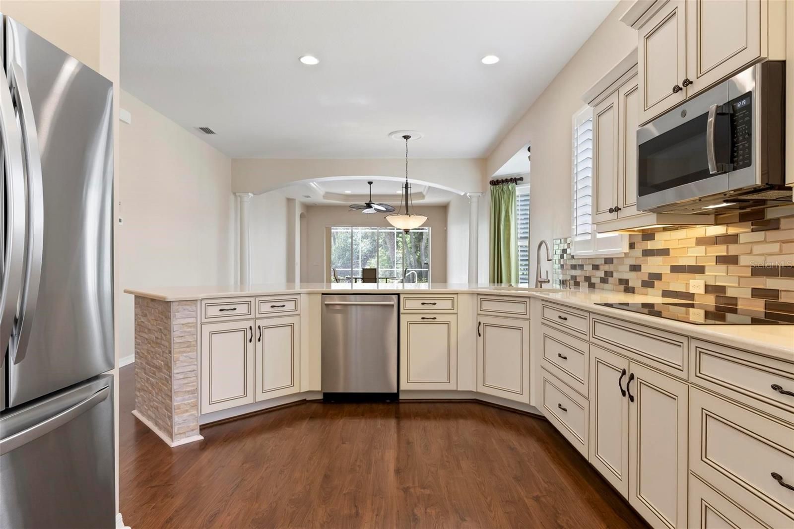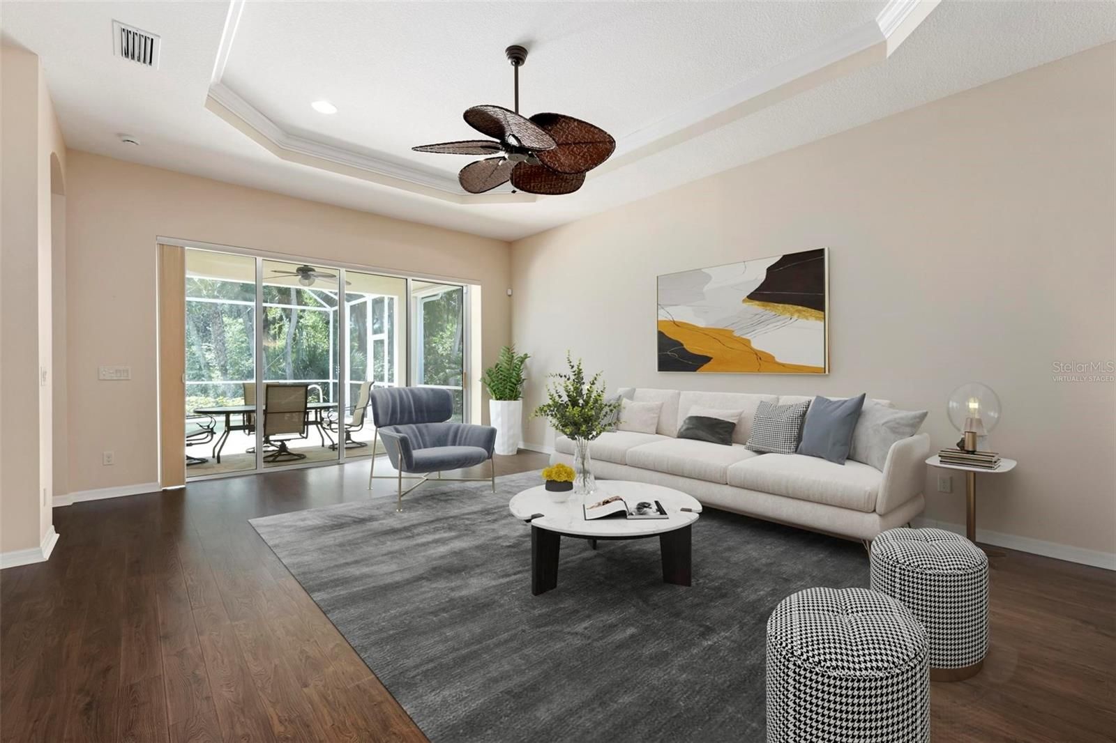 One or more photo(s) has been virtually staged. Best-value pool home in Plantation Golf & Country Club—newer construction, maintenance-free living, and a private cul-de-sac location. Built in 2014 and impeccably maintained, this residence in St. Andrews East offers the rare combination of modern design, privacy, and worry-free ownership. The association covers lawn care, exterior painting, roof maintenance and replacement, and insurance, providing predictable costs and true lock-and-leave convenience. Inside, the sunlit open floor plan with desirable southern exposure creates bright living spaces ideal for everyday comfort and entertaining. The great room features tray ceilings, crown molding, plantation shutters, 8-foot doors, and pocketing sliding glass doors that open seamlessly to the lanai. The chef’s kitchen is designed for both beauty and function with quartz countertops, soft-close cabinetry, glass tile backsplash, under-cabinet lighting, granite sink, multiple drawer banks, and premium appliances including a double wall oven, induction cooktop, and wine refrigerator. Step outside to your private lanai and heated saltwater pool, surrounded by lush tropical landscaping—an ideal setting for relaxing or hosting guests. Additional highlights include IMPACT WINDOWS, storm shutters, a finished garage, and a NEW AC SYSTEM installed in 2025 for modern efficiency and peace of mind. Optional membership at Plantation Golf & Country Club offers championship golf, tennis, pickleball, a resort-style pool, fitness center, dining, and a vibrant social calendar. Conveniently located just minutes from downtown Venice, the beaches of Venice, and the dining and entertainment of downtown Wellen Park.