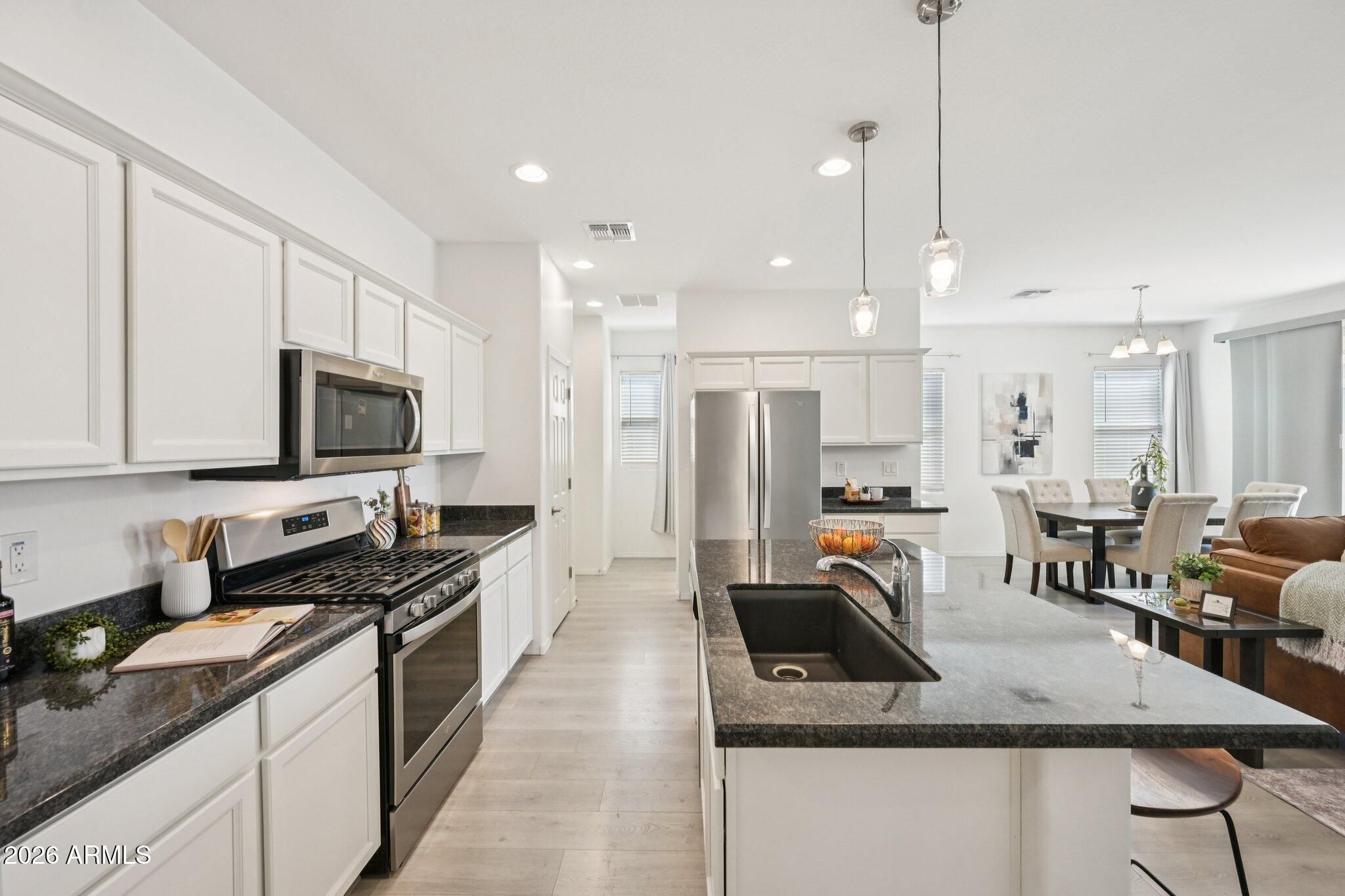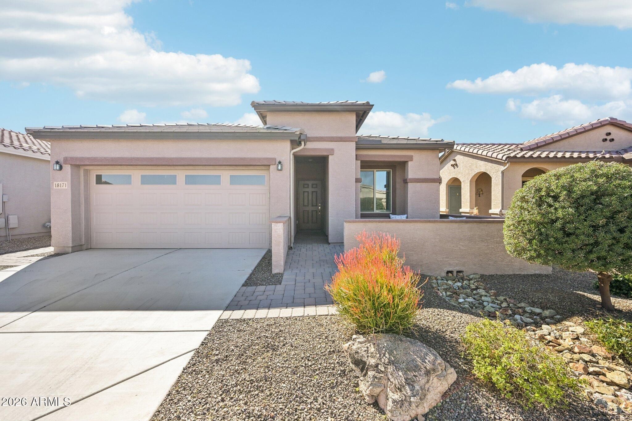 Professionally staged and strategically priced, this home is one of the most compelling opportunities in this 55+ community. The open layout lives larger than expected with luxury plank flooring, a bright white shaker kitchen featuring granite, gas, SS appliances, island, upgraded composite sink and pendant lighting. The primary suite includes a bay window sitting area, dual vanities, walk-in shower, Tile floors, a generous closet. Epoxy garage floors, soft water loop, extended paver patio and walkway, gas BBQ stub, view fencing and front courtyard with mountain views complete the package. CantaMia delivers the lifestyle buyers seek with the clubhouse, lake, dining, fitness center, art studio, spa services, pools, pickleball, billiards, walking and biking trails & a vibrant social calendar
