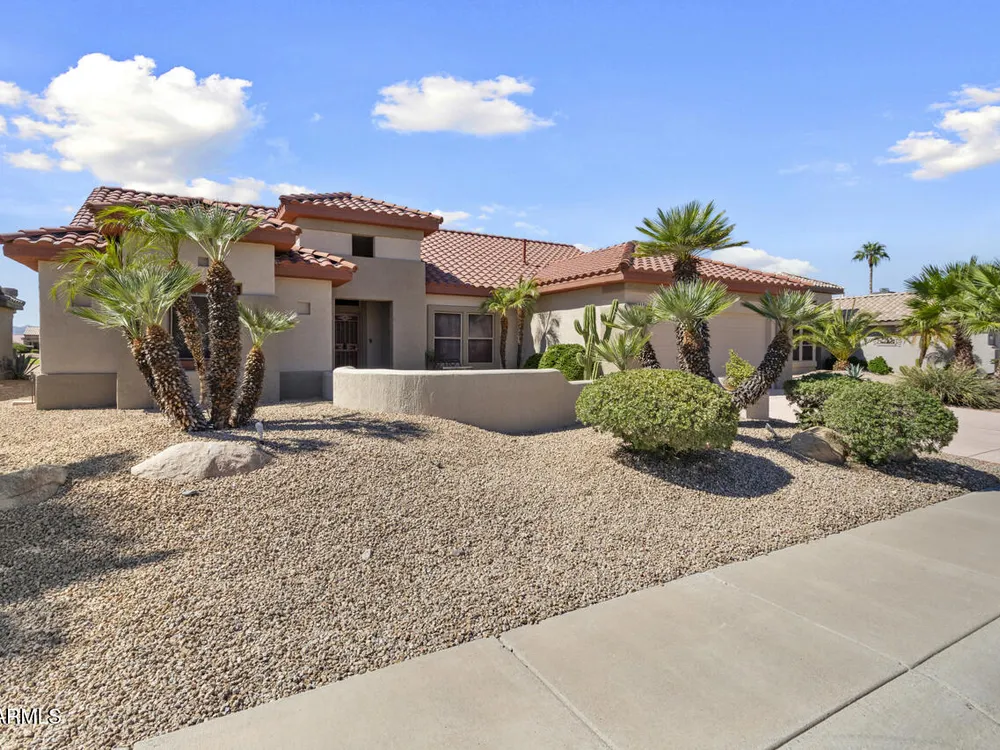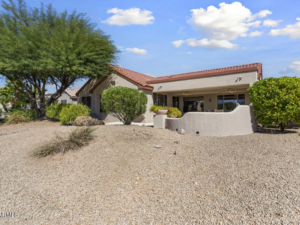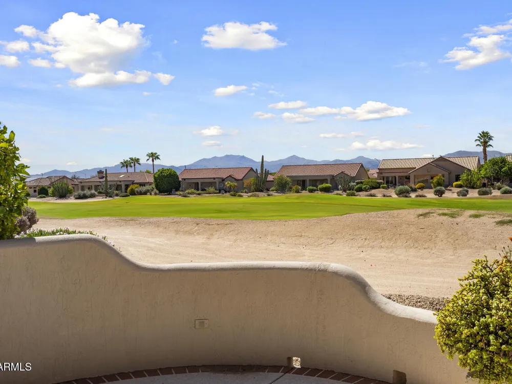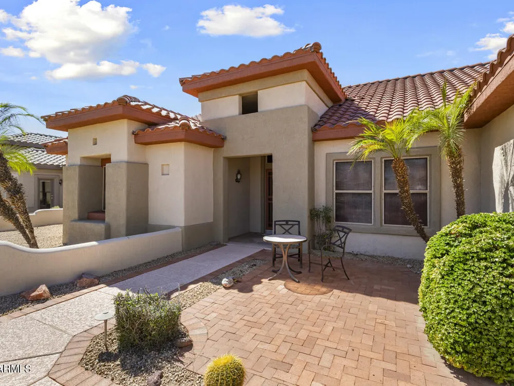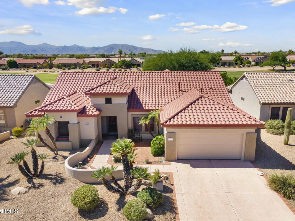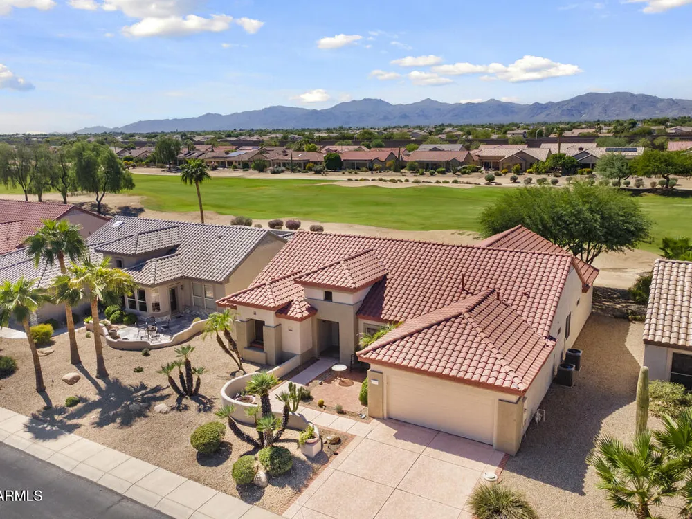 Beautiful Stonecrest on Granite Falls Golf Course with sweeping 180° fairway, mountain & sunset views! Enter through the charming front courtyard and step into a home loaded with updates: 2024 refrigerator & water heater, 2023 patio roof extension, 2022 roof, HVAC, garage door/opener, washer/dryer. Inside, enjoy new retiled floors, raised panel doors, a cozy fireplace, and a beautifully remodeled master bath with walk-in shower. Kitchen features newer dishwasher and plenty of storage. Laundry includes cabinets & sink. Outdoors, relax on the extended covered patio with NEW upgraded gas BBQ, knee wall, water feature, and fresh exterior paint. E/W exposure + extended garage with storage complete this move-in ready retreat. Perfect for entertaining or soaking in those Arizona sunsets!
