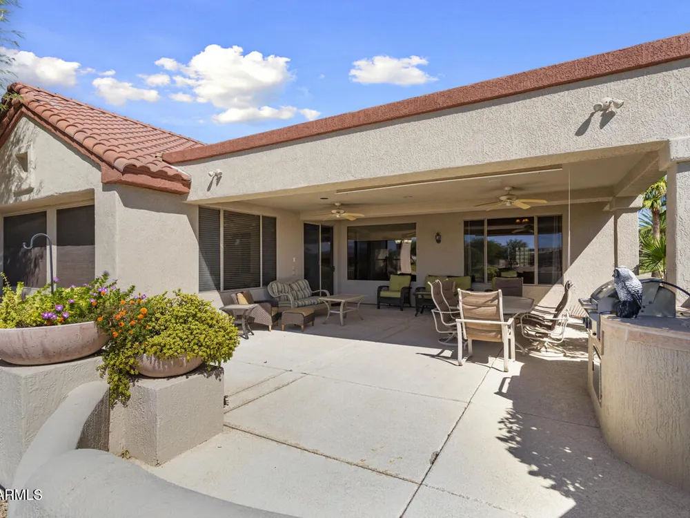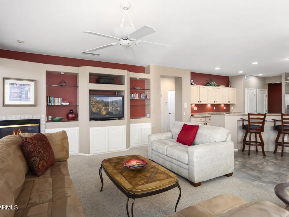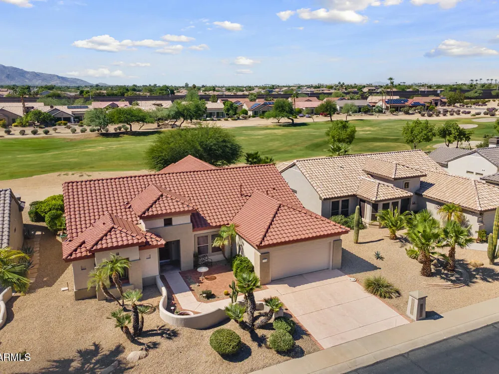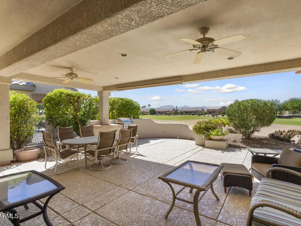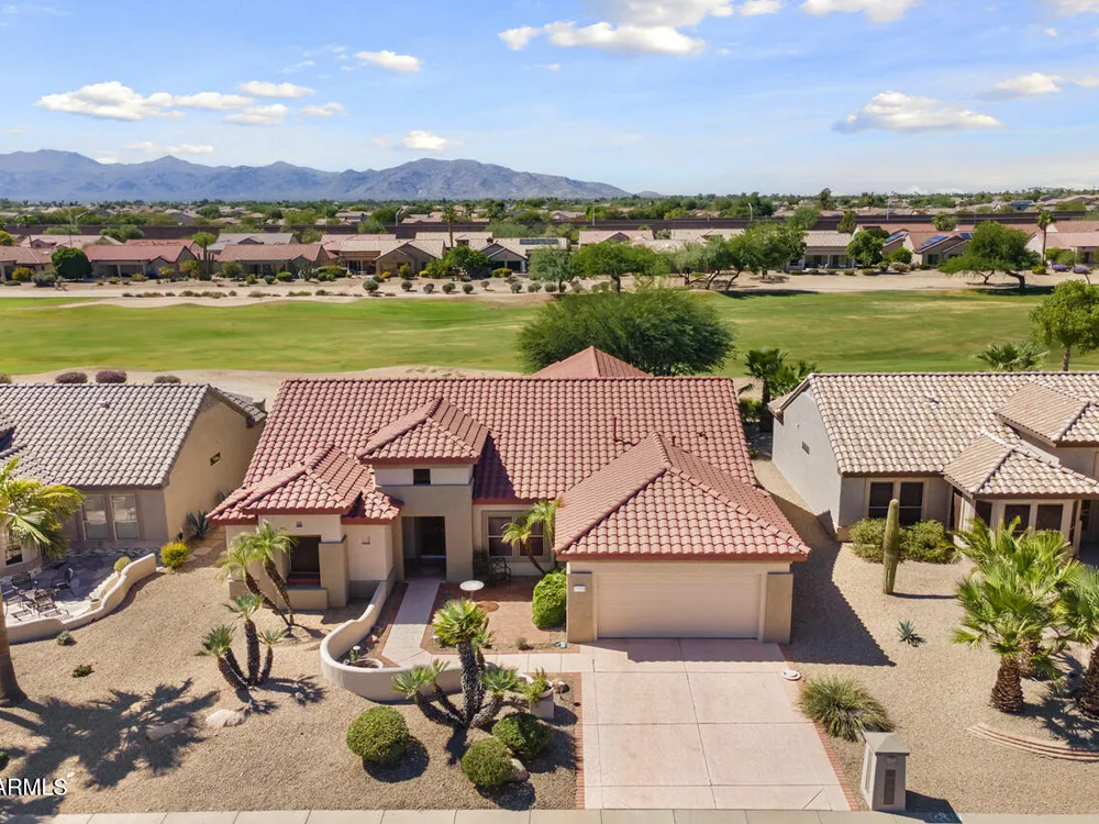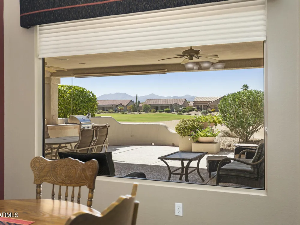 Beautiful Stonecrest on Granite Falls Golf Course with sweeping 180° fairway, mountain & sunset views! Enter through the charming front courtyard and step into a home loaded with updates: 2024 refrigerator & water heater, 2023 patio roof extension, 2022 roof, HVAC, garage door/opener, washer/dryer. Inside, enjoy new retiled floors, raised panel doors, a cozy fireplace, and a beautifully remodeled master bath with walk-in shower. Kitchen features newer dishwasher and plenty of storage. Laundry includes cabinets & sink. Outdoors, relax on the extended covered patio with NEW upgraded gas BBQ, knee wall, water feature, and fresh exterior paint. E/W exposure + extended garage with storage complete this move-in ready retreat. Perfect for entertaining or soaking in those Arizona sunsets!